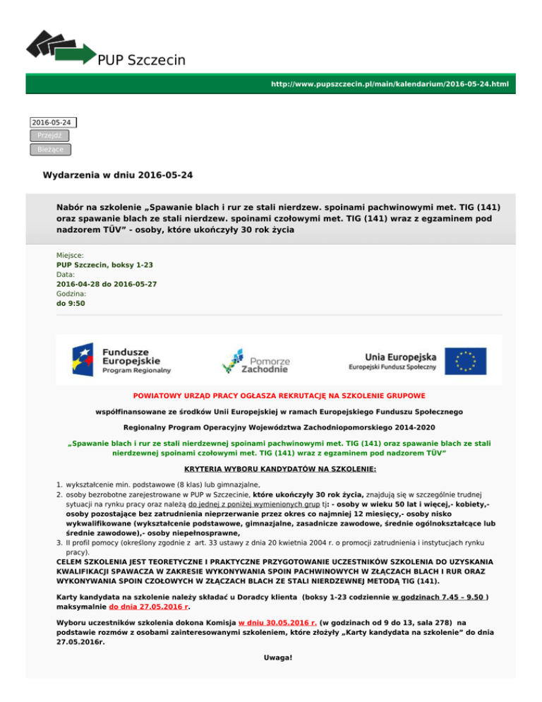 PUP Szczecin http://www.pupszczecin.pl/main/kalendarium/2016-05-24.html Wybierz dzień: 2016-05-24 Przejdź Bieżące Wydarzenia w dniu 2016-05-24 Nabór na szkolenie „Spawanie blach i rur ze stali nierdzew. spoinami pachwinowymi met. TIG (141) oraz spawanie blach ze stali nierdzew. spoinami czołowymi met. TIG (141) wraz z egzaminem pod nadzorem TÜV” - osoby, które ukończyły 30 rok życia Miejsce: PUP Szczecin, boksy 1-23 Data: 2016-04-28 do 2016-05-27 Godzina: do 9:50 POWIATOWY URZĄD PRACY OGŁASZA REKRUTACJĘ NA SZKOLENIE GRUPOWE współfinansowane ze środków Unii Europejskiej w ramach Europejskiego Funduszu Społecznego Regionalny Program Operacyjny Województwa Zachodniopomorskiego 2014-2020 „Spawanie blach i rur ze stali nierdzewnej spoinami pachwinowymi met. TIG (141) oraz spawanie blach ze stali nierdzewnej spoinami czołowymi met. TIG (141) wraz z egzaminem pod nadzorem TÜV” KRYTERIA WYBORU KANDYDATÓW NA SZKOLENIE: 1. wykształcenie min. podstawowe (8 klas) lub gimnazjalne, 2. osoby bezrobotne zarejestrowane w PUP w Szczecinie, które ukończyły 30 rok życia, znajdują się w szczególnie trudnej sytuacji na rynku pracy oraz należą do jednej z poniżej wymienionych grup tj: - osoby w wieku 50 lat i więcej,- kobiety,osoby pozostające bez zatrudnienia nieprzerwanie przez okres co najmniej 12 miesięcy,- osoby nisko wykwalifikowane (wykształcenie podstawowe, gimnazjalne, zasadnicze zawodowe, średnie ogólnokształcące lub średnie zawodowe),- osoby niepełnosprawne, 3. II profil pomocy (określony zgodnie z art. 33 ustawy z dnia 20 kwietnia 2004 r. o promocji zatrudnienia i instytucjach rynku pracy). CELEM SZKOLENIA JEST TEORETYCZNE I PRAKTYCZNE PRZYGOTOWANIE UCZESTNIKÓW SZKOLENIA DO UZYSKANIA KWALIFIKACJI SPAWACZA W ZAKRESIE WYKONYWANIA SPOIN PACHWINOWYCH W ZŁĄCZACH BLACH I RUR ORAZ WYKONYWANIA SPOIN CZOŁOWYCH W ZŁĄCZACH BLACH ZE STALI NIERDZEWNEJ METODĄ TIG (141). Karty kandydata na szkolenie należy składać u Doradcy klienta (boksy 1-23 codziennie w godzinach 7.45 – 9.50 ) maksymalnie do dnia 27.05.2016 r. Wyboru uczestników szkolenia dokona Komisja w dniu 30.05.2016 r. (w godzinach od 9 do 13, sala 278) na podstawie rozmów z osobami zainteresowanymi szkoleniem, które złożyły „Karty kandydata na szkolenie” do dnia 27.05.2016r. Uwaga! 1. Wstępnej weryfikacji kandydata na szkolenie dokonuje Doradca klienta. 2. Pracownicy tut. urzędu nie będą przyjmowali kart kandydata na szkolenie od osób, które nie spełniają kryteriów wyboru kandydatów na szkolenie. Projekt współfinansowany ze środków Unii Europejskiej w ramach Europejskiego Funduszu Społecznego Nabór na szkolenie „Spawanie blach i rur ze stali nierdzewnej spoinami pachwinowymi met. TIG (141) oraz spawanie blach ze stali nierdzewnej spoinami czołowymi met. TIG (141) wraz z egzaminem pod nadzorem TÜV” - osoby do 30 roku życia Miejsce: PUP Szczecin, boksy 1-23 Data: 2016-04-28 do 2016-06-03 Godzina: do 9:50 POWIATOWY URZĄD PRACY OGŁASZA REKRUTACJĘ NA SZKOLENIE GRUPOWE współfinansowane ze środków Unii Europejskiej w ramach Europejskiego Funduszu Społecznego Program Operacyjny Wiedza Edukacja Rozwój 2014-2020 „Spawanie blach i rur ze stali nierdzewnej spoinami pachwinowymi met. TIG (141) oraz spawanie blach ze stali nierdzewnej spoinami czołowymi met. TIG (141) wraz z egzaminem pod nadzorem TÜV” KRYTERIA WYBORU KANDYDATÓW NA SZKOLENIE: 1. 2. 3. 4. Wykształcenie min. podstawowe (8 klas) lub gimnazjalne, Osoby bezrobotne do 25 roku życia zarejestrowane w PUP w Szczecinie do 4 miesięcy, Osoby bezrobotne w wieku 25- 29 lat zarejestrowane w PUP w Szczecinie II profil pomocy (określony zgodnie z art. 33 ustawy z dnia 20 kwietnia 2004 r. o promocji zatrudnienia i instytucjach rynku pracy), 5. Osoby nie uczestniczące w kształceniu i szkoleniu (tzw. młodzież NEET). CELEM SZKOLENIA JEST TEORETYCZNE I PRAKTYCZNE PRZYGOTOWANIE UCZESTNIKÓW SZKOLENIA DO UZYSKANIA KWALIFIKACJI SPAWACZA W ZAKRESIE WYKONYWANIA SPOIN PACHWINOWYCH W ZŁĄCZACH BLACH I RUR ORAZ WYKONYWANIA SPOIN CZOŁOWYCH W ZŁĄCZACH BLACH ZE STALI NIERDZEWNEJ METODĄ TIG (141). Karty kandydata na szkolenie należy składać u Doradcy klienta (boksy 1-23 codziennie w godzinach 7.45 – 9.50 ) maksymalnie do dnia 03.06.2016r. Wyboru uczestników szkolenia dokona Komisja w dniu 06.06.2016r. (w godzinach od 9 do 13, sala 278) na podstawie rozmów z osobami zainteresowanymi szkoleniem, które złożyły „Karty kandydata na szkolenie” do dnia 03.06.2016 r. Uwaga! 1. Wstępnej weryfikacji kandydata na szkolenie dokonuje Doradca klienta. 2. Pracownicy tut. urzędu nie będą przyjmowali kart kandydata na szkolenie od osób, które nie spełniają kryteriów wyboru kandydatów na szkolenie. Projekt realizowany w ramach Inicjatywy na rzecz zatrudnienia ludzi młodych Nabór na szkolenie „Spawanie blach i rur ze stali czarnej spoinami pachwinowymi met. MAG (135) oraz spawanie blach ze stali czarnej spoinami czołowymi met. MAG (135) wraz z egzaminem pod nadzorem TÜV” - osoby do 30 roku życia Miejsce: PUP Szczecin, boksy 1-23 Data: 2016-04-28 do 2016-05-31 Godzina: do 9:50 POWIATOWY URZĄD PRACY OGŁASZA REKRUTACJĘ NA SZKOLENIE GRUPOWE współfinansowane ze środków Unii Europejskiej w ramach Europejskiego Funduszu Społecznego Program Operacyjny Wiedza Edukacja Rozwój 2014-2020 „Spawanie blach i rur ze stali czarnej spoinami pachwinowymi met. MAG (135) oraz spawanie blach ze stali czarnej spoinami czołowymi met. MAG (135) wraz z egzaminem pod nadzorem TÜV” KRYTERIA WYBORU KANDYDATÓW NA SZKOLENIE: 1. 2. 3. 4. Wykształcenie min. podstawowe (8 klas) lub gimnazjalne, Osoby bezrobotne do 25 roku życia zarejestrowane w PUP w Szczecinie do 4 miesięcy, Osoby bezrobotne w wieku 25- 29 lat zarejestrowane w PUP w Szczecinie II profil pomocy (określony zgodnie z art. 33 ustawy z dnia 20 kwietnia 2004 r. o promocji zatrudnienia i instytucjach rynku pracy), 5. Osoby nie uczestniczące w kszt