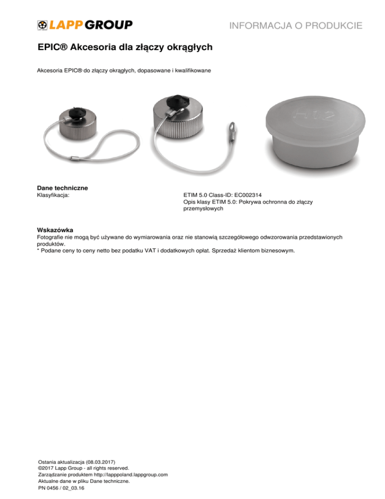 INFORMACJA O PRODUKCIE EPIC® Akcesoria dla złączy okrągłych Akcesoria EPIC® do złączy okrągłych, dopasowane i kwalifikowane Dane techniczne Klasyfikacja: Wskazówka ETIM 5.0 Class-ID: EC002314 Opis klasy ETIM 5.0: Pokrywa ochronna do złączy przemysłowych Fotografie nie mogą być używane do wymiarowania oraz nie stanowią szczegółowego odwzorowania przedstawionych produktów. * Podane ceny to ceny netto bez podatku VAT i dodatkowych opłat. Sprzedaż klientom biznesowym. Ostania aktualizacja (08.03.2017) ©2017 Lapp Group - all rights reserved. Zarządzanie produktem http://lapppoland.lappgroup.com Aktualne dane w pliku Dane techniczne. PN 0456 / 02_03.16 Powered by TCPDF (www.tcpdf.org) Opis produktu Wkłady 75007810 M23-LS1 A, B, F, G: pokrywa zabezpieczająca Pokrywa plastikowa dla A1, B1, B2, F6, F7, G4, G5, G6 75007710 M23 / LS1 D pokrywa zabezpieczająca Pokrywa plastikowa dla D6, A6 75018010 M23 A, B pokrywa zabezpieczająca, na żyłce z końcówką oczkową Pokrywa metalowa dla A1, A3, B1, B2 75018110 M23 A, B pokrywa zabezpieczająca, na żyłce z regulowaną Pokrywa metalowa dla A1, A3, B1, B2 pętlą 75018410 M23 D nakręcana pokrywa zabezpieczająca, na żyłce z pętlą Pokrywa metalowa nakręcana dla D 75018310 LS1 A, G, F pokrywa zabezpieczająca, na żyłce z pętlą Pokrywa metalowa dla A1, A3, F6, F7, G4, G5 55001312 SILVYN ADAPTER M23/M20x1,5 Dla złączy M23 ze zintegrowaną dławnicą kablową 55001310 SILVYN Adapter LS1/M25x1,5 Dla złączy LS1 ze zintegrowaną dławnicą kablową o zakresie dławienia 8.5 - 11 mm, 10.5 - 15.5mm EPIC® Akcesoria dla złączy okrągłych Ostania aktualizacja (08.03.2017) ©2017 Lapp Group - all rights reserved. Zarządzanie produktem http://lapppoland.lappgroup.com Aktualne dane w pliku Dane techniczne. PN 0456 / 02_03.16 Numer katalogowy INFORMACJA O PRODUKCIE Powered by TCPDF (www.tcpdf.org) INFORMACJA O PRODUKCIE EPIC® Akcesoria dla złączy okrągłych Ostania aktualizacja (08.03.2017) ©2017 Lapp Group - all rights reserved. Zarządzanie produktem http://lapppoland.lappgroup.com Aktualne dane w pliku Dane techniczne. PN 0456 / 02_03.16