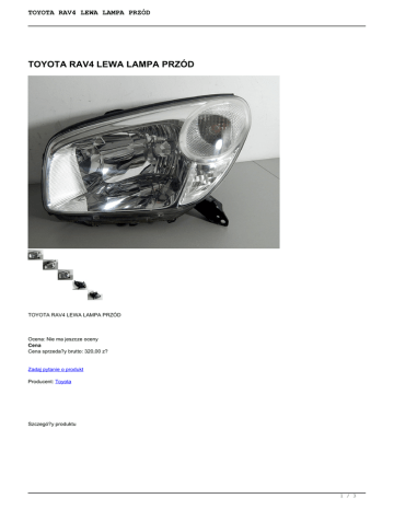 TOYOTA RAV4 LEWA LAMPA PRZÓD TOYOTA RAV4 LEWA LAMPA PRZÓD TOYOTA RAV4 LEWA LAMPA PRZÓD Ocena: Nie ma jeszcze oceny Cena Cena sprzeda?y brutto: 320,00 z? Zadaj pytanie o produkt Producent: Toyota Szczegó?y produktu O NAS Od wielu lat zajmujemy si? skupem i sprzeda?? lamp samochodowych. Posiadamy bogaty asortyment zarówno lamp u?ywanych 1 / 3 TOYOTA RAV4 LEWA LAMPA PRZÓD pochodz?cych z demonta?u, jak i nowych cz??ci. Kupuj?c u nas masz pewno?? i gwarancj? rozruchow? towaru (14 dni od momentu odbioru). Istnieje mo?liwo?? zamówienia cz??ci, gdy? 2 razy w tygodniu realizowana jest nowa dostawa towaru. WYSY?KA Towar wysy?amy w tym samym dniu je?eli zamówienie zostanie z?o?one do godz.13:00 kurierem In Post lub Poczt? Polsk?. Po godz. 13:00 przesy?ka zostanie wys?ana w nast?pnym dniu roboczym. Istnieje mo?liwo?? wysy?ki paczek (forma p?atno?ci): - za pobraniem - przedp?ata na konto Przesy?ka z regu?y dociera na nast?pny dzie? roboczy. Paczki nadawane s? tylko w dni powszednie. Istnieje mo?liwo?? osobistego odbioru reflektorów po wcze?niejszej konsultacji. Maj? Pa?stwo prawo zwrotu zakupionego towaru w ci?gu 14 dni (ustawowo) wraz z dowodem zakupu i formularzem odst?pienia od umowy zawartym na naszej stronie : http://lampy-samochodowe.pl/media/files/Formularz_Odstapienia_OU.pdf bez podania przyczyny. Nie odbieramy przesy?ek za pobraniem. ZAKUP PRZEDMIOTU TOYOTA RAV4 LEWA LAMPA PRZÓD 1. Wybierz produkt i dodaj go do koszyka. 2. Wybierz sposób zap?aty/ odbioru, uzupe?nij dane do wysy?ki 3. Ewentualne sugestie prosz? wpisa? w polu wiadomo??. 4. Oczekuj na kuriera- sprawd? zawarto?? przesy?ki przy odbiorze (wszystkie paczki s? ubezpieczone) . MODEL STRON OPIS STAN CENA /MARK A CZ??CI MAGA A ZYNO WY TOYOT LEWA PRZÓD , 22D-50 320,00 A RAV4 WERSJA PLN EUROPE JSKA, CA?A, O RYGINA? , UCHWY TY CA?E +SILNIC ZEK, ?A RÓWKI, GUMA, O PRAWKI, GOTOW Y DO ZA ?O?ENIA , DO MODELI 2003-05 PARAGON/FAKTURA Do ka?dej zakupionej cz??ci do??czamy paragon . Je?li ?ycz? Pa?stwo sobie faktur?, prosimy o informacj? wraz z danymi niezb?dnymi do jej wystawienia. KONTAKT: 2 / 3 TOYOTA RAV4 LEWA LAMPA PRZÓD Wszelkie zapytania prosimy kierowa? na e-mail: [email protected] Wszystkie przedmioty s? dok?adnie opisane i skatalogowane. Je?li masz dodatkowe pytania prosimy o kontakt pod nr tel.: 798-986-497 GODZINY OTWARCIA: Pracujemy od poniedzia?ku do pi?tku w godz. 8:00- 16:00. STRONA WWW: www.lampy-samochodowe.pl ZAMIENNIKI: Nie kupuj zamienników na innych aukcjach. S? to cz??ci o krótkiej ?ywotno?ci i s?abej jako?ci wykonania. Pos?u?? na zdecydowanie krótszy czas ni? cz??ci oryginalne, mimo, ?e s? nowe. Zakup na naszych aukcjach jest jednoznaczny z akceptacj? regulaminu dost?pnego na naszej stronie. DZI?KUJEMY ZA ZAINTERESOWANIE 3 / 3 Powered by TCPDF (www.tcpdf.org)
