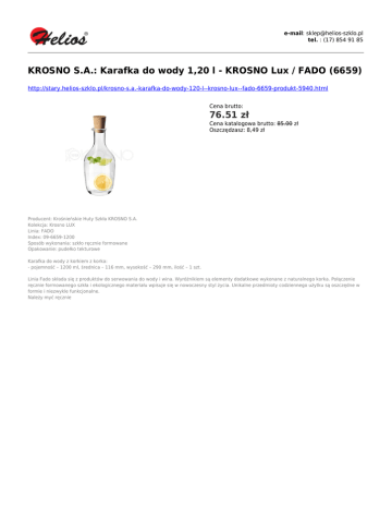 e-mail: [email protected] tel. : (17) 854 91 85 KROSNO S.A.: Karafka do wody 1,20 l - KROSNO Lux / FADO (6659) http://stary.helios-szklo.pl/krosno-s.a.-karafka-do-wody-120-l--krosno-lux--fado-6659-produkt-5940.html Cena brutto: 76.51 zł Cena katalogowa brutto: 85.00 zł Oszczędzasz: 8,49 zł Producent: Krośnieńskie Huty Szkła KROSNO S.A. Kolekcja: Krosno LUX Linia: FADO Index: 09-6659-1200 Sposób wykonania: szkło ręcznie formowane Opakowanie: pudełko tekturowe Karafka do wody z korkiem z korka: - pojemność – 1200 ml, średnica – 116 mm, wysokość – 290 mm, ilość – 1 szt. Linia Fado składa się z produktów do serwowania do wody i wina. Wyróżnikiem są elementy dodatkowe wykonane z naturalnego korka. Połączenie ręcznie formowanego szkła i ekologicznego materiału wpisuje się w nowoczesny styl życia. Unikalne przedmioty codziennego użytku są oszczędne w formie i niezwykle funkcjonalne. Należy myć ręcznie
