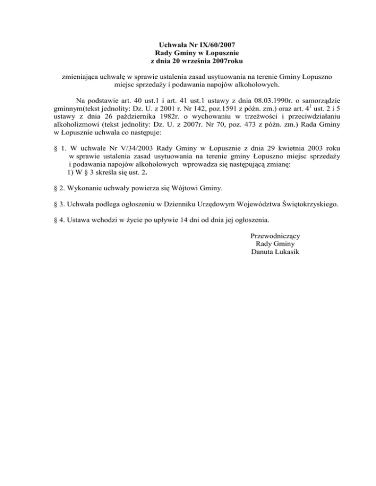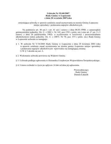 Uchwała Nr IX/60/2007 Rady Gminy w Łopusznie z dnia 20 września 2007roku zmieniająca uchwałę w sprawie ustalenia zasad usytuowania na terenie Gminy Łopuszno miejsc sprzedaŜy i podawania napojów alkoholowych. Na podstawie art. 40 ust.1 i art. 41 ust.1 ustawy z dnia 08.03.1990r. o samorządzie gminnym(tekst jednolity: Dz. U. z 2001 r. Nr 142, poz.1591 z późn. zm.) oraz art. 41 ust. 2 i 5 ustawy z dnia 26 października 1982r. o wychowaniu w trzeźwości i przeciwdziałaniu alkoholizmowi (tekst jednolity: Dz. U. z 2007r. Nr 70, poz. 473 z późn. zm.) Rada Gminy w Łopusznie uchwala co następuje: § 1. W uchwale Nr V/34/2003 Rady Gminy w Łopusznie z dnia 29 kwietnia 2003 roku w sprawie ustalenia zasad usytuowania na terenie gminy Łopuszno miejsc sprzedaŜy i podawania napojów alkoholowych wprowadza się następującą zmianę: 1) W § 3 skreśla się ust. 2. § 2. Wykonanie uchwały powierza się Wójtowi Gminy. § 3. Uchwała podlega ogłoszeniu w Dzienniku Urzędowym Województwa Świętokrzyskiego. § 4. Ustawa wchodzi w Ŝycie po upływie 14 dni od dnia jej ogłoszenia. Przewodniczący Rady Gminy Danuta Łukasik