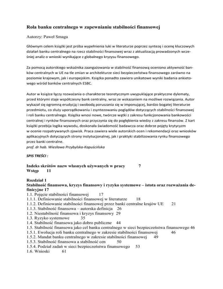Rola banku centralnego w zapewnianiu stabilności finansowej Autorzy: Paweł Smaga Głównym celem książki jest próba wypełnienia luki w literaturze poprzez syntezę i ocenę kluczowych działań banku centralnego na rzecz stabilności finansowej wraz z aktualizacją prowadzonych wcześniej analiz o wnioski wynikające z globalnego kryzysu finansowego. Za pomocą autorskiego wskaźnika zaangażowania w stabilność finansową oceniono aktywność banków centralnych w UE na tle zmian w architekturze sieci bezpieczeństwa finansowego zarówno na poziomie krajowym, jak i europejskim. Książka ponadto zawiera unikatowe wyniki badania ankietowego wśród banków centralnych ESBC. Autor w książce łączy rozważania o charakterze teoretycznym uwypuklające praktyczne dylematy, przed którymi staje współczesny bank centralny, wraz ze wskazaniem na możliwe rozwiązania. Autor wykazał się ogromną erudycją i swobodą poruszania się w imponującej, bardzo bogatej literaturze przedmiotu, co służy uporządkowaniu i zsyntezowaniu poglądów dotyczących stabilności finansowej i roli banku centralnego. Książka wnosi nowe, twórcze wątki z zakresu funkcjonowania bankowości centralnej i rynków finansowych oraz przyczynia się do pogłębienia wiedzy z zakresu finansów. Z kart książki przebija logika wywodu, doskonała świadomość badawcza oraz dobrze pojęty krytycyzm w ocenie rozpatrywanych zjawisk. Praca zawiera wiele autorskich ocen i rekomendacji oraz wniosków aplikacyjnych dotyczących strony instytucjonalnej, jak i praktyki stabilizowania rynku finansowego przez banki centralne. prof. dr hab. Wiesława Przybylska-Kapuścińska SPIS TREŚCI : Indeks skrótów nazw własnych używanych w pracy Wstęp 11 7 Rozdział 1 Stabilność finansowa, kryzys finansowy i ryzyko systemowe – istota oraz rozważania definicyjne 17 1.1. Pojęcie stabilności finansowej 17 1.1.1. Definiowanie stabilności finansowej w literaturze 18 1.1.2. Definiowanie stabilności finansowej przez banki centralne krajów UE 21 1.1.3. Stabilność finansowa – autorska definicja 26 1.2. Niestabilność finansowa i kryzys finansowy 29 1.3. Ryzyko systemowe 35 1.4. Stabilność finansowa jako dobro publiczne 44 1.5. Stabilność finansowa jako cel banku centralnego w sieci bezpieczeństwa finansowego 46 1.5.1. Ewolucja roli banku centralnego w zakresie stabilności finansowej 46 1.5.2. Mandat banku centralnego w zakresie stabilności finansowej 49 1.5.3. Stabilność finansowa a stabilność cen 50 1.5.4. Podział zadań w sieci bezpieczeństwa finansowego 53 1.6. Wnioski 61 Rozdział 2 Uwarunkowania stabilności finansowej 63 2.1. Klasyfikacja czynników warunkujących stabilność finansową 2.2. Globalizacja i liberalizacja 69 2.3. Interakcje między systemem finansowym a sferą realną 73 2.4. Sytuacja na rynku finansowym 77 2.5. Stan finansów publicznych 80 2.6. Systemowo znaczące instytucje 83 2.7. Behawioralne uwarunkowania stabilności finansowej 88 2.8. Wnioski 91 Rozdział 3 Pomiar i analiza stabilności finansowej przez bank centralny 3.1. Zasady analizy stabilności finansowej 93 3.2. Wskaźniki stabilności finansowej 95 3.3. Zagregowane indeksy stabilności finansowej 102 3.4. Testy warunków skrajnych 110 3.5. Podejście sieciowe 117 3.6. Problem uwzględnienia stabilności finansowej w modelowaniu 3.7. Wnioski 127 63 93 122 Rozdział 4 Działania prewencyjne banku centralnego na rzecz stabilności finansowej 129 4.1. Polityka informacyjna 129 4.2. Raport o stabilności finansowej 135 4.3. Nadzór nad systemem płatniczym 139 4.3.1. Istota nadzoru nad systemem płatniczym 139 4.3.2. Typy ryzyka w systemie płatniczym 142 4.3.3. Rodzaje systemów płatności 147 4.3.4. Centralny kontrpartner jako źródło ryzyka systemowego 151 4.3.5. Podejście banku centralnego do analizy systemu płatniczego 154 4.4. Nadzór nad instytucjami finansowymi 159 4.4.1. Ewolucja modeli nadzoru 160 4.4.2. Bank centralny jako nadzorca – argumenty „za” i „przeciw” 164 4.5. Wnioski 173 Rozdział 5 Działania banku centralnego w sytuacji kryzysowej 175 5.1. Stabilność finansowa a polityka pieniężna 175 5.1.1. Podejście banku centralnego do baniek spekulacyjnych 176 5.1.2. Wykorzystanie stóp procentowych do przekłuwania baniek spekulacyjnych 180 5.1.3. Uwzględnianie stabilności finansowej w prowadzeniu polityki pieniężnej 184 5.1.4. Wnioski 186 5.2. Funkcja pożyczkodawcy ostatniej instancji 187 5.2.1. Istota funkcji LOLR 187 5.2.2. Dylematy LOLR 188 5.2.3. Podstawowe zasady LOLR 193 5.2.4. Praktyka LOLR 197 5.2.5. Wnioski 203 5.3. Działania antykryzysowe banków centralnych w latach 2007–2013 – wybrane przykłady 204 5.3.1. Zarządzanie globalnym kryzysem na przykładzie działań Fed, EBC i Banku Anglii 206 5.3.2. Programy typu quantitative easing – próba oceny 213 5.3.3. Wnioski 224 Rozdział 6 Zmiany w unijnej architekturze sieci bezpieczeństwa finansowego – w stronę podejścia makroostrożnościowego 225 6.1. Międzynarodowy wymiar stabilności finansowej 225 6.2. Ponadnarodowa współpraca w zakresie stabilności finansowej 229 6.3. Uregulowanie odpowiedzialności za stabilność finansową w UE 233 6.4. Nadzór makroostrożnościowy 241 6.4.1. Istota nadzoru makroostrożnościowego 242 6.4.2. Narzędzia nadzoru makroostrożnościowego i ich zastosowanie 244 6.4.3. Instytucjonalny wymiar nadzoru makroostrożnościowego 253 6.5. Wnioski 258 Rozdział 7 Badanie stopnia zaangażowania banków centralnych w UE w stabilność finansową 261 7.1. Przegląd dotychczasowych badań 261 7.2. Metoda badawcza 266 7.3. Analiza komponentów wskaźnika 274 7.4. Analiza wskaźnika 295 7.5. Wnioski 303 Podsumowanie 305 Bibliografia 317 I. Pozycje zwarte, artykuły, raporty 317 II. Źródła internetowe 347 III. Pozostałe źródła 348 Aneks 1. Definicje stabilności finansowej przyjęte przez banki centralne UE 27 349 Aneks 2. Porównanie najważniejszych determinant (nie)stabilności fina