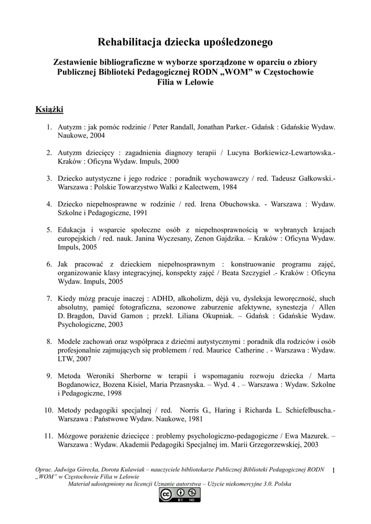 Rehabilitacja dziecka upośledzonego Zestawienie bibliograficzne w wyborze sporządzone w oparciu o zbiory Publicznej Biblioteki Pedagogicznej RODN „WOM” w Częstochowie Filia w Lelowie Książki 1. Autyzm : jak pomóc rodzinie / Peter Randall, Jonathan Parker.- Gdańsk : Gdańskie Wydaw. Naukowe, 2004 2. Autyzm dziecięcy : zagadnienia diagnozy terapii / Lucyna Borkiewicz-Lewartowska.Kraków : Oficyna Wydaw. Impuls, 2000 3. Dziecko autystyczne i jego rodzice : poradnik wychowawczy / red. Tadeusz Gałkowski.Warszawa : Polskie Towarzystwo Walki z Kalectwem, 1984 4. Dziecko niepełnosprawne w rodzinie / red. Irena Obuchowska. - Warszawa : Wydaw. Szkolne i Pedagogiczne, 1991 5. Edukacja i wsparcie społeczne osób z niepełnosprawnością w wybranych krajach europejskich / red. nauk. Janina Wyczesany, Zenon Gajdzika. – Kraków : Oficyna Wydaw. Impuls, 2005 6. Jak pracować z dzieckiem niepełnosprawnym : konstruowanie programu zajęć, organizowanie klasy integracyjnej, konspekty zajęć / Beata Szczygieł .- Kraków : Oficyna Wydaw. Impuls, 2005 7. Kiedy mózg pracuje inaczej : ADHD, alkoholizm, dèjá vu, dysleksja leworęczność, słuch absolutny, pamięć fotograficzna, sezonowe zaburzenie afektywne, synestezja / Allen D. Bragdon, David Gamon ; przekł. Liliana Okupniak. – Gdańsk : Gdańskie Wydaw. Psychologiczne, 2003 8. Modele zachowań oraz współpraca z dziećmi autystycznymi : poradnik dla rodziców i osób profesjonalnie zajmujących się problemem / red. Maurice Catherine . - Warszawa : Wydaw. LTW, 2007 9. Metoda Weroniki Sherborne w terapii i wspomaganiu rozwoju dziecka / Marta Bogdanowicz, Bozena Kisiel, Maria Przasnyska. – Wyd. 4 . – Warszawa : Wydaw. Szkolne i Pedagogiczne, 1998 10. Metody pedagogiki specjalnej / red. Norris G., Haring i Richarda L. Schiefelbuscha.Warszawa : Państwowe Wydaw. Naukowe, 1981 11. Mózgowe porażenie dziecięce : problemy psychologiczno-pedagogiczne / Ewa Mazurek. – Warszawa : Wydaw. Akademii Pedagogiki Specjalnej im. Marii Grzegorzewskiej, 2003 Oprac. Jadwiga Górecka, Dorota Kulawiak – nauczyciele bibliotekarze Publicznej Biblioteki Pedagogicznej RODN „WOM” w Częstochowie Filia w Lelowie Materiał udostępniony na licencji Uznanie autorstwa – Użycie niekomercyjne 3.0. Polska 1 12. Oblicza upośledzenia / Małgorzata Kościelska. – Wyd. 2. – Warszawa : Wydaw. Naukowe PWN, 1998 13. Opieka i wychowanie w rodzinie dziecka upośledzonego w stopniu lekkim / Alicja Korubska. - Bydgoszcz : Wydaw. Uczelniane Akad. Bydgoskiej im Kazimierza Wielkiego, 2000 14. Opowieści terapeutów : autyzm, uszkodzenia organiczne, choroba sieroca, nadpobudliwość, hipochondria, mutyzm, zespół downa, problem ojca / komentuje Hanna Olechnowicz. – Warszawa : Wydaw. Szkolne i Pedagogiczne, 1997 15. Pedagogika Montessori w przedszkolu i szkole / Cristina Wennerström Skald, Mari Smeds Bröderman ; przeł. Ilona Łabędzka – Karlöf. – Wyd. 2. – Kraków : Oficyna Wydaw. 2009 16. Pedagogika specjalna / Janina Doroszewska. - Wrocław-Warszawa-Kraków-Gdańsk : Zakład Narodowy im. Ossolińskich, 1981 17. Podstawy psychoterapii / Stanisław Kratochvil ; przekł. Marcela Czabak, Ewa Matuska. – Poznań : Wydaw. Zysk i S-ka, cop. 2003 18. Pokochaj mnie mamo : czyli dwadzieścia dziewięć kroków do akceptacji niepełnosprawności dziecka / Grażyna Dryżołowska. - Warszawa : Wydaw. Żak, 2008 19. Pomóżmy dziecku z upośledzeniem umysłowym doświadczać przestrzeni : orientacja przestrzenna w teorii, diagnozie i rozwoju dziecka / Joanna Głodkowska. – Warszawa : Wydaw. Wyższej Szkoły Pedagogiki Specjalnej im. Marii Grzegorzewskiej, 2000 20. Poznanie ucznia szkoły specjalnej : wrażliwość edukacyjna dzieci upośledzonych umysłowo w stopniu lekkim: diagnoza i interpretacja / Joanna Głodkowska. - Warszawa : Wydaw. Szkolne i Pedagogiczne, 1999 21. Psychologiczne podstawy rewalidacji upośledzonych umysłowo / Ryszard Kościelak. Warszawa: Państwowe Wydaw. Naukowe, 1989 22. Rozwój daje radość : terapia dzieci upośledzonych umysłowo w stopniu głębokim / red. Jacek Kielina . - Gdańsk : Gdańskie Wydaw. Psychologiczne, 2004 23. Rozwój i funkcjonowanie osób niepełnosprawnych / red. Zenon Gajdzica T. 3. - Kraków : Oficyna Wydaw. Impuls, 2007 24. Różnice indywidualne czy zaburzenia rozwoju dziecka przedszkolnego / Hanna Natowska. – Warszawa : Wydaw. Szkolne i Pedagogiczne, 1980 25. Rysunek w psychoterapii / Gerald D. Oster, Patricka Gould ; przekł. Anna i Magdalena Kacmajor. – Gdańsk : Gdańskie Wydaw. Psychologiczne, 2004 26. Terapie wspomagające rozwój osób z autyzmem / red. Jacek J. Błeszyński. - Kraków : Oficyna Wydaw. Impuls, 2005 Oprac. Jadwiga Górecka, Dorota Kulawiak – nauczyciele bibliotekarze Publicznej Biblioteki Pedagogicznej RODN „WOM” w Częstochowie Filia w Lelowie Materiał udostępniony na licencji Uznanie autorstwa – Użycie niekomercyjne 3.0. Polska 2 27. Upośledzenie umysłowe – pedagogika / red. Kazimierz Kirejczyk.- Warszawa : Państwowe Wydaw. Naukowe, 1981 28. Wielowymiarowość procesu rehabilitacji / red. Jerzy Rottermund T. 2.- Kraków : Oficyna Wydaw. Impuls, 2007 29. Wychowanie resocjalizujące / Czesław Czapow. - Warszawa : Państwowe Wydaw. Naukowe, 1980 30. Wychowanie upośledzonego dziecka w warunkach domowych / Beniamin Spock, Marian Lerrigo. - Warszawa : Państwowe Zakłady Wydaw. Lekarskich, 1969 31. Wybrane aspekty pracy z niepełnosprawnymi / red. Jerzy Rottermund T. 1.- Kraków : Oficyna Wydaw. Impuls, 2006 Artykuły z czasopism 1. Aleksandrowicz Renata : Potrzeby osób wymagających szczególnej pomocy i możliwości ich realizacji w bibliotece szkolnej // Biblioteka w Szkole.- 2004, nr 5, s. 2–5 2. Alicka Maria : Nagrody i kary w wychowaniu dziecka głębiej i lekko upośledzonego // Szkoła Specjalna. – 1996, nr 3, s. 131–137 3. Bach – Żelewski Cezary : Elementy kinezjologii edukacyjnej Paula Dennisona na lekcjach języka polskiego uczniów upośl