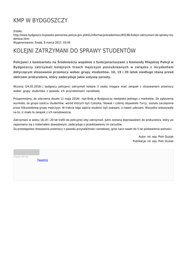 KMP W BYDGOSZCZY Źródło: http://www.bydgoszcz.kujawsko-pomorska.policja.gov.pl/kb1/informacje/wiadomosci/65196,Kolejni-zatrzymani-do-sprawy-stu dentow.html Wygenerowano: Środa, 8 marca 2017, 03:45 KOLEJNI ZATRZYMANI DO SPRAWY STUDENTÓW Policjanci z komisariatu na Śródmieściu wspólnie z funkcjonariuszami z Komendy Miejskiej Policji w Bydgoszczy zatrzymali kolejnych trzech mężczyzn poszukiwanych w związku z incydentem dotyczącym stosowania przemocy wobec grupy studentów. 18, 19 i 20 latek niedługo staną przed obliczem prokuratora, który zadecyduje jakie usłyszą zarzuty. Wczoraj (24.05.2016r.) bydgoscy policjanci zatrzymali kolejne 3 osoby mogące mieć związek z stosowaniem przemocy wobec grupy studentów z powodu ich przynależności narodowej. Przypomnijmy, do zdarzenia doszło 11 maja 2016r. nad Brdą w Bydgoszczy niedaleko jednego z marketów. Ze zgłoszenia wynikało, że grupa sześciu studentów, wśród których byli Czeszka, Słowak i czterej obywatele Turcji, została zaczepiona przez kilkuosobową grupę mężczyzn. W trakcie tego zajścia studenci byli szarpani, a nawet uderzani. Wszystko wskazywało na to, iż miało to związek z ich narodowością. Zatrzymani w wieku 18,19 i 20 lat trafili do policyjnej izby zatrzymań. Jutro zostaną doprowadzeni do prokuratora, który po zapoznaniu się z materiałem dowodowym, zadecyduje o przedstawieniu im zarzutów. Za przestępstwo stosowania przemocy z powodu przynależności narodowej, grozi kara nawet do 5 lat pozbawienia wolności. Autor: mł. asp. Piotr Duziak Publikacja: mł. asp. Piotr Duziak Ocena: 0/5 (0) Tweetnij