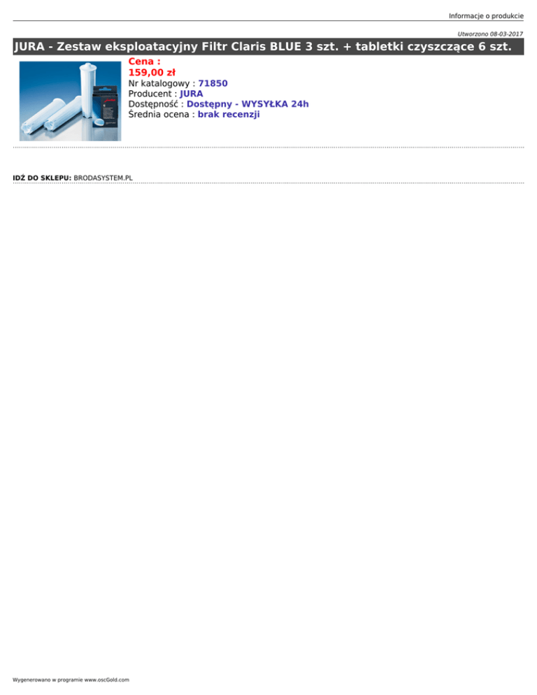 Informacje o produkcie Utworzono 08-03-2017 JURA - Zestaw eksploatacyjny Filtr Claris BLUE 3 szt. + tabletki czyszczące 6 szt. Cena : 159,00 zł Nr katalogowy : 71850 Producent : JURA Dostępność : Dostępny - WYSYŁKA 24h Średnia ocena : brak recenzji IDŹ DO SKLEPU: BRODASYSTEM.PL Wygenerowano w programie www.oscGold.com