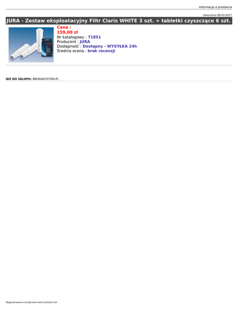 Informacje o produkcie Utworzono 08-03-2017 JURA - Zestaw eksploatacyjny Filtr Claris WHITE 3 szt. + tabletki czyszczące 6 szt. Cena : 159,00 zł Nr katalogowy : 71851 Producent : JURA Dostępność : Dostępny - WYSYŁKA 24h Średnia ocena : brak recenzji IDŹ DO SKLEPU: BRODASYSTEM.PL Wygenerowano w programie www.oscGold.com