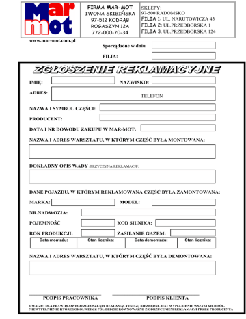 FIRMA MAR-MOT IWONA SKIBIŃSKA 97-512 KODRĄB ROGASZYN 12A 772-000-70-34 SKLEPY: 97-500 RADOMSKO FILIA 1: UL. NARUTOWICZA 43 FILIA 2: UL.PRZEDBORSKA 1 FILIA 3: UL.PRZEDBORSKA 124 www.mar-mot.com.pl Sporządzone w dniu FILIA: IMIĘ: NAZWISKO: ADRES:. TELEFON NAZWA I SYMBOL CZĘŚCI: PRODUCENT: DATA I NR DOWODU ZAKUPU W MAR-MOT: NAZWA I ADRES WARSZTATU, W KTÓRYM CZĘŚĆ BYŁA MONTOWANA: DOKŁADNY OPIS WADY /PRZYCZYNA REKLAMACJI/: DANE POJAZDU, W KTÓRYM REKLAMOWANA CZĘŚĆ BYŁA ZAMONTOWANA: MARKA: MODEL: NR.NADWOZIA: POJEMNOŚĆ: KOD SILNIKA: ROK PRODUKCJI: ZASILANIE GAZEM: Data montażu: Stan licznika: Data demontażu: Stan licznika: NAZWA I ADRES WARSZTATU, W KTÓRYM CZĘŚĆ BYŁA DEMONTOWANA: _____________________________ PODPIS PRACOWNIKA ___________________________________ PODPIS KLIENTA UWAGA!! DLA PRAWIDŁOWEGO ZGŁOSZENIA REKLAMACYJNEGO NIEZBĘDNE JEST WYPEŁNIENIE WSZYSTKICH PÓL. NIEWYPEŁNIENIE KTÓREGOKOLWEIK Z PÓL BĘDZIE RÓWNOWAŻNE Z ODRZUCENIEM REKLAMACJI PRZEZ PRODUCENTA