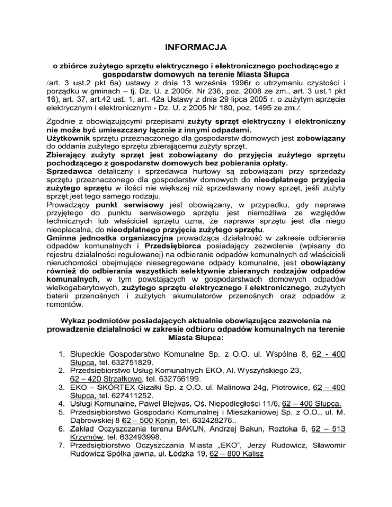 INFORMACJA o zbiórce zużytego sprzętu elektrycznego i elektronicznego pochodzącego z gospodarstw domowych na terenie Miasta Słupca /art. 3 ust.2 pkt 6a) ustawy z dnia 13 września 1996r o utrzymaniu czystości i porządku w gminach – tj. Dz. U. z 2005r. Nr 236, poz. 2008 ze zm., art. 3 ust.1 pkt 16), art. 37, art.42 ust. 1, art. 42a Ustawy z dnia 29 lipca 2005 r. o zużytym sprzęcie elektrycznym i elektronicznym - Dz. U. z 2005 Nr 180, poz. 1495 ze zm./. Zgodnie z obowiązującymi przepisami zużyty sprzęt elektryczny i elektroniczny nie może być umieszczany łącznie z innymi odpadami. Użytkownik sprzętu przeznaczonego dla gospodarstw domowych jest zobowiązany do oddania zużytego sprzętu zbierającemu zużyty sprzęt. Zbierający zużyty sprzęt jest zobowiązany do przyjęcia zużytego sprzętu pochodzącego z gospodarstw domowych bez pobierania opłaty. Sprzedawca detaliczny i sprzedawca hurtowy są zobowiązani przy sprzedaży sprzętu przeznaczonego dla gospodarstw domowych do nieodpłatnego przyjęcia zużytego sprzętu w ilości nie większej niż sprzedawany nowy sprzęt, jeśli zużyty sprzęt jest tego samego rodzaju. Prowadzący punkt serwisowy jest obowiązany, w przypadku, gdy naprawa przyjętego do punktu serwisowego sprzętu jest niemożliwa ze względów technicznych lub właściciel sprzętu uzna, że naprawa sprzętu jest dla niego nieopłacalna, do nieodpłatnego przyjęcia zużytego sprzętu. Gminna jednostka organizacyjna prowadząca działalność w zakresie odbierania odpadów komunalnych i Przedsiębiorca posiadający zezwolenie (wpisany do rejestru działalności regulowanej) na odbieranie odpadów komunalnych od właścicieli nieruchomości obejmujące niesegregowane odpady komunalne, jest obowiązany również do odbierania wszystkich selektywnie zbieranych rodzajów odpadów komunalnych, w tym powstających w gospodarstwach domowych odpadów wielkogabarytowych, zużytego sprzętu elektrycznego i elektronicznego, zużytych baterii przenośnych i zużytych akumulatorów przenośnych oraz odpadów z remontów. Wykaz podmiotów posiadających aktualnie obowiązujące zezwolenia na prowadzenie działalności w zakresie odbioru odpadów komunalnych na terenie Miasta Słupca: 1. Słupeckie Gospodarstwo Komunalne Sp. z O.O. ul. Wspólna 8, 62 - 400 Słupca, tel. 632751829. 2. Przedsiębiorstwo Usług Komunalnych EKO, Al. Wyszyńskiego 23, 62 – 420 Strzałkowo, tel. 632756199. 3. EKO – SKÓRTEX Gizałki Sp. z O.O. ul. Malinowa 24g, Piotrowice, 62 – 400 Słupca, tel. 627411252. 4. Usługi Komunalne, Paweł Blejwas, Oś. Niepodległości 11/6, 62 – 400 Słupca, 5. Przedsiębiorstwo Gospodarki Komunalnej i Mieszkaniowej Sp. z O.O., ul. M. Dąbrowskiej 8 62 – 500 Konin, tel. 632428276.. 6. Zakład Oczyszczania terenu BAKUN, Andrzej Bakun, Roztoka 6, 62 – 513 Krzymów, tel. 632493998. 7. Przedsiębiorstwo Oczyszczania Miasta „EKO”, Jerzy Rudowicz, Sławomir Rudowicz Spółka jawna, ul. Łódzka 19, 62 – 800 Kalisz