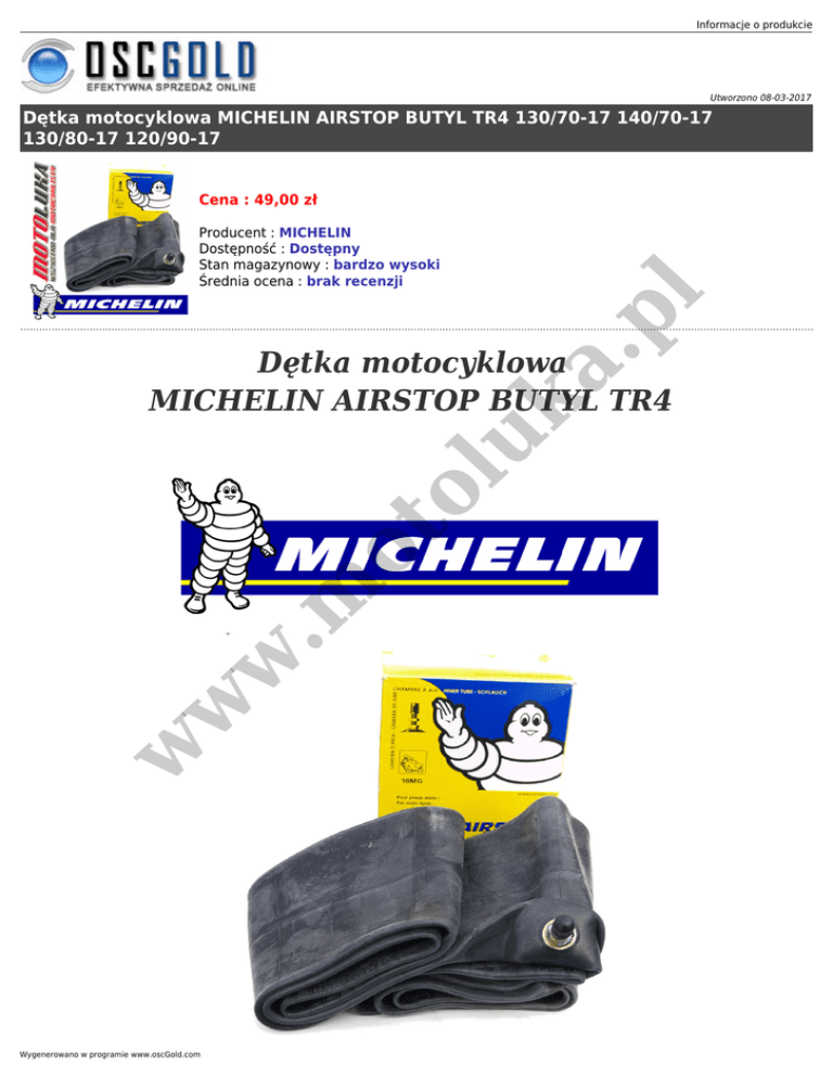 Informacje o produkcie Utworzono 08-03-2017 Dętka motocyklowa MICHELIN AIRSTOP BUTYL TR4 130/70-17 140/70-17 130/80-17 120/90-17 Cena : 49,00 zł a. pl Producent : MICHELIN Dostępność : Dostępny Stan magazynowy : bardzo wysoki Średnia ocena : brak recenzji w w w .m ot ol uk Dętka motocyklowa MICHELIN AIRSTOP BUTYL TR4 Wygenerowano w programie www.oscGold.com Uwaga !!! Zdjęcie poglądowe !!! w w w .m ot ol uk 130/70-17 140/70-17 130/80-17 120/90-17 a. pl Pasuje do opon w rozmiarze: