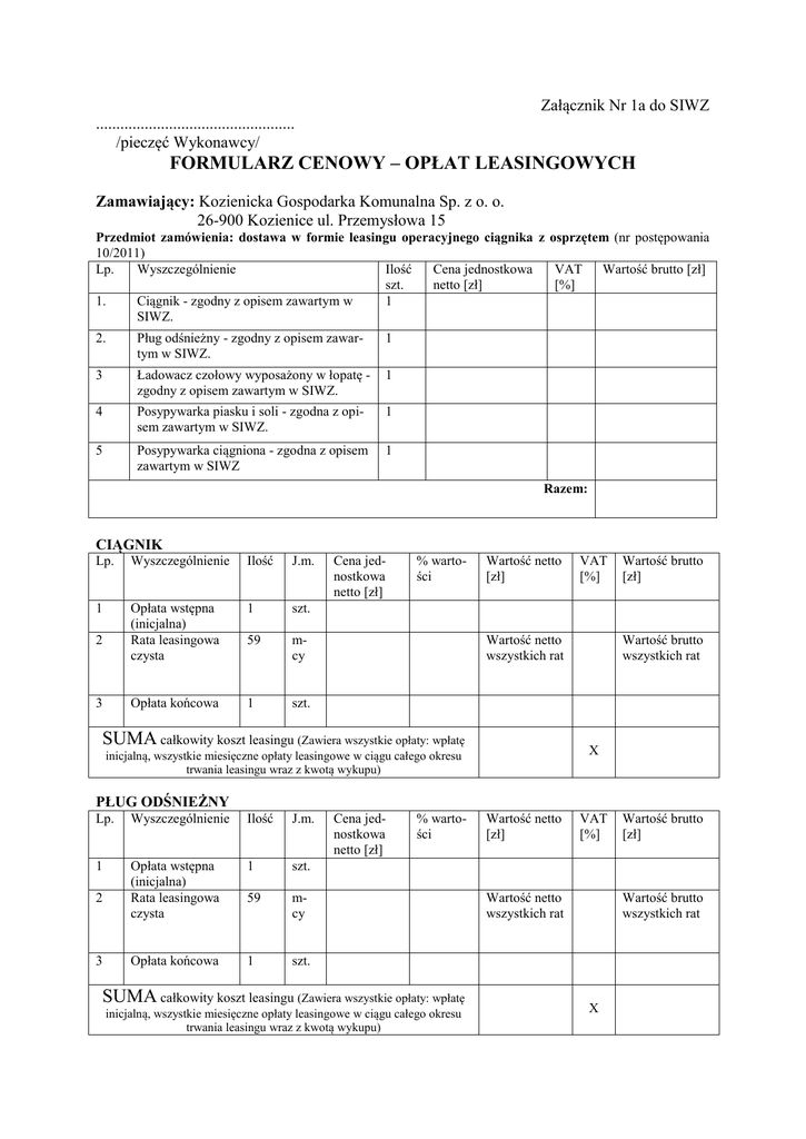 Załącznik Nr 1a do SIWZ ................................................. /pieczęć Wykonawcy/ FORMULARZ CENOWY – OPŁAT LEASINGOWYCH Zamawiający: Kozienicka Gospodarka Komunalna Sp. z o. o. 26-900 Kozienice ul. Przemysłowa 15 Przedmiot zamówienia: dostawa w formie leasingu operacyjnego ciągnika z osprzętem (nr postępowania 10/2011) Lp. Wyszczególnienie Ilość Cena jednostkowa VAT Wartość brutto [zł] szt. netto [zł] [%] 1. Ciągnik - zgodny z opisem zawartym w 1 SIWZ. 2. Pług odśnieżny - zgodny z opisem zawartym w SIWZ. 1 3 Ładowacz czołowy wyposażony w łopatę zgodny z opisem zawartym w SIWZ. 1 4 Posypywarka piasku i soli - zgodna z opisem zawartym w SIWZ. 1 5 Posypywarka ciągniona - zgodna z opisem zawartym w SIWZ 1 Razem: CIĄGNIK Lp. Wyszczególnienie Ilość J.m. 1 Opłata wstępna (inicjalna) Rata leasingowa czysta 1 szt. 59 mcy Opłata końcowa 1 szt. 2 3 Cena jednostkowa netto [zł] % wartości Wartość netto [zł] VAT [%] Wartość netto wszystkich rat SUMA całkowity koszt leasingu (Zawiera wszystkie opłaty: wpłatę Wartość brutto [zł] Wartość brutto wszystkich rat X inicjalną, wszystkie miesięczne opłaty leasingowe w ciągu całego okresu trwania leasingu wraz z kwotą wykupu) PŁUG ODŚNIEŻNY Lp. Wyszczególnienie Ilość J.m. 1 Opłata wstępna (inicjalna) Rata leasingowa czysta 1 szt. 59 mcy Opłata końcowa 1 szt. 2 3 Cena jednostkowa netto [zł] % wartości SUMA całkowity koszt leasingu (Zawiera wszystkie opłaty: wpłatę inicjalną, wszystkie miesięczne opłaty leasingowe w ciągu całego okresu trwania leasingu wraz z kwotą wykupu) Wartość netto [zł] VAT [%] Wartość netto wszystkich rat Wartość brutto [zł] Wartość brutto wszystkich rat X 2 ŁADOWACZ CZOŁOWY Lp. Wyszczególnienie Ilość J.m. 1 Opłata wstępna (inicjalna) Rata leasingowa czysta 1 szt. 59 mcy Opłata końcowa 1 szt. 2 3 Cena jednostkowa netto [zł] % wartości Wartość netto [zł] VAT [%] Wartość netto wszystkich rat SUMA całkowity koszt leasingu (Zawiera wszystkie opłaty: wpłatę Wartość brutto [zł] Wartość brutto wszystkich rat X inicjalną, wszystkie miesięczne opłaty leasingowe w ciągu całego okresu trwania leasingu wraz z kwotą wykupu) POSYPYWARKA PIASKU I SOLI Lp. Wyszczególnienie Ilość J.m. 1 Opłata wstępna (inicjalna) Rata leasingowa czysta 1 szt. 59 mcy Opłata końcowa 1 szt. 2 3 Cena jednostkowa netto [zł] % wartości Wartość netto [zł] VAT [%] Wartość netto wszystkich rat SUMA całkowity koszt leasingu (Zawiera wszystkie opłaty: wpłatę Wartość brutto [zł] Wartość brutto wszystkich rat X inicjalną, wszystkie miesięczne opłaty leasingowe w ciągu całego okresu trwania leasingu wraz z kwotą wykupu) POSYPYWARKA CIĄGNIONA Lp. Wyszczególnienie Ilość J.m. 1 Opłata wstępna (inicjalna) Rata leasingowa czysta 1 szt. 59 mcy Opłata końcowa 1 szt. 2 3 Cena jednostkowa netto [zł] % wartości Wartość netto [zł] VAT [%] Wartość netto wszystkich rat SUMA całkowity koszt leasingu (Zawiera wszystkie opłaty: wpłatę inicjalną, wszystkie miesięczne opłaty leasingowe w ciągu całego okresu trwania leasingu wraz z kwotą wykupu) Wartość brutto [zł] Wartość brutto wszystkich rat X CENĘ OFERTY STANOWI WARTOŚĆ BRUTTO WYRAŻONA W ZŁOTYCH WSZYSTKIE RUBRYKI MUSZĄ BYĆ WYPEŁNIONE ABY OFERTA BYŁA WAŻNA Cena oferty brutto - SUMA całkowity koszt leasingu (ciągnik + pług odśnieżny + ładowacz czołowy + posypywarka piasku + posypywarka ciągniona): ………………….….………..zł .......................... dn. ................... ............................................................ /podpis upoważnionego przedstawiciela Wykonawcy i pieczęć imienna/