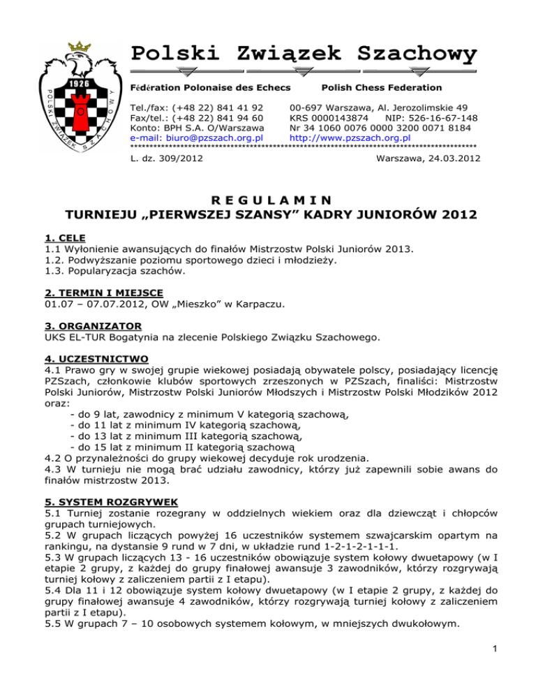 Polski Związek Szachowy Fédération Polonaise des Echecs Tel./fax: (+48 22) 841 41 92 Fax/tel.: (+48 22) 841 94 60 Konto: BPH S.A. O/Warszawa e-mail: [email protected] Polish Chess Federation 00-697 Warszawa, Al. Jerozolimskie 49 KRS 0000143874 NIP: 526-16-67-148 Nr 34 1060 0076 0000 3200 0071 8184 http://www.pzszach.org.pl ****************************************************************************************** L. dz. 309/2012 Warszawa, 24.03.2012 REGULAMIN TURNIEJU „PIERWSZEJ SZANSY” KADRY JUNIORÓW 2012 1. CELE 1.1 Wyłonienie awansujących do finałów Mistrzostw Polski Juniorów 2013. 1.2. Podwyższanie poziomu sportowego dzieci i młodzieży. 1.3. Popularyzacja szachów. 2. TERMIN I MIEJSCE 01.07 – 07.07.2012, OW „Mieszko” w Karpaczu. 3. ORGANIZATOR UKS EL-TUR Bogatynia na zlecenie Polskiego Związku Szachowego. 4. UCZESTNICTWO 4.1 Prawo gry w swojej grupie wiekowej posiadają obywatele polscy, posiadający licencję PZSzach, członkowie klubów sportowych zrzeszonych w PZSzach, finaliści: Mistrzostw Polski Juniorów, Mistrzostw Polski Juniorów Młodszych i Mistrzostw Polski Młodzików 2012 oraz: - do 9 lat, zawodnicy z minimum V kategorią szachową, - do 11 lat z minimum IV kategorią szachową, - do 13 lat z minimum III kategorią szachową, - do 15 lat z minimum II kategorią szachową 4.2 O przynależności do grupy wiekowej decyduje rok urodzenia. 4.3 W turnieju nie mogą brać udziału zawodnicy, którzy już zapewnili sobie awans do finałów mistrzostw 2013. 5. SYSTEM ROZGRYWEK 5.1 Turniej zostanie rozegrany w oddzielnych wiekiem oraz dla dziewcząt i chłopców grupach turniejowych. 5.2 W grupach liczących powyżej 16 uczestników systemem szwajcarskim opartym na rankingu, na dystansie 9 rund w 7 dni, w układzie rund 1-2-1-2-1-1-1. 5.3 W grupach liczących 13 - 16 uczestników obowiązuje system kołowy dwuetapowy (w I etapie 2 grupy, z każdej do grupy finałowej awansuje 3 zawodników, którzy rozgrywają turniej kołowy z zaliczeniem partii z I etapu). 5.4 Dla 11 i 12 obowiązuje system kołowy dwuetapowy (w I etapie 2 grupy, z każdej do grupy finałowej awansuje 4 zawodników, którzy rozgrywają turniej kołowy z zaliczeniem partii z I etapu). 5.5 W grupach 7 – 10 osobowych systemem kołowym, w mniejszych dwukołowym. 1 5.6 Podział na grupy (punkty 5.3 i 5.4) według listy startowej i algorytmu: gr. A: 1,4,5,8,9,12,13,16, grupa B: 2,3,6,7,10,11,14,15. 5.7 Jeżeli turniej spełnia warunki klasyfikowania w rankingu FIDE, ranking będzie liczony. 5.8 Przyjazd i odprawa techniczna w przeddzień zawodów. 6. TEMPO GRY: 90 minut dla zawodnika, na całą partię oraz 30 sekund na każde posunięcie od początku partii. 7. ZGŁOSZENIA Organizator wydaje komunikat organizacyjny i zamieszcza go na stronie internetowej PZSzach nie później niż 30 dni przed zawodami. Potwierdzenia udziału zawodników dokonują wojewódzkie związki szachowe, kluby lub rodzice w sposób określony przez Organizatora w komunikacie organizacyjnym, najpóźniej na 14 dni przed rozpoczęciem zawodów. 8. FINANSOWANIE 8.1. Koszty udziału w turnieju pokrywają delegujące zawodników kluby, wojewódzkie związki szachowe lub rodzice. Koszt udziału nie może przekroczyć wysokości oferowanej przez Organizatora w konkursie ofert. Organizator ma obowiązek zagwarantowania pobytu na koszt własny przedstawiciela PZSzach przez minimum 3 dni. 8.2. Opłatę startową i organizacyjną wysokości podanej w Komunikacie OrganizacyjnoFinansowym PZSzach 1/2011. należy wpłacić na konto PZSzach w BPH O/Warszawa nr 34 1060 0076 0000 3200 0071 8184 w terminie 14 dni przed rozpoczęciem zawodów. 8.3 Opłatę klasyfikacyjno-rankingową w grupach objętych liczeniem rankingu FIDE należy uiścić u Organizatora. 9. OCENA WYNIKÓW 9.1. Klasyfikacja końcowa w turnieju szwajcarskim ustalana jest z uwzględnieniem następujących, kolejno stosowanych kryteriów: - suma zdobytych punktów - wartościowanie średnie Buchholza, - wartościowanie pełne Buchholza, - wynik bezpośredniej partii między zainteresowanymi zawodnikami, - ilość zwycięstw, - progresja, - średni ranking przeciwników. 9.2. Klasyfikacja końcowa w turnieju kołowym ustalana jest z uwzględnieniem następujących, kolejno stosowanych kryteriów: - suma zdobytych punktów - wartościowanie Bergera, - wynik bezpośredniej partii między zainteresowanymi zawodnikami, - ilość zwycięstw, 9.2. W przypadku braku rozstrzygnięcia na podstawie powyższych kryteriów o awansie do Mistrzostw Polski Juniorów oraz grup finałowych (p. 5.3, 5.4) zadecyduje dogrywka na zasadach ustalonych przez sędziego głównego. 10. NAGRODY I WYRÓŻNIENIA 10.1. Prawo startu w finałach Mistrzostw Polski Juniorów i Młodzików w roku 2013 uzyskują: - w grupach wiekowych do 11 i 13 lat – po 2 najlepszych, - w grupach wiekowych do 9 i 15 lat - po 3 najlepszych, 10.2. Organizator funduje nagrody zgodnie ze złożoną ofertą konkursową. 2 11. SĘDZIOWANIE 11.1. W mistrzostwach obowiązują aktualne przepisy FIDE i Kodeksu Szachowego PZSzach. 11.2. Każdy zawodnik, który pojawi się przy szachownicy (stoliku) z opóźnieniem przegrywa partię. 11.3. W turnieju obowiązuje zakaz składania i przyjmowania propozycji remisu przed wykonaniem pierwszych 40 posunięć. Naruszenie przepisu bez zgody sędziego powoduje przegraną. 11.4. Zawodnikowi przysługuje prawo odwołania się od decyzji sędziego rundowego do sędziego głównego zawodów, w ciągu 1 godziny od zakończenia partii. 11.5. Decyzje sędziego głównego są ostateczne. Zawodnikowi przysługuje prawo zażalenia do Kolegium Sędziów PZSzach w ciągu 3 dni po zakończeniu zawodów. 11.6. Sędzia główny ma obowiązek wysłać w ciągu 7 dni po zawodach sprawozdanie w formie elektronicznej (mailem, lub płycie cd) do Przewodniczącego Komisji Ewidencji, Klasyfikacji i Rankingu oraz Wiceprezesa PZSzach. ds. Młodzieżowych. Sprawozdanie winno spełniać warunki określone przez Kole