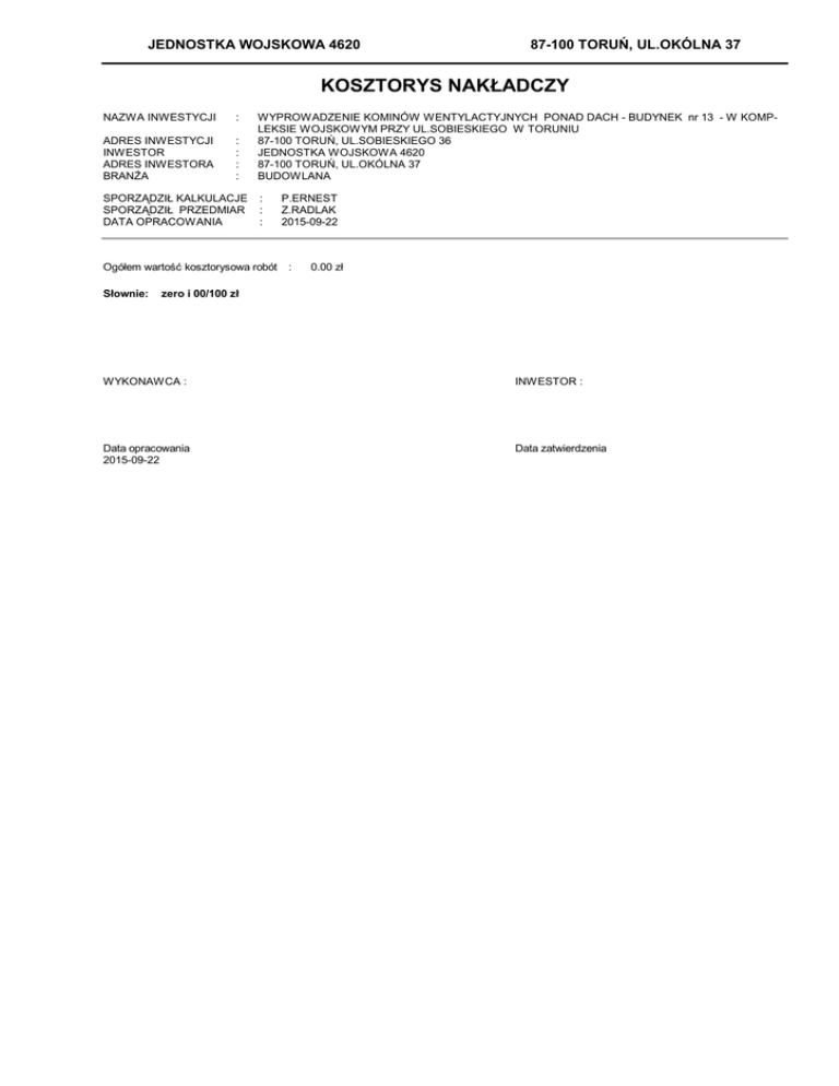 JEDNOSTKA WOJSKOWA 4620 87-100 TORUŃ, UL.OKÓLNA 37 KOSZTORYS NAKŁADCZY NAZWA INWESTYCJI : ADRES INWESTYCJI INWESTOR ADRES INWESTORA BRANŻA : : : : SPORZĄDZIŁ KALKULACJE SPORZĄDZIŁ PRZEDMIAR DATA OPRACOWANIA WYPROWADZENIE KOMINÓW WENTYLACTYJNYCH PONAD DACH - BUDYNEK nr 13 - W KOMPLEKSIE WOJSKOWYM PRZY UL.SOBIESKIEGO W TORUNIU 87-100 TORUŃ, UL.SOBIESKIEGO 36 JEDNOSTKA WOJSKOWA 4620 87-100 TORUŃ, UL.OKÓLNA 37 BUDOWLANA : : : Ogółem wartość kosztorysowa robót Słownie: P.ERNEST Z.RADLAK 2015-09-22 : 0.00 zł zero i 00/100 zł WYKONAWCA : INWESTOR : Data opracowania 2015-09-22 Data zatwierdzenia OBMIAR ROBÓT Lp. Podstawa Opis i wyliczenia j.m. Poszcz 1 WYPROWADZENIE PRZEWODÓW WENTYLACJI GRAWITACYJNEJ PONAD DACH - komin nr 1 1 KNR-W 4-01 Wykonanie rusztowania przy kominach o obwodzie od 2 do 5 m szt. d.1 0433-02 1 szt. 1.000 RAZEM 2 KNR-W 4-01 Rozbiórka pokrycia z dachówki m2 d.1 0509-03 12.0 m2 12.000 RAZEM 3 KNR-W 4-01 Rozebranie elementów więźb dachowych - ołacenie dachu o odstępie łat ponad 24 m2 d.1 0441-05 cm 12.0 m2 12.000 RAZEM 4 KNR 2-17 Przewody wentylacyjne izolowane np. REGA 1000 - 102 mm m d.1 0122-01 analogia 4*1.5 m 6.000 RAZEM 5 KNR-W 4-01 Przemurowanie kominów z cegieł o objętości w jednym miejscu ponad 0.5 m3 m3 d.1 0310-02 (1.5+3.0)/2*0.52*1.32 m3 1.544 RAZEM 6 KNR-W 4-01 Uzupełnienie tynków zwykłych cem.-wap. kat. III na kominach ponad dachem spam2 d.1 0735-09 dzistym (1.5+3.0)/2*(0.52*2+1.32*2) m2 8.280 RAZEM 7 KNR-W 4-01 Sprawdzenie przewodów m d.1 0310-05 15.8*4 m 63.200 RAZEM 8 KNR-W 4-01 Odgruzowanie przewodów m d.1 0310-06 15.8*4 m 63.200 RAZEM 9 KNR-W 4-01 Uzupełnienie zbrojonych czapek kominowych z betonu monolitycznego m2 d.1 0203-13 0.62*1.42 m2 0.880 RAZEM 10 KNR-W 4-01 Obsadzenie kratek wentylacyjnych w kominach z cegieł szt. d.1 0324-02 4 szt. 4.000 RAZEM 11 KNR-W 4-01 Uzupełnienie pokrycia z układanej na sucho dachówki ceramicznej karpiówki podm2 d.1 0502-02 wójnie w koronkę 12.0-0.52*1.32 m2 11.314 RAZEM 12 KNR-W 2-02 Obróbki przy szerokości w rozwinięciu ponad 25 cm - z blachy stalowej ocynkowam2 d.1 0514-02 nej 0.3*(0.52*2+1.32*2) m2 1.104 RAZEM 13 KNR 4-01 Wywiezienie gruzu spryzmowanego samochodami samowyładowczymi na odl.do m3 d.1 0108-11 1 km 12.0*0.015*0.365*0.165*49.2 m3 0.533 RAZEM 14 KNR 4-01 Wywiezienie gruzu spryzmowanego samochodami samowyładowczymi - za każdy m3 d.1 0108-12 nast. 1 km Krotność = 5 0.533 m3 0.533 RAZEM 15 KNR-W 2-02 Obróbki przy szerokości w rozwinięciu ponad 25 cm - z blachy stalowej ocynkowam2 d.1 0514-02 nej 0.533 m2 0.533 RAZEM 16 KNR 2-02 Czas pracy wysięgnika do 20 m d.1 r.16 z.sz.5.15 (poz.:2,3,9,12) 2 WYPROWADZENIE PRZEWODÓW WENTYLACJI GRAWITACYJNEJ PONAD DACH - komin nr 2 17 KNR-W 4-01 Wykonanie rusztowania przy kominach o obwodzie od 2 do 5 m szt. d.2 0433-02 1 szt. 1.000 RAZEM 18 KNR-W 4-01 Rozbiórka pokrycia z dachówki m2 d.2 0509-03 8 m2 8.000 RAZEM Norma PRO Wersja 4.27 Razem 1.000 12.000 12.000 6.000 1.544 8.280 63.200 63.200 0.880 4.000 11.314 1.104 0.533 0.533 0.533 1.000 8.000 OBMIAR ROBÓT Lp. Podstawa Opis i wyliczenia 19 KNR-W 4-01 Rozebranie elementów więźb dachowych - ołacenie dachu o odstępie łat ponad 24 d.2 0441-05 cm 8 20 KNR 2-17 d.2 0122-01 analogia j.m. m2 Poszcz Razem m2 8.000 RAZEM 8.000 6.000 RAZEM 6.000 1.295 RAZEM 1.295 8.055 RAZEM 8.055 63.200 RAZEM 63.200 63.200 RAZEM 63.200 0.764 RAZEM 0.764 4.000 RAZEM 4.000 7.425 RAZEM 7.425 1.074 RAZEM 1.074 0.412 RAZEM 0.412 0.412 RAZEM 0.412 0.412 RAZEM 0.412 Przewody wentylacyjne izolowane np. REGA 1000 - 102 mm m 4*1.5 m 21 KNR-W 4-01 Przemurowanie kominów z cegieł o objętości w jednym miejscu ponad 0.5 m3 d.2 0310-02 (1.5+3.0)/2*0.42*1.37 m3 22 KNR-W 4-01 Uzupełnienie tynków zwykłych cem.-wap. kat. III na kominach ponad dachem spad.2 0735-09 dzistym (1.5+3.0)/2*(0.42*2+1.37*2) m2 23 KNR-W 4-01 Sprawdzenie przewodów d.2 0310-05 15.8*4 m 24 KNR-W 4-01 Odgruzowanie przewodów d.2 0310-06 15.8*4 m 25 KNR-W 4-01 Uzupełnienie zbrojonych czapek kominowych z betonu monolitycznego d.2 0203-13 0.52*1.47 m2 26 KNR-W 4-01 Obsadzenie kratek wentylacyjnych w kominach z cegieł d.2 0324-02 4 szt. 27 KNR-W 4-01 Uzupełnienie pokrycia z układanej na sucho dachówki ceramicznej karpiówki podd.2 0502-02 wójnie w koronkę 8.0-0.42*1.37 m2 28 KNR-W 2-02 Obróbki przy szerokości w rozwinięciu ponad 25 cm - z blachy stalowej ocynkowad.2 0514-02 nej 0.3*(0.42*2+1.37*2) m2 29 KNR 4-01 d.2 0108-11 Wywiezienie gruzu spryzmowanego samochodami samowyładowczymi na odl.do 1 km 0.412 m3 Wywiezienie gruzu spryzmowanego samochodami samowyładowczymi - za każdy nast. 1 km Krotność = 5 0.412 m3 Wywiezienie gruzu spryzmowanego samochodami samowyładowczymi - utylizacja gruzu 0.412 m3 30 KNR 4-01 d.2 0108-12 31 d.2 kalk. własna 32 d.2 3 33 d.3 34 d.3 35 d.3 36 d.3 m3 m2 m m m2 szt. m2 m2 m3 m3 m3 KNR 2-02 Czas pracy wysięgnika do 20 m r.16 z.sz.5.15 (poz.:18,19,25,28) WYPROWADZENIE PRZEWODÓW WENTYLACJI GRAWITACYJNEJ PONAD DACH - komin nr 3 KNR-W 4-01 Wykonanie rusztowania przy kominach o obwodzie od 2 do 5 m szt. 0433-02 1 szt. 1.000 RAZEM KNR-W 4-01 Rozbiórka pokrycia z dachówki m2 0509-03 6 m2 6.000 RAZEM KNR-W 4-01 Rozebranie elementów więźb dachowych - ołacenie dachu o odstępie łat ponad 24 m2 0441-05 cm 6 m2 6.000 RAZEM KNR 2-17 Przewody wentylacyjne izolowane np. REGA 1000 - 102 mm m 0122-01 analogia 4*1.5 m 6.000 RAZEM Norma PRO Wersja 4.27 1.000 6.000 6.000 6.000 OBMIAR ROBÓT Lp. Podstawa Opis i wyliczenia 37 KNR-W 4-01 Przemurowanie kominów z cegieł o objętości w jednym miejscu ponad 0.5 m3 d.3 0310-02 (1.5+3.0)/2*0.42*0.78 j.m. m3 Poszcz Razem m3 0.737 RAZEM 0.737 38 KNR-W 4-01 Uzupełnienie tynków zwykłych cem.-wap. kat. III na kominach ponad dachem spad.3 0735-09 dzistym (1.5+3.0)/2*(0.42*2+0.78*2) m2 5.400 RAZEM 5.400 39 KNR-W 4-01 Sprawdzenie przewodów d.3 0310-05 15.8*4 m 63.200 RAZEM 63.200 40 KNR-W 4-01 Odgruzowanie przewodów d.3 0310-06 15.8*4 m 63.200 RAZEM 63.200 41 K