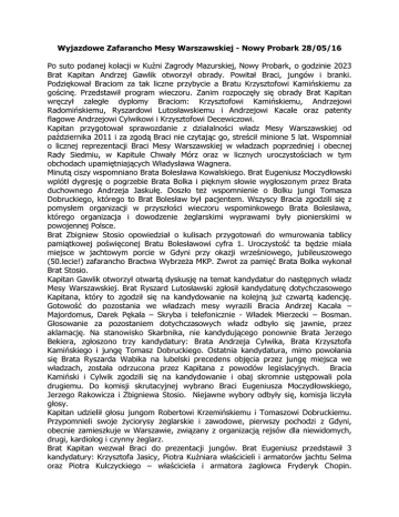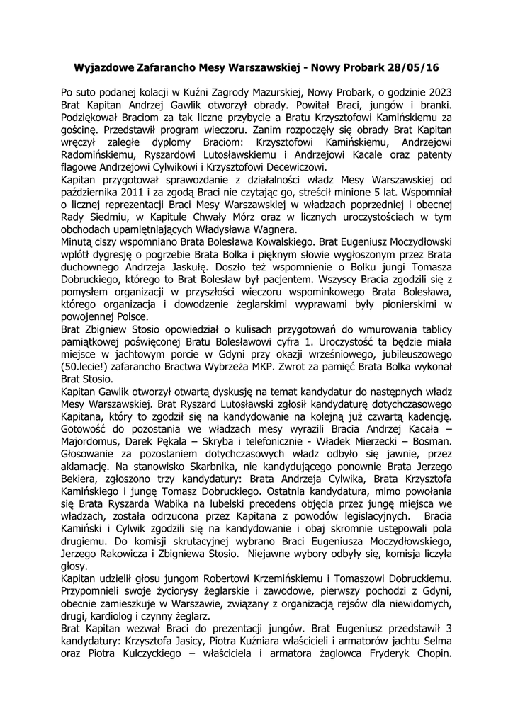 Wyjazdowe Zafarancho Mesy Warszawskiej - Nowy Probark 28/05/16 Po suto podanej kolacji w Kuźni Zagrody Mazurskiej, Nowy Probark, o godzinie 2023 Brat Kapitan Andrzej Gawlik otworzył obrady. Powitał Braci, jungów i branki. Podziękował Braciom za tak liczne przybycie a Bratu Krzysztofowi Kamińskiemu za gościnę. Przedstawił program wieczoru. Zanim rozpoczęły się obrady Brat Kapitan wręczył zaległe dyplomy Braciom: Krzysztofowi Kamińskiemu, Andrzejowi Radomińskiemu, Ryszardowi Lutosławskiemu i Andrzejowi Kacale oraz patenty flagowe Andrzejowi Cylwikowi i Krzysztofowi Decewiczowi. Kapitan przygotował sprawozdanie z działalności władz Mesy Warszawskiej od października 2011 i za zgodą Braci nie czytając go, streścił minione 5 lat. Wspomniał o licznej reprezentacji Braci Mesy Warszawskiej w władzach poprzedniej i obecnej Rady Siedmiu, w Kapitule Chwały Mórz oraz w licznych uroczystościach w tym obchodach upamiętniających Władysława Wagnera. Minutą ciszy wspomniano Brata Bolesława Kowalskiego. Brat Eugeniusz Moczydłowski wplótł dygresję o pogrzebie Brata Bolka i pięknym słowie wygłoszonym przez Brata duchownego Andrzeja Jaskułę. Doszło też wspomnienie o Bolku jungi Tomasza Dobruckiego, którego to Brat Bolesław był pacjentem. Wszyscy Bracia zgodzili się z pomysłem organizacji w przyszłości wieczoru wspominkowego Brata Bolesława, którego organizacja i dowodzenie żeglarskimi wyprawami były pionierskimi w powojennej Polsce. Brat Zbigniew Stosio opowiedział o kulisach przygotowań do wmurowania tablicy pamiątkowej poświęconej Bratu Bolesławowi cyfra 1. Uroczystość ta będzie miała miejsce w jachtowym porcie w Gdyni przy okazji wrześniowego, jubileuszowego (50.lecie!) zafarancho Bractwa Wybrzeża MKP. Zwrot za pamięć Brata Bolka wykonał Brat Stosio. Kapitan Gawlik otworzył otwartą dyskusję na temat kandydatur do następnych władz Mesy Warszawskiej. Brat Ryszard Lutosławski zgłosił kandydaturę dotychczasowego Kapitana, który to zgodził się na kandydowanie na kolejną już czwartą kadencję. Gotowość do pozostania we władzach mesy wyrazili Bracia Andrzej Kacała – Majordomus, Darek Pękala – Skryba i telefonicznie - Władek Mierzecki – Bosman. Głosowanie za pozostaniem dotychczasowych władz odbyło się jawnie, przez aklamację. Na stanowisko Skarbnika, nie kandydującego ponownie Brata Jerzego Bekiera, zgłoszono trzy kandydatury: Brata Andrzeja Cylwika, Brata Krzysztofa Kamińskiego i jungę Tomasz Dobruckiego. Ostatnia kandydatura, mimo powołania się Brata Ryszarda Wabika na lubelski precedens objęcia przez jungę miejsca we władzach, została odrzucona przez Kapitana z powodów legislacyjnych. Bracia Kamiński i Cylwik zgodzili się na kandydowanie i obaj skromnie ustępowali pola drugiemu. Do komisji skrutacyjnej wybrano Braci Eugeniusza Moczydłowskiego, Jerzego Rakowicza i Zbigniewa Stosio. Niejawne wybory odbyły się, komisja liczyła głosy. Kapitan udzielił głosu jungom Robertowi Krzemińskiemu i Tomaszowi Dobruckiemu. Przypomnieli swoje życiorysy żeglarskie i zawodowe, pierwszy pochodzi z Gdyni, obecnie zamieszkuje w Warszawie, związany z organizacją rejsów dla niewidomych, drugi, kardiolog i czynny żeglarz. Brat Kapitan wezwał Braci do prezentacji jungów. Brat Eugeniusz przedstawił 3 kandydatury: Krzysztofa Jasicy, Piotra Kuźniara właścicieli i armatorów jachtu Selma oraz Piotra Kulczyckiego – właściciela i armatora żaglowca Fryderyk Chopin. Kandydatury poparł Brat Stosio dodając kandydaturę polonijnego żeglarza z Nowego Jorku, Ryszarda Stasiaka ps. Marynarz. Drugi wprowadzający to Brat Rakowicz. Brat Kapitan Andrzej Gawlik zaproponował kandydaturę niewidomego żeglarza Ryszarda Pożara, działającego w fundacjach Sonar i Ślepa Kura. Poparł go Brat Jerzy Cytling. Wspomniane kandydatury nie miały głosów przeciwnych. Brat Andrzej Kacała zgłosił kandydaturę polonijnego żeglarza z Niemiec – Roberta Kamińskiego, założyciela klubu żeglarskiego „Korsarze” z Hanoweru. Robert jest szkutnikiem i zajmuje się jachtami klasycznymi. Drugim wprowadzającym był nieobecny Brat Franciszek Korentz. Sprzeciw do zgłoszonej kandydatury zgłosił Brat Ryszard Lutosławski. Odbyło się głosowanie nad kandydaturą, z wynikiem 1 za przyjęciem, 2 przeciw i 11 wstrzymujących się. Zamorski Brat Wojciech Ogrzewalski zgłosił kandydaturę Waldka Heislera, który to okazał się już być jungą w Mesie Gdańskiej. Brat Jerzy Rakowicz ogłosił wyniki wyborów na Skarbnika: Brat Andrzej Cylwik 12 głosów za, Brat Krzysztof Kamiński 2 za. Kapitan przywitał nowego Skarbnika we władzach mesy. Brat Gienia na rozkaz Brata Kapitana dokonał zwrotu o bliskiej mu arktycznej tematyce. Formalne obrady mesy zakończono dyskusją nad znakiem Mesy Warszawskiej. Nie przyjęto znaku zaproponowanego przez Brata Darka Pękalę wg projektu Dariusza Swędzikowskiego. Dalsze prace nad znakiem przyjętym w głosowaniu przejął Brat Moczydłowski. Brat Pękala dokonał wiślanego zwrotu przy syrence. Zafarancho zakończyło się o 2400, prawie godzinną prezentacją z ponad 5. miesięcznego rejsu jungi Dobruckiego z Gdańska do Wietnamu. Junga Dobrucki pełnił funkcję lekarza na pokładzie zbudowanego w polskiej stoczni dla marynarki Wojennej Wietnamu żaglowca ‘Le Quy Don’. Spisał Darek 101 Pękala – Skryba Mesy Warszawskiej