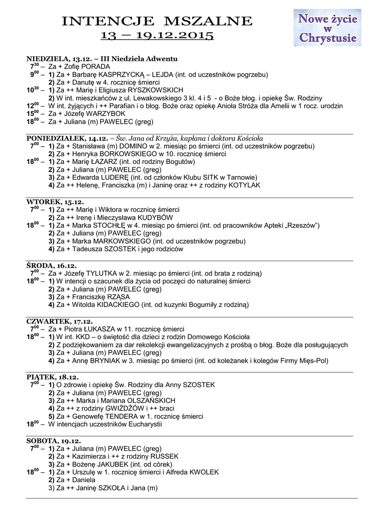 INTENCJE MSZALNE 13 – 19.12.2015 NIEDZIELA, 13.12. – III Niedziela Adwentu 730 – Za + Zofię PORADA 900 – 1) Za + Barbarę KASPRZYCKĄ – LEJDA (int. od uczestników pogrzebu) 2) Za + Danutę w 4. rocznicę śmierci 1030 – 1) Za ++ Marię i Eligiusza RYSZKOWSKICH 2) W int. mieszkańców z ul. Lewakowskiego 3 kl. 4 i 5 - o Boże błog. i opiekę Św. Rodziny 1200 – W int. żyjących i ++ Parafian i o błog. Boże oraz opiekę Anioła Stróża dla Amelii w 1 rocz. urodzin 1500 – Za + Józefę WARZYBOK 1800 – Za + Juliana (m) PAWELEC (greg) PONIEDZIAŁEK, 14.12. – Św. Jana od Krzyża, kapłana i doktora Kościoła 700 – 1) Za + Stanisława (m) DOMINO w 2. miesiąc po śmierci (int. od uczestników pogrzebu) 2) Za + Henryka BORKOWSKIEGO w 10. rocznicę śmierci 00 18 – 1) Za + Marię ŁAZARZ (int. od rodziny Bogutów) 2) Za + Juliana (m) PAWELEC (greg) 3) Za + Edwarda LUDERĘ (int. od członków Klubu SITK w Tarnowie) 4) Za ++ Helenę, Franciszka (m) i Janinę oraz ++ z rodziny KOTYLAK WTOREK, 15.12. 700 – 1) Za ++ Marię i Wiktora w rocznicę śmierci 2) Za ++ Irenę i Mieczysława KUDYBÓW 1800 – 1) Za + Marka STOCHŁĘ w 4. miesiąc po śmierci (int. od pracowników Apteki „Rzeszów”) 2) Za + Juliana (m) PAWELEC (greg) 3) Za + Marka MARKOWSKIEGO (int. od uczestników pogrzebu) 4) Za + Tadeusza SZOSTEK i jego rodziców ŚRODA, 16.12. 700 – Za + Józefę TYLUTKA w 2. miesiąc po śmierci (int. od brata z rodziną) 1800 – 1) W intencji o szacunek dla życia od poczęci do naturalnej śmierci 2) Za + Juliana (m) PAWELEC (greg) 3) Za + Franciszkę RZĄSA 4) Za + Witolda KIDACKIEGO (int. od kuzynki Bogumiły z rodziną) CZWARTEK, 17.12. 700 – Za + Piotra ŁUKASZA w 11. rocznicę śmierci 1800 – 1) W int. KKD – o świętość dla dzieci z rodzin Domowego Kościoła 2) Z podziękowaniem za dar rekolekcji ewangelizacyjnych z prośbą o błog. Boże dla posługujących 3) Za + Juliana (m) PAWELEC (greg) 4) Za + Annę BRYNIAK w 3. miesiąc po śmierci (int. od koleżanek i kolegów Firmy Mięs-Pol) PIĄTEK, 18.12. 700 – 1) O zdrowie i opiekę Św. Rodziny dla Anny SZOSTEK 2) Za + Juliana (m) PAWELEC (greg) 3) Za ++ Marka i Mariana OLSZAŃSKICH 4) Za ++ z rodziny GWIŻDŹÓW i ++ braci 5) Za + Genowefę TENDERA w 1. rocznicę śmierci 1800 – W intencjach uczestników Eucharystii SOBOTA, 19.12. 700 – 1) Za + Juliana (m) PAWELEC (greg) 2) Za + Kazimierza i ++ z rodziny RUSSEK 3) Za + Bożenę JAKUBEK (int. od córek) 1800 – 1) Za + Urszulę w 1. rocznicę śmierci i Alfreda KWOLEK 2) Za + Daniela 3) Za ++ Janinę SZKOŁA i Jana (m) OGŁOSZENIA PARAFIALNE III Niedziela Adwentu 13 grudnia 2015 1. Dnia 8 grudnia rozpoczął się ogłoszony przez Papieża Franciszka Rok Miłosierdzia. Z tej okazji wszyscy spowiednicy otrzymali władzę zwalniania z ekskomuniki i rozgrzeszania osób winnych aborcji. Ojciec Święty udzielił również odpustu zupełnego pod zwykłymi warunkami (sakramentalna spowiedź, Komunia św. i modlitwa w intencjach Papieża) wszystkim wiernym, którzy w Roku Miłosierdzia odbędą pielgrzymkę do Drzwi Świętych w czterech bazylikach większych Rzymu, a także do katedry i kościołów wyznaczonych przez biskupa diecezjalnego. W naszej Diecezji takimi kościołami, obok Kościoła Katedralnego, jest Bazylika OO. Bernardynów w Rzeszowie i dziesięć kościołów na terenie diecezji. Więcej informacji znajdziemy na plakatach z tyłu kościoła i parafialnej stronie internetowej. Dzisiaj w Katedrze rzeszowskiej Biskup Jan otworzy Drzwi Miłosierdzia. O godz. 16.30 – wprowadzenie, o godz. 17.00 – Msza św. Ksiądz Biskup zaprasza młodzież i wolontariuszy ŚDM, a także przedstawicieli ruchów i stowarzyszeń oraz wszystkich diecezjan. 2. Dzisiaj Zespół Caritas rozprowadza świece Wigilijnego Dzieła Pomocy Dzieciom w cenie 5 i 12 zł. W przyszłą niedzielę po każdej Mszy św. zbiórka do puszek na przedświąteczną pomoc dla najuboższych rodzin naszej Parafii. Pomóżmy im radośnie przeżyć te Święta. 3. Zapraszamy na Roraty od poniedziałku do piątku o godz. 18.00, a w sobotę o godz. 7.00. Dzieci spotykają się w tym tygodniu w poniedziałek, środę i czwartek o godz. 18.00. 4. W piątek o godz. 18.00 Msza św. z modlitwą o uzdrowienie i uwolnienie. 5. Przyparafialne Koło Fotografów zaprasza wszystkich pasjonatów fotografowania na spotkanie, które odbędzie się we wtorek o godz. 19.30 w pomieszczeniach Poradni Rodzinnej. 6. Msza św. w int. o szacunek dla życia od poczęcia do naturalnej śmierci w środę o godz. 18.00. 7. Spotkanie Koła Misyjnego – w przyszłą niedzielę o godz. 17.00. O godz. 17.30 nabożeństwo w intencji misji. Serdecznie zapraszamy. 8. Spowiedź przedświąteczna w naszej parafii – w przyszły poniedziałek, 21 grudnia, w godz.: 9.00 – 12.00 i 16.00 – 20.00. 9. W ramach ogólnopolskiej akcji Pomocy Kościołowi na Wschodzie zebraliśmy 1 250 zł. Bóg zapłać za złożone na ten cel ofiary. 10. Mieszkańcom bloków przy ul. Lewakowskiego 3a i 3b dziękujemy za ofiarę na sprzątanie kościoła. Msza św. w ich intencji – w niedzielę, 20 grudnia, o godz. 10.30. W tym tygodniu o złożenie ofiary prosimy mieszkańców bloku przy ul. Pleśniarowicza 17. 11. Zachęcamy do nabywania i czytania prasy katolickiej. Jest do nabycia nowy numer MIŁUJCIE SIĘ. Młodzież oazowa rozprowadza kartki świąteczne i figurki Dzieciątka Jezus. Opłatki na stół wigilijny można nabyć w zakrystii i kancelarii. Do wieczności odeszła śp. Barbara Nowak (lat 58) z ul. Solarza 20. Polećmy ją Bożemu Miłosierdziu: Wieczne odpoczywanie….