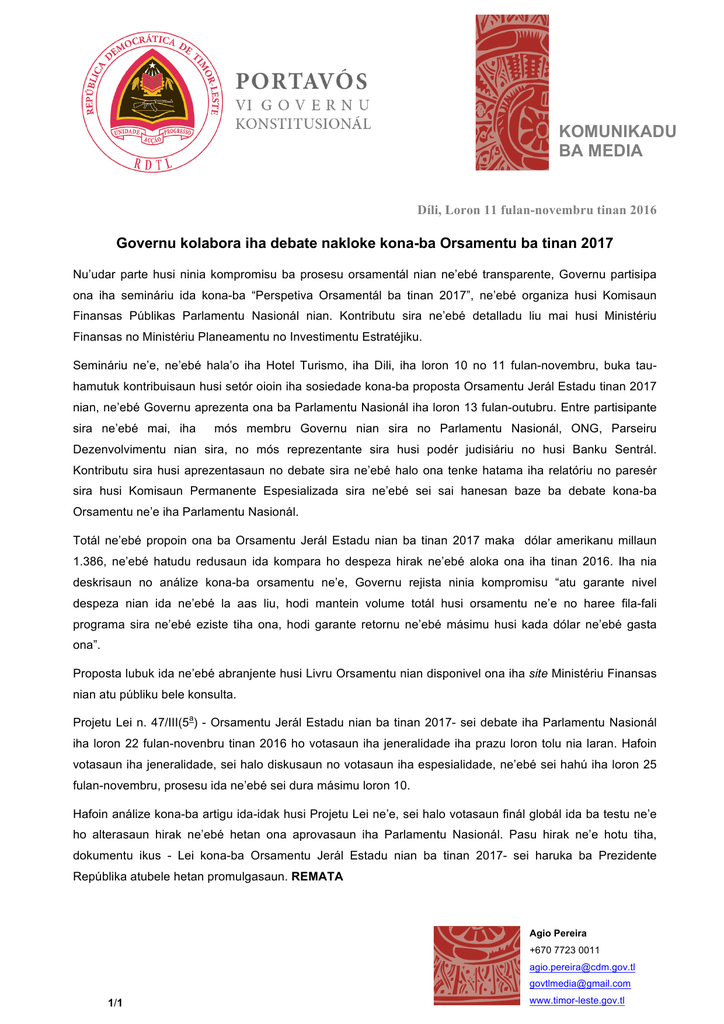 KOMUNIKADU BA MEDIA Díli, Loron 11 fulan-novembru tinan 2016 Governu kolabora iha debate nakloke kona-ba Orsamentu ba tinan 2017 Nu’udar parte husi ninia kompromisu ba prosesu orsamentál nian ne’ebé transparente, Governu partisipa ona iha semináriu ida kona-ba “Perspetiva Orsamentál ba tinan 2017”, ne’ebé organiza husi Komisaun Finansas Públikas Parlamentu Nasionál nian. Kontributu sira ne’ebé detalladu liu mai husi Ministériu Finansas no Ministériu Planeamentu no Investimentu Estratéjiku. Semináriu ne’e, ne’ebé hala’o iha Hotel Turismo, iha Dili, iha loron 10 no 11 fulan-novembru, buka tauhamutuk kontribuisaun husi setór oioin iha sosiedade kona-ba proposta Orsamentu Jerál Estadu tinan 2017 nian, ne’ebé Governu aprezenta ona ba Parlamentu Nasionál iha loron 13 fulan-outubru. Entre partisipante sira ne’ebé mai, iha mós membru Governu nian sira no Parlamentu Nasionál, ONG, Parseiru Dezenvolvimentu nian sira, no mós reprezentante sira husi podér judisiáriu no husi Banku Sentrál. Kontributu sira husi aprezentasaun no debate sira ne’ebé halo ona tenke hatama iha relatóriu no paresér sira husi Komisaun Permanente Espesializada sira ne’ebé sei sai hanesan baze ba debate kona-ba Orsamentu ne’e iha Parlamentu Nasionál. Totál ne’ebé propoin ona ba Orsamentu Jerál Estadu nian ba tinan 2017 maka dólar amerikanu millaun 1.386, ne’ebé hatudu redusaun ida kompara ho despeza hirak ne’ebé aloka ona iha tinan 2016. Iha nia deskrisaun no análize kona-ba orsamentu ne’e, Governu rejista ninia kompromisu “atu garante nivel despeza nian ida ne’ebé la aas liu, hodi mantein volume totál husi orsamentu ne’e no haree fila-fali programa sira ne’ebé eziste tiha ona, hodi garante retornu ne’ebé másimu husi kada dólar ne’ebé gasta ona”. Proposta lubuk ida ne’ebé abranjente husi Livru Orsamentu nian disponivel ona iha site Ministériu Finansas nian atu públiku bele konsulta. a Projetu Lei n. 47/III(5 ) - Orsamentu Jerál Estadu nian ba tinan 2017- sei debate iha Parlamentu Nasionál iha loron 22 fulan-novenbru tinan 2016 ho votasaun iha jeneralidade iha prazu loron tolu nia laran. Hafoin votasaun iha jeneralidade, sei halo diskusaun no votasaun iha espesialidade, ne’ebé sei hahú iha loron 25 fulan-novembru, prosesu ida ne’ebé sei dura másimu loron 10. Hafoin análize kona-ba artigu ida-idak husi Projetu Lei ne’e, sei halo votasaun finál globál ida ba testu ne’e ho alterasaun hirak ne’ebé hetan ona aprovasaun iha Parlamentu Nasionál. Pasu hirak ne’e hotu tiha, dokumentu ikus - Lei kona-ba Orsamentu Jerál Estadu nian ba tinan 2017- sei haruka ba Prezidente Repúblika atubele hetan promulgasaun. REMATA Agio Pereira +670 7723 0011 [email protected] [email protected] 1/1 www.timor-leste.gov.tl