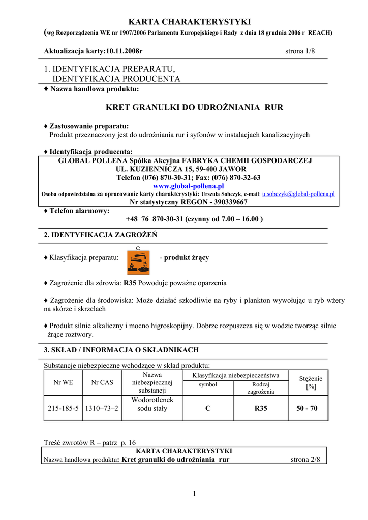 KARTA CHARAKTERYSTYKI (wg Rozporządzenia WE nr 1907/2006 Parlamentu Europejskiego i Rady z dnia 18 grudnia 2006 r REACH) Aktualizacja karty:10.11.2008r strona 1/8 1. IDENTYFIKACJA PREPARATU, IDENTYFIKACJA PRODUCENTA ♦ Nazwa handlowa produktu: KRET GRANULKI DO UDROŻNIANIA RUR ♦ Zastosowanie preparatu: Produkt przeznaczony jest do udrożniania rur i syfonów w instalacjach kanalizacyjnych ♦ Identyfikacja producenta: GLOBAL POLLENA Spółka Akcyjna FABRYKA CHEMII GOSPODARCZEJ UL. KUZIENNICZA 15, 59-400 JAWOR Telefon (076) 870-30-31; Fax: (076) 870-32-63 www.global-pollena.pl Osoba odpowiedzialna za opracowanie karty charakterystyki: Urszula Sobczyk, e-mail: [email protected] Nr statystyczny REGON - 390339667 ♦ Telefon alarmowy: +48 76 870-30-31 (czynny od 7.00 – 16.00 ) 2. IDENTYFIKACJA ZAGROŻEŃ ♦ Klasyfikacja preparatu: - produkt żrący ♦ Zagrożenie dla zdrowia: R35 Powoduje poważne oparzenia ♦ Zagrożenie dla środowiska: Może działać szkodliwie na ryby i plankton wywołując u ryb wżery na skórze i skrzelach ♦ Produkt silnie alkaliczny i mocno higroskopijny. Dobrze rozpuszcza się w wodzie tworząc silnie żrące roztwory. 3. SKŁAD / INFORMACJA O SKŁADNIKACH Substancje niebezpieczne wchodzące w skład produktu: Nr WE Nr CAS 215-185-5 1310–73–2 Nazwa niebezpiecznej substancji Klasyfikacja niebezpieczeństwa Wodorotlenek sodu stały symbol Rodzaj zagrożenia C R35 Stężenie [%] 50 - 70 Treść zwrotów R – patrz p. 16 KARTA CHARAKTERYSTYKI Nazwa handlowa produktu: Kret granulki do udrożniania rur 1 strona 2/8 4. PIERWSZA POMOC Kontakt z oczami: dokładnie przemyć dużą ilością chłodnej i czystej wody przy odwiniętych powiekach przez co najmniej 15 minut. Unikać silnego strumienia wody, który może stworzyć ryzyko uszkodzenia rogówki. Nie używać żadnych maści oraz płynów do przemywania oczu. Natychmiast skontaktować się z lekarzem okulistą. UWAGA! Osoby narażone na skażenie oczu powinny być poinformowane o konieczności i sposobie natychmiastowego płukania oczu. Kontakt ze skórą: zdjąć odzież, skażoną część ciała dokładnie zmyć dużą ilością czystej wody przez około 15 minut. Nie stosować środków zobojętniających(kwaśnych). Natychmiast skontaktować się z lekarzem. Spożycie: dokładnie wypłukać jamę ustną, a następnie podać do wypicia dużą ilość wody. Nie wywoływać wymiotów oraz nie stosować środków zobojętniających (kwaśnych) Natychmiast skontaktować się z lekarzem. Wdychanie: wyprowadzić z miejsca narażenia, zapewnić spokój oraz dopływ świeżego powietrza. Natychmiast skontaktować się z lekarzem. 5. POSTĘPOWANIE W PRZYPADKU POŻARU ♦ produkt niepalny ♦ w razie pożaru stosować środki gaśnicze odpowiednie dla palących się materiałów ♦ nie wykazuje właściwości wybuchowych, zagrożenie stwarza wodór wydzielający się w wyniku reakcji z metalami (cyna, cynk, glin) w środowisku wilgotnym. ♦ przeciwpożarowe wyposażenie ochronne - odzież ochronna gazoszczelna z aparatem izolującym drogi oddechowe. 6. POSTĘPOWANIE W PRZYPADKU NIEZAMIERZONEGO UWOLNIENIA DO ŚRODOWISKA Indywidualne środki ostrożności – unikać bezpośredniego kontaktu z oczami i skórą, nie wdychać oparów, nie mieszać z innymi produktami (szczególnie z kwasami), stosować odzież ochronną powlekaną tworzywem lub gumą, okulary całkowicie zabezpieczające oczy, rękawice oraz aparat izolujący drogi oddechowe. Środki ostrożności w zakresie ochrony środowiska – produkt o wysokim pH, unikać wprowadzania produktu do wód powierzchniowych, gruntowych oraz do gleby. Jeżeli produkt dostał się do zbiornika wody, kanału lub został rozsypany na glebę czy roślinność, należy natychmiast zawiadomić odpowiednie służby i policję Sposób oczyszczania – W razie rozsypania zmieść ostrożnie, nie wzniecać pyłu, zebrać ostrożnie do szczelnie zamkniętych pojemników z tworzywa sztucznego lub worków z PE odpowiednio oznaczonych i przekazać do utylizacji. Zanieczyszczone powierzchnie, sprzęty dokładnie spłukać dużą ilością wody. UWAGA! Nie stosować pojemników aluminiowych oraz wykonanych z cyny lub cynku KARTA CHARAKTERYSTYKI Nazwa handlowa produktu: Kret granulki do udrożniania rur 7. POSTĘPOWANIE Z PREPARATEM I JEGO MAGAZYNOWANIE 2 strona 3/8 Wskazówki bezpiecznego − stosować zgodnie z przeznaczeniem i sposobem użycia, stosowania produktu bezwzględnie chronić oczy i skórę przed preparatem szczególnie w czasie jego dozowania. Stosować odzież ochronną, rękawice oraz okulary ochronne, nie mieszać z innymi środkami (szczególnie z kwasami). W czasie stosowania nie jeść, nie pić, unikać wdychania pyłu, przestrzegać higieny osobistej Magazynowanie − przechowywać w oryginalnych opakowaniach w pomieszczeniach krytych, suchych, chłodnych z nienasiąkliwą, ługoodporną i łatwo zmywalną podłogą, z wentylacją ogólną, z daleka od urządzeń grzewczych w temp. nie wyższej niż 300C. Nie magazynować ze środkami spożywczymi. Opakowanie jednostkowe - saszetki z folii aluminiowej powlekanej obustronnie folią z tworzywa sztucznego ze zwiększoną odpornością na działanie wyrobu i rozerwanie oraz butelki, pojemniki tworzywowe lub inne opakowanie zaopatrzone w zamknięcia utrudniające otwarcie przez dzieci i wyczuwalne dotykiem ostrzeżenie o niebezpieczeństwie Opakowanie zbiorcze − kartony, folia lub inne opakowanie zabezpieczające produkt przed uszkodzeniami i wpływami atmosferycznymi 8. KONTROLA NARAŻENIA I ŚRODKI OCHRONY INDYWIDUALNEJ Parametry kontroli narażenia: NDS (Polska) – wodorotlenek sodu – 0,5 mg/m3 NDSCH (Polska)– wodorotlenek sodu – 1 mg/m3 Metody oceny narażenia na stanowisku pracy: ● PN-88/Z-04005/06 Ochrona czystości powietrza. Badania zawartości alkaliów. Oznaczenie wodorotlenku sodowego na stanowiskach pracy metodą płomieniową absorpcyjnej spektrometrii atomowej. . Środki ochrony indywi