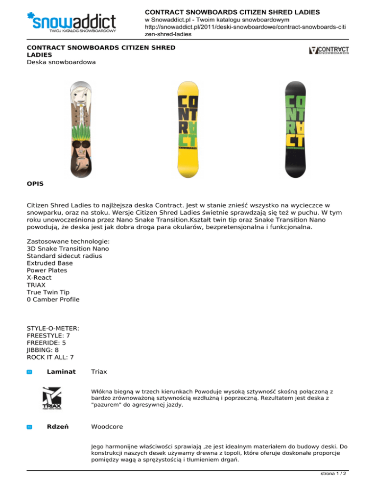 CONTRACT SNOWBOARDS CITIZEN SHRED LADIES w Snowaddict.pl - Twoim katalogu snowboardowym http://snowaddict.pl/2011/deski-snowboardowe/contract-snowboards-citi zen-shred-ladies CONTRACT SNOWBOARDS CITIZEN SHRED LADIES Deska snowboardowa OPIS Citizen Shred Ladies to najlżejsza deska Contract. Jest w stanie znieść wszystko na wycieczce w snowparku, oraz na stoku. Wersje Citizen Shred Ladies świetnie sprawdzają się też w puchu. W tym roku unowocześniona przez Nano Snake Transition.Kształt twin tip oraz Snake Transition Nano powodują, że deska jest jak dobra droga para okularów, bezpretensjonalna i funkcjonalna. Zastosowane technologie: 3D Snake Transition Nano Standard sidecut radius Extruded Base Power Plates X-React TRIAX True Twin Tip 0 Camber Profile STYLE-O-METER: FREESTYLE: 7 FREERIDE: 5 JIBBING: 8 ROCK IT ALL: 7 Laminat Triax Włókna biegną w trzech kierunkach Powoduje wysoką sztywność skośną połączoną z bardzo zrównoważoną sztywnością wzdłużną i poprzeczną. Rezultatem jest deska z "pazurem" do agresywnej jazdy. Rdzeń Woodcore Jego harmonijne właściwości sprawiają ,ze jest idealnym materiałem do budowy deski. Do konstrukcji naszych desek używamy drewna z topoli, które oferuje doskonałe proporcje pomiędzy wagą a sprężystością i tłumieniem drgań. strona 1 / 2 CONTRACT SNOWBOARDS CITIZEN SHRED LADIES w Snowaddict.pl - Twoim katalogu snowboardowym http://snowaddict.pl/2011/deski-snowboardowe/contract-snowboards-citi zen-shred-ladies Ślizg Extruded Base Ślizg tłoczony, szybki, wytrzymały. Kształt True Twin Tip Perfekcyjnie symetryczny kształt. Profil 0 Camber Płaska deska, która powoduje szybsze reagowanie krawędzi. Sidecut Standard Radius Długości 135, 141, 147, 151 Wymiary KE - krawędź efektywna ST - szerokość talii PS - promień skrętu 135 141 147 151 KE 1010mm 1030mm 1100mm 1134mm ST 234mm 229mm 249mm 249mm PS 6.7m 7.1m 7.7m 7.8m SB 0mm 0mm 0mm 0mm SB - setback Płeć Mężczyźni Więcej na temat tego produktu pod adresem: http://snowaddict.pl/2011/deski-snowboardowe/contract-snowboards-citizen-shred-ladies Dokument PDF pochodzi ze Snowaddict.pl - Twój katalog snowboardowy Data i czas pobrania dokumentu: 2017-03-08 03:46:19 © 2011-2017 Snowaddict.pl - Twój katalog snowboardowy strona 2 / 2 Powered by TCPDF (www.tcpdf.org)