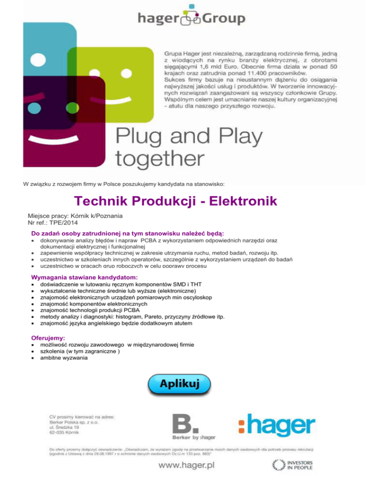 W związku z rozwojem firmy w Polsce poszukujemy kandydata na stanowisko: Technik Produkcji - Elektronik Miejsce pracy: Kórnik k/Poznania Nr ref.: TPE/2014 Do zadań osoby zatrudnionej na tym stanowisku należeć będą: dokonywanie analizy błędów i napraw PCBA z wykorzystaniem odpowiednich narzędzi oraz dokumentacji elektrycznej i funkcjonalnej zapewnienie współpracy technicznej w zakresie utrzymania ruchu, metod badań, rozwoju itp. uczestnictwo w szkoleniach innych operatorów, szczególnie z wykorzystaniem urządzeń do badań uczestnictwo w pracach grup roboczych w celu poprawy procesu Wymagania stawiane kandydatom: doświadczenie w lutowaniu ręcznym komponentów SMD i THT wykształcenie techniczne średnie lub wyższe (elektroniczne) znajomość elektronicznych urządzeń pomiarowych min oscyloskop znajomość komponentów elektronicznych znajomość technologii produkcji PCBA metody analizy i diagnostyki: histogram, Pareto, przyczyny źródłowe itp. znajomość języka angielskiego będzie dodatkowym atutem Oferujemy: możliwość rozwoju zawodowego w międzynarodowej firmie szkolenia (w tym zagraniczne ) ambitne wyzwania