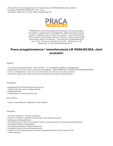 ● ● ● Work position: Prace przygotowawcze i inwentaryzacja-LM MODLNICZKA, start wrzesień! Company: INTERIMAX POLSKA SP. Z O.O. S.K.A. Workplace: Modlniczka, ul. Prof. Adama Rożańskiego 34 INTERIMAX jest nowoczesną agencją rekrutacyjną, realizującą projekty dla polskich i zagranicznych przedsiębiorstw. Jeżeli poszukujesz nowych wyzwań i możliwości pracy w kraju lub za granicą - nasza oferta jest dla Ciebie! Aktualnie dla jednego z Naszych Klientów, marketu budowlanego poszukujemy osób na stanowiska: Pracownik prac przygotowawczych od 3-15.10 i Pracownik inwentaryzacji 16.10! Miejsce pracy: LM Modlniczka, ul. Prof. Adama Rożańskiego 34 Prace przygotowawcze i inwentaryzacja-LM MODLNICZKA, start wrzesień! Zadania: ● ● ● ● 3-15.10-prace przygotowawcze - prace dzienne - 8 h: wykładanie, układanie, segregowanie, metkowanie towaru oraz prace pomocnicze porządkowe - SAM WYBIERASZ, W KTÓRE DNI CHCESZ PRACOWAĆ 16.10 - inwentaryzacja - prace nocne: liczenie towaru (ręczne lub przy użyciu skanera) możliwość wyboru: prace pomocnicze lub inwentaryzacja lub prace+inwentaryzacja Wymagania: ● ● ● ● dyspozycyjność (możliwość wyboru dni pracy) osoby od 16 roku życia za zgodą rodziców odpowiedzialność zaangażowanie i motywacja do pracy Mile widziane: ● status ucznia/studenta- Cudzoziemcy mile widziani Oferujemy: ● ● ● ● ● ● ● ● ● darmowy transport z i powrót do Krakowa premia 5 zł brutto za polecenie każdej osoby, która będzie pracować atrakcyjna stawka godzinowa dla osób biorących udział we wszystkich naszych Inwentaryzacjach w Krakowie specjalna premia terminowa wypłata wynagrodzenia kompleksowa obsługa naszego konsultanta możliwość zdobycia cennego doświadczenia udział w innych inwentaryzacjach na terenie Krakowa (Bonarka 21.09, Czyżyny 9.10) umowa zlecenie Jeśli jesteś zainteresowany/a powyższą ofertą prześlij nam swoje aktualne opisowe CV - oddzwonimy ekspresowo! Pamiętaj o załączeniu do swojej aplikacji następującej klauzuli: "Wyrażam zgodę na przetwarzanie moich danych osobowych zawartych w ofercie pracy przez: INTERIMAX INTERNATIONAL SP. Z O.O. S.K.A., INTERIMAX POLSKA SP. Z O.O. S.K.A., A-TEAM Recruitment SP. Z O.O. S.K.A. dla potrzeb niezbędnych do realizacji tego oraz przyszłych procesów rekrutacji zgodnie z ustawą z dnia 29.08.1997 r. o ochronie danych osobowych (Dz. U. z 2014 r. Nr 1182 z późn. zm.)". Jeśli chcesz otrzymywać informację o ofertach pracy, załącz w swojej aplikacji dodatkową klauzulę: "Wyrażam zgodę na przetwarzanie moich danych osobowych zawartych w ofercie pracy przez: INTERIMAX INTERNATIONAL SP. Z O.O. S.K.A., INTERIMAX POLSKA SP. Z O.O. S.K.A., A-TEAM Recruitment SP. Z O.O. S.K.A. w celu przesyłania informacji o nowych ofertach pracy za pomocą poczty elektronicznej zgodnie z art. 10 ust. 2 ustawy z dnia 18 lipca 2002 r. o świadczeniu usług drogą elektroniczną (Dz. U. z 2013 r. Nr 1422 z późn. zm.)". Uprzejmie informujemy, że zastrzegamy sobie prawo do kontaktu z wybranymi osobami. Certyfikaty o dokonaniu wpisu podmiotów do rejestru podmiotów prowadzących agencję zatrudnienia: - INTERIMAX INTERNATIONAL SP. Z O.O. S.K.A. (8340), - INTERIMAX POLSKA SP. Z O.O. S.K.A. (8471), - A-TEAM Recruitment SP. Z O.O. S.K.A. (8476). Aplikuj Dane kontaktowe: INTERIMAX POLSKA SP. Z O.O. S.K.A. Send Save Print Tweet