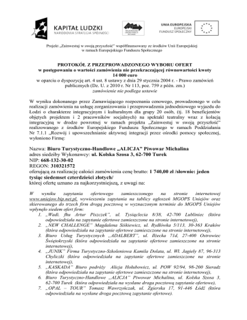 Projekt „Zainwestuj w swoją przyszłość” współfinansowany ze środków Unii Europejskiej w ramach Europejskiego Funduszu Społecznego PROTOKÓŁ Z PRZEPROWADZONEGO WYBORU OFERT w postępowaniu o wartości zamówienia nie przekraczającej równowartości kwoty 14 000 euro w oparciu o dyspozycję art. 4 ust. 8 ustawy z dnia 29 stycznia 2004 r. - Prawo zamówień publicznych (Dz. U. z 2010 r. Nr 113, poz. 759 z późn. zm.) zamówienie nie podlega ustawie W wyniku dokonanego przez Zamawiającego rozpoznania cenowego, prowadzonego w celu realizacji zamówienia na usługę zorganizowania i przeprowadzenia jednodniowego wyjazdu do Łodzi o charakterze integracyjnym i kulturalnym dla grupy 20 osób, (tj. 18 beneficjentów objętych projektem i 2 pracowników socjalnych) na spektakl teatralny wraz z kolacją integracyjną w drodze powrotnej w ramach projektu „Zainwestuj w swoją przyszłość” realizowanego z środków Europejskiego Funduszu Społecznego w ramach Poddziałania Nr 7.1.1 „Rozwój i upowszechnianie aktywnej integracji przez ośrodki pomocy społecznej, wyłoniono Firmę: Nazwa: Biuro Turystyczno-Handlowe „ALICJA” Piwowar Michalina adres siedziby Wykonawcy: ul. Kolska Szosa 3, 62-700 Turek NIP: 668-132-30-02 REGON: 310321572 oferującą za realizację całości zamówienia cenę brutto: 1 740,00 zł /słownie: jeden tysiąc siedemset czterdzieści złotych/ której ofertę uznano za najkorzystniejszą, z uwagi na: W wyniku zapytania ofertowego zamieszczonego na stronie internetowej www.uniejow.bip.net.pl, wywieszeniu zapytania na tablicy ogłoszeń MGOPS Uniejów oraz skierowanego do trzech firm drogą pocztową w wyznaczonym terminie do MGOPS Uniejów wpłynęło siedem ofert firm: 1. „Wadi. fhu Artur Piszczek”, ul. Tysiąclecia 8/38, 42-700 Lubliniec (która odpowiedziała na zapytanie ofertowe zamieszczone na stronie internetowej), 2. „NEW CHALLENGE” Magdalena Siśkiewicz, ul. Rydłówka 5/113, 30-363 Kraków (która odpowiedziała na zapytanie ofertowe zamieszczone na stronie internetowej), 3. Biuro Usług Turystycznych „ADALBERT”, ul. Iłżecka 71d, 27-400 Ostrowiec Świętokrzyski (która odpowiedziała na zapytanie ofertowe zamieszczone na stronie internetowej), 4. „JUNIK” Firma Turystyczno-Szkoleniowa Kamila Dolata, ul. Wł. Jagieły 87, 96-313 Chyliczki (która odpowiedziała na zapytanie ofertowe zamieszczone na stronie internetowej), 5. „KASKADA” Biuro podróży Alicja Hołubowicz, ul. POW 92/94, 98-200 Sieradz (która odpowiedziała na zapytanie ofertowe zamieszczone na stronie internetowej), 6. Biuro Turystyczno-Handlowe „ALICJA” Piwowar Michalina, ul. Kolska Szosa 3, 62-700 Turek (która odpowiedziała na wysłane droga pocztową zapytanie ofertowe), 7. „OPAL – TOUR” Tomasz Wawrzyńczak, ul. Zgierska 17, 91-446 Łódź (która odpowiedziała na wysłane droga pocztową zapytanie ofertowe). Projekt „Zainwestuj w swoją przyszłość” współfinansowany ze środków Unii Europejskiej w ramach Europejskiego Funduszu Społecznego Powyższe firmy złożyły wszystkie wymagane dokumenty określone przez Zamawiającego. Zaproponowany program wyjazdu przez firmy spełnia oczekiwania Zamawiającego i jest bardzo podobny. Cena za całość usługi zaproponowana przez firmę Biuro TurystycznoHandlowe „ALICJA” Piwowar Michalina na realizację usługi zorganizowania i przeprowadzenia jednodniowego wyjazdu do Łodzi o charakterze integracyjnym i kulturalnym dla grupy 20 osób, (tj. 18 beneficjentów objętych projektem i 2 pracowników socjalnych) na spektakl teatralny wraz z kolacją integracyjną w drodze powrotnej jest najniższa od pozostałych firm oraz nie przewyższa środków zabezpieczonych w projekcie na ten cel. W związku z powyższym zakończono procedurę wyboru firmy na realizację usługi wyjazdu. Zaproszenie do składania ofert zostało skierowane pocztą w dniu: 09.11.2012 r. do 3 Wykonawców: Lp. 1. 2. 3. Nazwa (firma) oraz adres Wykonawcy Opal – Tour Tomasz Wawrzyńczak ul. Zgierska 17 91-446 Łódź Biuro Turystyczno-Handlowe „ALICJA” ul. Kolska Szosa 3 62-700 Turek Biuro Podróży „ORBITAL” ul. Piotrkowska 9 90-406 Łódź UWAGI Doręczone 12.11.2012 r. Doręczone 12.11.2012 r. Doręczone 12.11.2012 r. Do upływu terminu składania ofert, tj. do dnia 23.11.2012 r. do godz.: 15.00 złożono 7 ofert. Cena najniższej oferty: 1 740,00 zł Cena najwyższej oferty: 3 820,00 zł Uniejów, dnia 26.11.2012r. Z poważaniem Kierownik MGOPS /-/ Jolanta Figurska