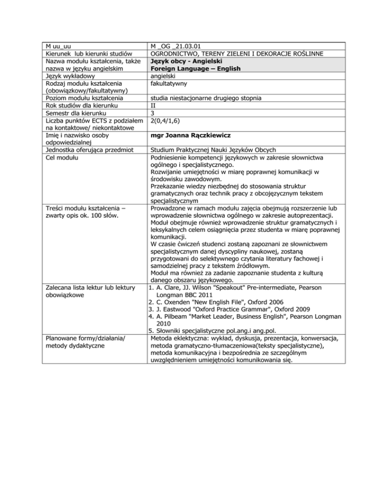 M uu_uu Kierunek lub kierunki studiów Nazwa modułu kształcenia, także nazwa w języku angielskim Język wykładowy Rodzaj modułu kształcenia (obowiązkowy/fakultatywny) Poziom modułu kształcenia Rok studiów dla kierunku Semestr dla kierunku Liczba punktów ECTS z podziałem na kontaktowe/ niekontaktowe Imię i nazwisko osoby odpowiedzialnej Jednostka oferująca przedmiot Cel modułu Treści modułu kształcenia – zwarty opis ok. 100 słów. Zalecana lista lektur lub lektury obowiązkowe Planowane formy/działania/ metody dydaktyczne M _OG _21.03.01 OGRODNICTWO, TERENY ZIELENI I DEKORACJE ROŚLINNE Język obcy - Angielski Foreign Language – English angielski fakultatywny studia niestacjonarne drugiego stopnia II 3 2(0,4/1,6) mgr Joanna Rączkiewicz Studium Praktycznej Nauki Języków Obcych Podniesienie kompetencji językowych w zakresie słownictwa ogólnego i specjalistycznego. Rozwijanie umiejętności w miarę poprawnej komunikacji w środowisku zawodowym. Przekazanie wiedzy niezbędnej do stosowania struktur gramatycznych oraz technik pracy z obcojęzycznym tekstem specjalistycznym Prowadzone w ramach modułu zajęcia obejmują rozszerzenie lub wprowadzenie słownictwa ogólnego w zakresie autoprezentacji. Moduł obejmuje również wprowadzenie struktur gramatycznych i leksykalnych celem osiągnięcia przez studenta w miarę poprawnej komunikacji. W czasie ćwiczeń studenci zostaną zapoznani ze słownictwem specjalistycznym danej dyscypliny naukowej, zostaną przygotowani do selektywnego czytania literatury fachowej i samodzielnej pracy z tekstem źródłowym. Moduł ma również za zadanie zapoznanie studenta z kulturą danego obszaru językowego. 1. A. Clare, JJ. Wilson "Speakout" Pre-intermediate, Pearson Longman BBC 2011 2. C. Oxenden "New English File", Oxford 2006 3. J. Eastwood "Oxford Practice Grammar", Oxford 2009 4. A. Pilbeam "Market Leader, Business English", Pearson Longman 2010 5. Słowniki specjalistyczne pol.ang.i ang.pol. Metoda eklektyczna: wykład, dyskusja, prezentacja, konwersacja, metoda gramatyczno-tłumaczeniowa(teksty specjalistyczne), metoda komunikacyjna i bezpośrednia ze szczególnym uwzględnieniem umiejętności komunikowania się.