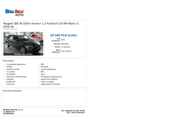 Peugeot 308 T8 (2014-) Active+ 1.2 PureTech 110 KM Warto !!!, 2016 rok Kod oferty: BMA-1076 69 900 PLN brutto Rok 2016 produkcji: Wersja: Hatchback Silnik: 1.2 benzyna Kolor Szary metallic nadwozia: Wyposażenie: - 6 x poduszka powietrzna alufelgi centralny zamek el. lusterka immobiliser kierownica wielofunkcyjna komputer światła LED tempomat - ABS Bluetooth czujnik parkowania ESP Isofix klimatyzacja automatyczna ogranicznik prędkości system nawigacji wspomaganie kierownicy Informacje dodatkowe: Budmat Auto Sp. z o. o. ul. Bielska 67 09-400 Płock Tel.: Peugeot: 24 267 47 60 Fax: +48 24 2674723