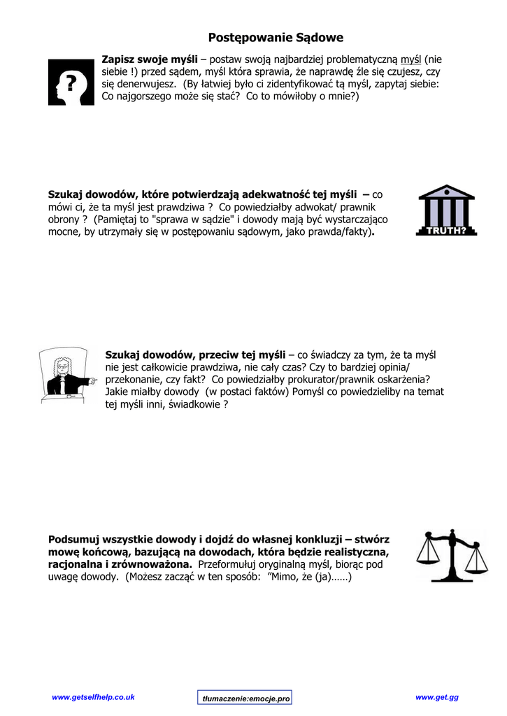 Postępowanie Sądowe Zapisz swoje myśli – postaw swoją najbardziej problematyczną myśl (nie siebie !) przed sądem, myśl która sprawia, że naprawdę źle się czujesz, czy się denerwujesz. (By łatwiej było ci zidentyfikować tą myśl, zapytaj siebie: Co najgorszego może się stać? Co to mówiłoby o mnie?) Szukaj dowodów, które potwierdzają adekwatność tej myśli – co mówi ci, że ta myśl jest prawdziwa ? Co powiedziałby adwokat/ prawnik obrony ? (Pamiętaj to "sprawa w sądzie" i dowody mają być wystarczająco mocne, by utrzymały się w postępowaniu sądowym, jako prawda/fakty). Szukaj dowodów, przeciw tej myśli – co świadczy za tym, że ta myśl nie jest całkowicie prawdziwa, nie cały czas? Czy to bardziej opinia/ przekonanie, czy fakt? Co powiedziałby prokurator/prawnik oskarżenia? Jakie miałby dowody (w postaci faktów) Pomyśl co powiedzieliby na temat tej myśli inni, świadkowie ? Podsumuj wszystkie dowody i dojdź do własnej konkluzji – stwórz mowę końcową, bazującą na dowodach, która będzie realistyczna, racjonalna i zrównoważona. Przeformułuj oryginalną myśl, biorąc pod uwagę dowody. (Możesz zacząć w ten sposób: ”Mimo, że (ja)……) www.getselfhelp.co.uk tłumaczenie:emocje.pro www.get.gg