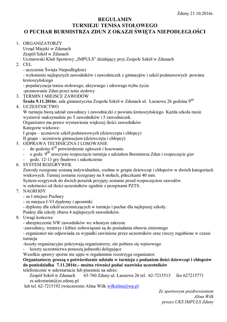Zduny 21.10.2016r. REGULAMIN TURNIEJU TENISA STOŁOWEGO O PUCHAR BURMISTRZA ZDUN Z OKAZJI ŚWIĘTA NIEPODLEGŁOŚCI 1. ORGANIZATORZY Urząd Miejski w Zdunach Zespół Szkół w Zdunach Uczniowski Klub Sportowy „IMPULS” działający przy Zespole Szkół w Zdunach 2. CEL - uczczenie Święta Niepodległości - wyłonienie najlepszych zawodników i zawodniczek z gimnazjów i szkól podstawowych powiatu krotoszyńskiego - popularyzacja tenisa stołowego, aktywnego i zdrowego trybu życia -promowanie Zdun przez tenis stołowy 3. TERMIN I MIEJSCE ZAWODÓW Środa 9.11.2016r. sala gimnastyczna Zespołu Szkół w Zdunach ul. Łacnowa 26 godzina 900 4. UCZESTNICTWO W turnieju biorą udział zawodnicy i zawodniczki z powiatu krotoszyńskiego. Każda szkoła może wystawić maksymalnie po 5 zawodników i 5 zawodniczek. Organizator ma prawo wystawienia większej ilości zawodników Kategorie wiekowe: I grupa – uczniowie szkół podstawowych (dziewczęta i chłopcy) II grupa – uczniowie gimnazjum (dziewczęta i chłopcy) 5. ODPRAWA TECHNICZNA I LOSOWANIE - do godziny 830 potwierdzenie zgłoszeń i losowanie. - o godz. 900 uroczyste rozpoczęcie turnieju z udziałem Burmistrza Zdun i rozpoczęcie gier - godz. 12-13 gry finałowe i zakończenie 6. SYSTEM ROZGRYWEK Zawody rozegrane zostaną indywidualnie, osobno w grupie dziewcząt i chłopców w dwóch kategoriach wiekowych. Turniej zostanie rozegrany na 8 stołach, piłeczkami 40 mm. System rozgrywek do dwóch porażek przyjęty zostanie przed rozpoczęciem zawodów w zależności od ilości uczestników zgodnie z przepisami PZTS. 7. NAGRODY - za I miejsce Puchary - za miejsca I-VI dyplomy i upominki - dyplomy dla szkół uczestniczących w turnieju i puchar dla najlepszej szkoły. Punkty dla szkoły zbiera 4 najlepszych zawodników. 8. Uwagi końcowe - ubezpieczenie NW zawodników we własnym zakresie -zawodnicy, trenerzy i kibice zobowiązani są do posiadania obuwia zmiennego - organizator nie odpowiada za wypadki zawinione przez uczestników oraz rzeczy zagubione w czasie turnieju -koszty organizacyjne pokrywają organizatorzy, nie pobiera się wpisowego - koszty uczestnictwa ponoszą jednostki delegujące Wszelkie sprawy sporne nie ujęte w regulaminie rozstrzyga organizator. Organizatorzy proszą o potwierdzenie udziału w turnieju z podaniem ilości dziewcząt i chłopców do poniedziałku 7.11.2016r.- można również podać nazwiska uczestników telefonicznie w sekretariacie lub pisemnie na adres: Zespół Szkół w Zdunach 63-760 Zduny ul. Łacnowa 26 tel. 62-7215513 fax 627215771 [email protected] lub tel. 62-7215192 (wieczorem) Alina Wilk [email protected] Ze sportowym pozdrowieniem Alina Wilk prezes UKS IMPULS Zduny