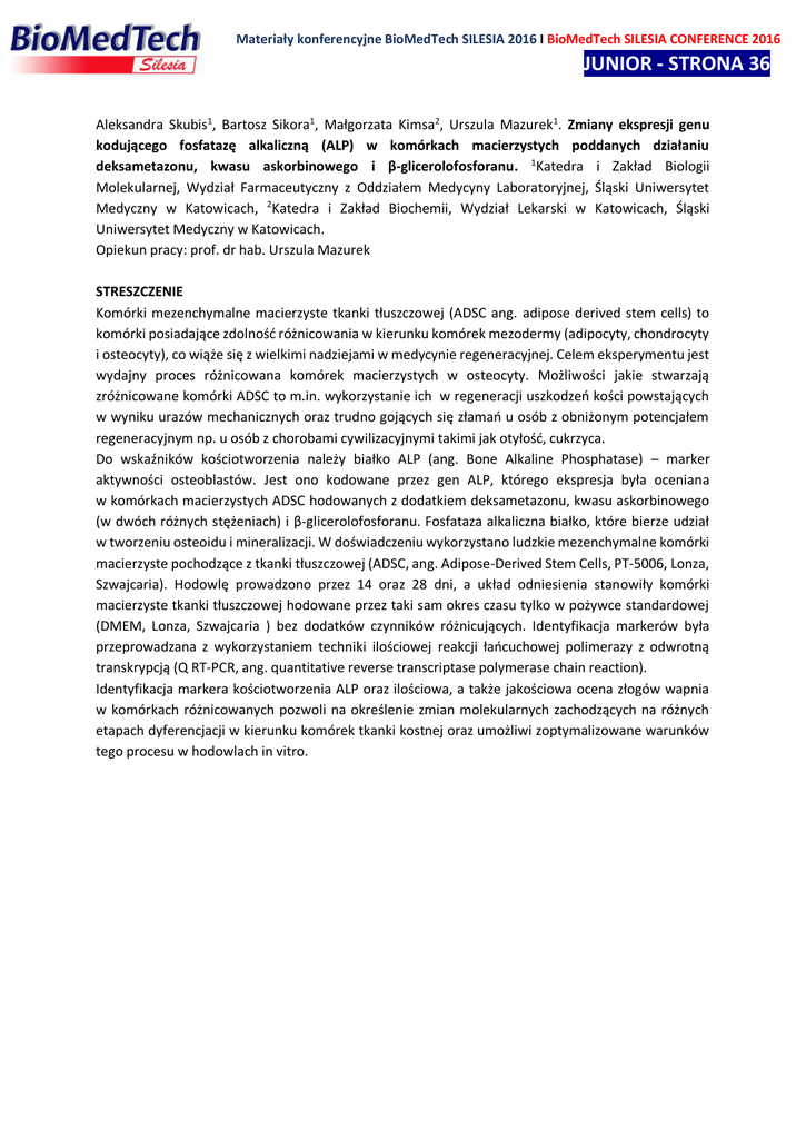 Materiały konferencyjne BioMedTech SILESIA 2016 I BioMedTech SILESIA CONFERENCE 2016 JUNIOR - STRONA 362 Aleksandra Skubis1, Bartosz Sikora1, Małgorzata Kimsa2, Urszula Mazurek1. Zmiany ekspresji genu kodującego fosfatazę alkaliczną (ALP) w komórkach macierzystych poddanych działaniu deksametazonu, kwasu askorbinowego i β-glicerolofosforanu. 1Katedra i Zakład Biologii Molekularnej, Wydział Farmaceutyczny z Oddziałem Medycyny Laboratoryjnej, Śląski Uniwersytet Medyczny w Katowicach, 2Katedra i Zakład Biochemii, Wydział Lekarski w Katowicach, Śląski Uniwersytet Medyczny w Katowicach. Opiekun pracy: prof. dr hab. Urszula Mazurek STRESZCZENIE Komórki mezenchymalne macierzyste tkanki tłuszczowej (ADSC ang. adipose derived stem cells) to komórki posiadające zdolność różnicowania w kierunku komórek mezodermy (adipocyty, chondrocyty i osteocyty), co wiąże się z wielkimi nadziejami w medycynie regeneracyjnej. Celem eksperymentu jest wydajny proces różnicowana komórek macierzystych w osteocyty. Możliwości jakie stwarzają zróżnicowane komórki ADSC to m.in. wykorzystanie ich w regeneracji uszkodzeń kości powstających w wyniku urazów mechanicznych oraz trudno gojących się złamań u osób z obniżonym potencjałem regeneracyjnym np. u osób z chorobami cywilizacyjnymi takimi jak otyłość, cukrzyca. Do wskaźników kościotworzenia należy białko ALP (ang. Bone Alkaline Phosphatase) – marker aktywności osteoblastów. Jest ono kodowane przez gen ALP, którego ekspresja była oceniana w komórkach macierzystych ADSC hodowanych z dodatkiem deksametazonu, kwasu askorbinowego (w dwóch różnych stężeniach) i β-glicerolofosforanu. Fosfataza alkaliczna białko, które bierze udział w tworzeniu osteoidu i mineralizacji. W doświadczeniu wykorzystano ludzkie mezenchymalne komórki macierzyste pochodzące z tkanki tłuszczowej (ADSC, ang. Adipose-Derived Stem Cells, PT-5006, Lonza, Szwajcaria). Hodowlę prowadzono przez 14 oraz 28 dni, a układ odniesienia stanowiły komórki macierzyste tkanki tłuszczowej hodowane przez taki sam okres czasu tylko w pożywce standardowej (DMEM, Lonza, Szwajcaria ) bez dodatków czynników różnicujących. Identyfikacja markerów była przeprowadzana z wykorzystaniem techniki ilościowej reakcji łańcuchowej polimerazy z odwrotną transkrypcją (Q RT-PCR, ang. quantitative reverse transcriptase polymerase chain reaction). Identyfikacja markera kościotworzenia ALP oraz ilościowa, a także jakościowa ocena złogów wapnia w komórkach różnicowanych pozwoli na określenie zmian molekularnych zachodzących na różnych etapach dyferencjacji w kierunku komórek tkanki kostnej oraz umożliwi zoptymalizowane warunków tego procesu w hodowlach in vitro.