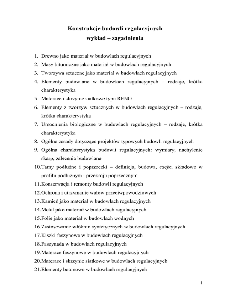 Konstrukcje budowli regulacyjnych wykład – zagadnienia 1. Drewno jako materiał w budowlach regulacyjnych 2. Masy bitumiczne jako materiał w budowlach regulacyjnych 3. Tworzywa sztuczne jako materiał w budowlach regulacyjnych 4. Elementy budowlane w budowlach regulacyjnych – rodzaje, krótka charakterystyka 5. Materace i skrzynie siatkowe typu RENO 6. Elementy z tworzyw sztucznych w budowlach regulacyjnych – rodzaje, krótka charakterystyka 7. Umocnienia biologiczne w budowlach regulacyjnych – rodzaje, krótka charakterystyka 8. Ogólne zasady dotyczące projektów typowych budowli regulacyjnych 9. Ogólna charakterystyka budowli regulacyjnych: wymiary, nachylenie skarp, zalecenia budowlane 10.Tamy podłuŜne i poprzeczki – definicja, budowa, części składowe w profilu podłuŜnym i przekroju poprzecznym 11.Konserwacja i remonty budowli regulacyjnych 12.Ochrona i utrzymanie wałów przeciwpowodziowych 13.Kamień jako materiał w budowlach regulacyjnych 14.Metal jako materiał w budowlach regulacyjnych 15.Folie jako materiał w budowlach wodnych 16.Zastosowanie włóknin syntetycznych w budowlach regulacyjnych 17.Kiszki faszynowe w budowlach regulacyjnych 18.Faszynada w budowlach regulacyjnych 19.Materace faszynowe w budowlach regulacyjnych 20.Materace i skrzynie siatkowe w budowlach regulacyjnych 21.Elementy betonowe w budowlach regulacyjnych 1 22.Umocnienia biologiczne w budowlach regulacyjnych – działanie, kryteria doboru 23.Ogólne zasady wykonywania umocnień technicznych 24.Rodzaje budowli regulacyjnych – bardzo krótka charakterystyka (zastosowanie) 25.Zdefiniuj: (1) rzeki górskie, (2) potoki górskie, (3) rzeki nizinne 26.Zdefiniuj: (1) zwierciadło wody miarodajnej, (2) zwierciadło wody normalnej, (3) zwierciadło wody budowlanej 27.Części składowe ostrogi w profilu podłuŜnym (rysunek) 28.Ostroga faszynadowa – budowa części przynurtowej i przybrzeŜnej (rysunek) 29.Budowa ostrogi systemem wyrzutkowym 30.Konstrukcja opaski materacowo – faszynadowej 31.Konstrukcja opaski materacowej 32.Koryto Ŝeglowne rzeki Warty w Poznaniu 33.Tamy podłuŜne – definicja, budowa, części składowe w profilu podłuŜnym i przekroju poprzecznym 34.Poprzeczki – definicja, budowa, części składowe w profilu podłuŜnym i przekroju poprzecznym 35.Konstrukcja tamy faszynadowej 36.Konstrukcja tamy materacowej 37.Konstrukcja tamy materacowo-kamiennej 38.Kolejność wykonywania umocnień na danym odcinku rzeki w danym okresie czasu 39.Elementy podlegające kontroli podczas oceny dokładności wykonania budowli regulacyjnych 40.Najczęściej spotykane uszkodzenia budowli regulacyjnych 2