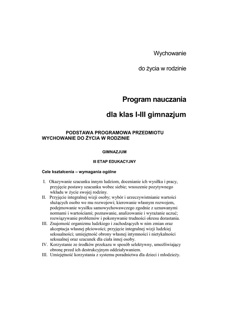 Wychowanie do życia w rodzinie Program nauczania dla klas I-III gimnazjum PODSTAWA PROGRAMOWA PRZEDMIOTU WYCHOWANIE DO ŻYCIA W RODZINIE GIMNAZJUM III ETAP EDUKACYJNY Cele kształcenia – wymagania ogólne I. Okazywanie szacunku innym ludziom, docenianie ich wysiłku i pracy, przyjęcie postawy szacunku wobec siebie; wnoszenie pozytywnego wkładu w życie swojej rodziny. II. Przyjęcie integralnej wizji osoby; wybór i urzeczywistnianie wartości służących osobo we mu rozwojowi; kierowanie własnym rozwojem, podejmowanie wysiłku samowychowawczego zgodnie z uznawanymi normami i wartościami; poznawanie, analizowanie i wyrażanie uczuć; rozwiązywanie problemów i pokonywanie trudności okresu dorastania. III. Znajomość organizmu ludzkiego i zachodzących w nim zmian oraz akceptacja własnej płciowości; przyjęcie integralnej wizji ludzkiej seksualności; umiejętność obrony własnej intymności i nietykalności seksualnej oraz szacunek dla ciała innej osoby. IV. Korzystanie ze środków przekazu w sposób selektywny, umożliwiający obronę przed ich destrukcyjnym oddziaływaniem. III. Umiejętność korzystania z systemu poradnictwa dla dzieci i młodzieży. Treści nauczania – wymagania szczegółowe 1. Rozwój człowieka: faza prenatalna, narodziny, faza niemowlęca, dziecięca, dojrzewania, młodości, wieku średniego, wieku późnego. Życie jako funda mentalna wartość. 2. Budowa prawidłowych relacji z rodzicami. Konflikt pokoleń; przyczyny i sposoby rozwiązywania konfliktów. Odpowiedzialność wszystkich za atmosferę panującą w rodzinie. Rodzina niepełna. 3. Rola autorytetów w życiu człowieka. 4. Relacje międzyosobowe i ich znaczenie. Przyjaźń, zakochanie, miłość; pierwsze fascynacje, miłość platoniczna, miłość młodzieńcza, miłość dojrzała. 5. Zachowania asertywne. 6. Podstawowe informacje o rozwoju seksualnym człowieka: tożsamość płciowa: kobiecość i męskość. 7. Dojrzewanie. Rozumienie i akceptacja kryteriów dojrzałości biologicznej, psychicznej i społecznej. 8. Problemy i trudności okresu dojrzewania (napięcia seksualne, masturbacja), sposoby radzenia sobie z nimi, pomoc w rozeznaniu sytuacji wymagających porady lekarza lub innych specjalistów. 9. Różnice w rozwoju psychoseksualnym dziewcząt i chłopców; postawy i wzajemne oczekiwania 10. Zagrożenia okresu dojrzewania: presja seksualna, uzależnienia, pornografia, prostytucja nieletnich. 11. Główne funkcje płciowości: wyrażanie miłości, budowanie więzi i rodzicielstwo. 12. Inicjacja seksualna; związek pomiędzy aktywnością seksualną a miłością i odpowiedzialnością; dysfunkcje związane z przedmiotowym traktowaniem człowieka w dziedzinie seksualnej. Ryzyko związane z wczesną inicjacją. 13. Kształtowanie i akceptacja tożsamości płciowej. Możliwości pomocy w pokonywaniu trudności związanych z tożsamością płciową. 14. Płodność wspólną sprawą kobiety i mężczyzny. 15. Planowanie rodziny. Metody rozpoznawania płodności. Antykoncepcja – aspekt zdrowotny, psychologiczny i etyczny. 16. Infekcje przenoszone drogą płciową. AIDS: drogi przenoszenia zakażenia, profilaktyka, aspekt społeczny. 17. Wartości związane z seksualnością człowieka: męskość, kobiecość, miłość, małżeństwo, rodzicielstwo. Znaczenie odpowiedzialności w przeżywaniu własnej płciowości oraz budowaniu trwałych i szczęśliwych więzi. 18. Wpływ sposobu spędzania wolnego czasu (w tym korzystania ze środków masowego przekazu) na człowieka. 2 Osiągnięcia uczniów 1. Znajomość organizmu ludzkiego i zachodzących w nim zmian oraz akceptacja własnej płciowości. 2. Rozeznawanie, analizowanie i wyrażanie uczuć. 3. Kierowanie własnym rozwojem; podejmowanie wysiłku samowychowawczego. 4. Przyjęcie integralnej wizji ludzkiej seksualności. 5. Umiejętność obrony własnej intymności i nietykalności seksualnej oraz szacunek dla ciała innej osoby. 6. Korzystanie ze środków masowego przekazu w sposób selektywny, umożliwiający obronę przed ich destrukcyjnym oddziaływaniem. 7. Wnoszenie pozytywnego wkładu w życie swojej rodziny. 8. Wyrażanie szacunku dla siebie oraz innych ludzi, ich wysiłku i pracy. 3 PROGRAM NAUCZANIA W RODZINIE” „WYCHOWANIA DO ŻYCIA KLASA l Cele kształcenia i wychowania W wyniku realizacji programu „Wychowanie do życia w rodzinie” uczeń powinien: ZDOBYĆ WIADOMOŚCI W ZAKRESIE: • roli rodziny w życiu człowieka; • podobieństw i różnic między przyjaźnią a miłością; • zachowań asertywnych; • budowy i funkcjonowania układów rozrodczych: męskiego i żeńskiego; • zmian fizycznych i psychicznych okresu dojrzewania; • etapów dojrzewania; • higieny życia codziennego. OPANOWAĆ UMIEJĘTNOŚCI W ZAKRESIE: • dokonywania samooceny; • budowania prawidłowych relacji z rodziną, kolegami, przyjaciółmi; • przewidywania konsekwencji swoich zachowań; • rozwiązywania konfliktów; • formułowania i realizowania celów życiowych; • odróżniania zakochania od miłości; • rozróżniania faz pokwitania; • postępowania zgodnego z zasadami higienicznego trybu życia. PREZENTOWAĆ POSTAWY: • Poszanowanie siebie i innych. • Chęć pracy nad sobą. • Odpowiedzialności za swoje postępowanie oraz tworzoną przez siebie atmosferę w domu, wśród kolegów, w szkole. • Otwartości na wchodzenia w role społeczne i budowanie relacji z ludźmi • Wrażliwość na uczucia innych. • Chęć pokonywania trudności życiowych. • Docenianie roli rodziny. • Asertywnych zachowań w relacjach międzyludzkich. • Potrzeby rozwiązywania konfliktów. • Odpowiedzialność za własne zdrowie. 4 Treści nauczania, przewidywane osiągnięcia uczniów oraz procedury osiągania celów Treści 1 1. Rola koleżeństwa i przyjaźni w życiu człowieka. Osiągnięcia uczniów Procedury osiągania celów 1. Uświadomienie sobie własnego udziału w budowaniu wspólnoty gr