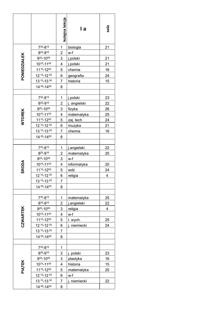 PONIEDZIAŁEK biologia w-f j.polski j.polski 21 21 13 10-13 55 6 7 geografia historia 24 15 730-815 825-910 920-1005 1015-1100 1115-1200 12 10-12 55 13 10-13 55 1 2 3 4 5 6 7 j.polski j. angielski fizyka matematyka zaj. tech muzyka chemia 23 22 26 25 24 21 16 730-815 825-910 920-1005 1015-1100 1115-1200 12 10-12 55 13 10-13 55 1 2 3 4 5 6 7 j.angielski matematyka w-f informatyka wdż religia 22 25 730-815 825-910 920-1005 1015-1100 1115-1200 12 10-12 55 13 10-13 55 1 2 3 4 5 6 7 matematyka j.angielski religia w-f l. wych. j. niemiecki 25 22 4 730-815 825-910 920-1005 1015-1100 1115-1200 12 10-12 55 13 10-13 55 1 2 3 4 5 6 7 j. polski plastyka historia matematyka w-f j. niemiecki 23 16 15 25 1115-1200 12 10-12 55 WTOREK ŚRODA 14 05-1450 14 05-1450 CZWARTEK sala 1 2 3 4 14 05-1450 14 05-1450 PIĄTEK kolejna lekcja 730-815 825-910 920-1005 1015-1100 Ia 14 05-1450 5 8 8 chemia 21 16 20 24 4 8 25 24 8 8 22 1 2 3 4 geografia w-f historia biologia 12 10-12 55 6 7 j.angielski 25 1115-1200 13 10-13 55 ŚRODA 5 j.polski 24 15 16 21 14 05-1450 8 730-815 825-910 920-1005 1015-1100 1115-1200 12 10-12 55 13 10-13 55 1 2 3 4 5 6 7 j.angielski j.niemiecki chemia fizyka muzyka religia matematyka 22 21 16 26 21 4 24 730-815 825-910 920-1005 1015-1100 1115-1200 12 10-12 55 13 10-13 55 1 2 3 4 5 6 7 matematyka j.niemiecki w-f j.polski j.polski wdż 24 4 730-815 825-910 920-1005 1015-1100 1115-1200 12 10-12 55 13 10-13 55 1 2 3 4 5 6 7 matematyka historia j.angielski w-f l.wych chemia informatyka 26 15 22 730-815 825-910 920-1005 1015-1100 1115-1200 12 10-12 55 13 10-13 55 1 2 3 4 5 6 7 j.polski plastyka religia za. tech matematyka w-f 23 4 4 21 26 14 05-1450 CZWARTEK sala kolejna lekcja PONIEDZIAŁEK WTOREK 730-815 825-910 920-1005 1015-1100 14 05-1450 14 05-1450 PIĄTEK I b 14 05-1450 8 21 21 16 8 8 8 16 16 20 1 2 3 4 matematyka j.ang/inf. w-f j.ang/j.niem 12 10-12 55 6 7 chemia j.niem. 1115-1200 13 10-13 55 ŚRODA j.polski 15 22/20 4/5 23 16 22 14 05-1450 8 730-815 825-910 920-1005 1015-1100 1115-1200 12 10-12 55 13 10-13 55 1 2 3 4 5 6 7 chemia biologia religia w-f fizyka matematyka muzyka 730-815 825-910 920-1005 1015-1100 1115-1200 12 10-12 55 13 10-13 55 1 2 3 4 5 6 7 matematyka j.ang/j.niem. historia w-f zaj.tech. j.polski 24 22/5 15 730-815 825-910 920-1005 1015-1100 1115-1200 12 10-12 55 13 10-13 55 1 2 3 4 5 6 7 j.polski j.polski historia j.niem/j.ang, l.wych matematyka j.angielski 23 23 15 22/24 23 26 21 730-815 825-910 920-1005 1015-1100 1115-1200 12 10-12 55 13 10-13 55 1 2 3 4 5 6 7 plastyka wdż inf./j.ang geografia w-f religia 21 15 22/20 24 14 05-1450 CZWARTEK 5 sala kolejna lekcja PONIEDZIAŁEK WTOREK 730-815 825-910 920-1005 1015-1100 14 05-1450 14 05-1450 PIĄTEK I c 14 05-1450 8 8 8 8 16 16 4 26 24 21 26 23 4 1 2 3 4 chemia matematyka geografia fizyka 16 25 24 26 12 10-12 55 6 7 j. polski zaj. art.. 21 15 1115-1200 13 10-13 55 ŚRODA 5 zaj.tech. 25 14 05-1450 8 730-815 825-910 920-1005 1015-1100 1115-1200 12 10-12 55 13 10-13 55 1 2 3 4 5 6 7 historia w-f matematyka biologia j.angielski wos 15 730-815 825-910 920-1005 1015-1100 1115-1200 12 10-12 55 13 10-13 55 1 2 3 4 5 6 7 chemia j.angielski j.polski religia j. niemiecki w-f wdż 16 22 21 4 16 730-815 825-910 920-1005 1015-1100 1115-1200 12 10-12 55 13 10-13 55 1 2 3 4 5 6 7 j.angielski w-f j,polski religia l.wych matematyka 22 730-815 825-910 920-1005 1015-1100 1115-1200 12 10-12 55 13 10-13 55 1 2 3 4 5 6 7 fizyka matematyka j.polski j.polski biologia historia w-f 26 24 23 23 16 15 14 05-1450 CZWARTEK sala kolejna lekcja PONIEDZIAŁEK WTOREK 730-815 825-910 920-1005 1015-1100 14 05-1450 14 05-1450 PIĄTEK II a 14 05-1450 25 16 22 15 8 8 16 21 4 15 25 8 8 PONIEDZIAŁEK WTOREK 1115-1200 12 10-12 55 13 10-13 55 ŚRODA sala j.polski j.polski matematyka zaj. tech. 23 23 25 22 6 7 zaj. art.. j.angielski 4 25 5 fizyka 26 8 730-815 825-910 920-1005 1015-1100 1115-1200 12 10-12 55 13 10-13 55 1 2 3 4 5 6 7 matematyka w-f j. niemiecki j. angielski Wos biologia 25 730-815 825-910 920-1005 1015-1100 1115-1200 12 10-12 55 13 10-13 55 1 2 3 4 5 6 7 j.polski chemia historia fizyka matematyka w-f religia 23 16 15 26 25 730-815 825-910 920-1005 1015-1100 1115-1200 12 10-12 55 13 10-13 55 1 2 3 4 5 6 7 w-f biologia j.polski l.wych. religia j. angielski 730-815 825-910 920-1005 1015-1100 1115-1200 12 10-12 55 13 10-13 55 1 2 3 4 5 6 7 wdż j.polski historia matematyka j.niemiecki geografia w-f 14 05-1450 CZWARTEK 1 2 3 4 14 05-1450 14 05-1450 14 05-1450 PIĄTEK kolejna lekcja 730-815 825-910 920-1005 1015-1100 II b 14 05-1450 21 22 15 16 8 8 8 8 4 16 23 22 4 22 15 21 15 25 22 24 1 2 3 4 w-f historia j.angielski matematyka 15 22 25 12 10-12 55 6 7 j.polski zaj.tech. 23 26 1115-1200 13 10-13 55 ŚRODA 5 zaj. art. 4 14 05-1450 8 730-815 825-910 920-1005 1015-1100 1115-1200 12 10-12 55 13 10-13 55 1 2 3 4 5 6 7 matematyka historia j.niemiecki biologia fizyka 25 15 21 16 26 730-815 825-910 920-1005 1015-1100 1115-1200 12 10-12 55 13 10-13 55 1 2 3 4 5 6 7 w-f j. angielski j.polski j.polski religia matematyka wos 15 23 23 4 25 15 730-815 825-910 920-1005 1015-1100 1115-1200 12 10-12 55 13 10-13 55 1 2 3 4 5 6 7 w-f matematyka j.polski biologia l.wych. j. angielski religia 25 23 16 20 21 4 730-815 825-910 920-1005 1015-1100 1115-1200 12 10-12 55 13 10-13 55 1 2 3 4 5 6 7 fizyka j.polski w-f geografia j.niemiecki chemia 14 05-1450 CZWARTEK sala kolejna lekcja PONIEDZIAŁEK WTOREK 730-815 825-910 920-1005 1015-1100 14 05-1450 14 05-1450 PIĄTEK II c 14 05-1450 8 8 8 8 26 21 24 22 16 1 2 3 4 matematyka j.polski biologia geografia 25 21 16 24 12 10-12 55 6 7 histroia w-f 15 1115-1200 13 10-13 55 ŚRODA 5 j.niemiecki 22 14 05-1450 8 730-815 825-910 920-1005 1015-1100 1115-1200 12 10-12 55 13 10-13 55 1 2 3 4 5 6 7 w-f j.polski zaj, art.. wos religia EDB 730-815 825-910 920-1005 1015-1100 1115-1200 12 10-12 55 13 10-13 55 1 2 3 4 5 6 7 j.polski j.polski matematyka j. angielski fizyka geografia w-f 730-815 825-910 920-1005 1015-1100 1115-1200 12 10-12 55 13 10-13 
