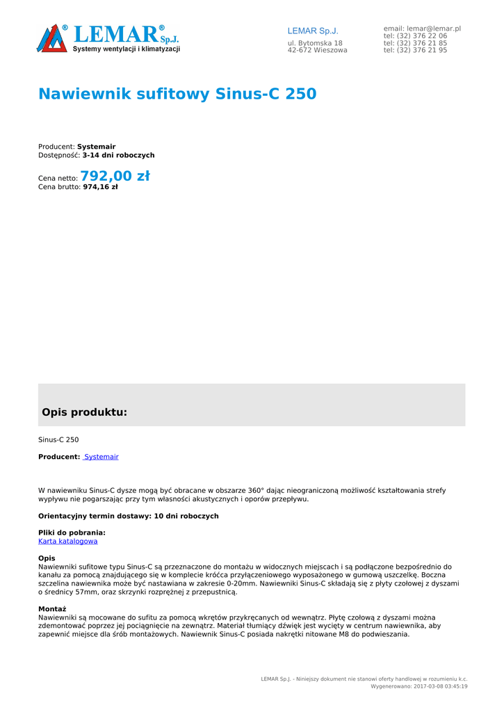 LEMAR Sp.J. ul. Bytomska 18 42-672 Wieszowa email: [email protected] tel: (32) 376 22 06 tel: (32) 376 21 85 tel: (32) 376 21 95 Nawiewnik sufitowy Sinus-C 250 Producent: Systemair Dostępność: 3-14 dni roboczych 792,00 zł Cena netto: Cena brutto: 974,16 zł Opis produktu: Sinus-C 250 Producent: Systemair W nawiewniku Sinus-C dysze mogą być obracane w obszarze 360° dając nieograniczoną możliwość kształtowania strefy wypływu nie pogarszając przy tym własności akustycznych i oporów przepływu. Orientacyjny termin dostawy: 10 dni roboczych Pliki do pobrania: Karta katalogowa Opis Nawiewniki sufitowe typu Sinus-C są przeznaczone do montażu w widocznych miejscach i są podłączone bezpośrednio do kanału za pomocą znajdującego się w komplecie króćca przyłączeniowego wyposażonego w gumową uszczelkę. Boczna szczelina nawiewnika może być nastawiana w zakresie 0-20mm. Nawiewniki Sinus-C składają się z płyty czołowej z dyszami o średnicy 57mm, oraz skrzynki rozprężnej z przepustnicą. Montaż Nawiewniki są mocowane do sufitu za pomocą wkrętów przykręcanych od wewnątrz. Płytę czołową z dyszami można zdemontować poprzez jej pociągnięcie na zewnątrz. Materiał tłumiący dźwięk jest wycięty w centrum nawiewnika, aby zapewnić miejsce dla śrób montażowych. Nawiewnik Sinus-C posiada nakrętki nitowane M8 do podwieszania. LEMAR Sp.J. - Niniejszy dokument nie stanowi oferty handlowej w rozumieniu k.c. Wygenerowano: 2017-03-08 03:45:19 LEMAR Sp.J. ul. Bytomska 18 42-672 Wieszowa email: [email protected] tel: (32) 376 22 06 tel: (32) 376 21 85 tel: (32) 376 21 95 Cena netto: 723,00 PLN Cena brutto: 889,29 PLN LEMAR Sp.J. - Niniejszy dokument nie stanowi oferty handlowej w rozumieniu k.c. Wygenerowano: 2017-03-08 03:45:19 Powered by TCPDF (www.tcpdf.org)
