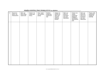 KSIĄŻKA KONTROLI PRAC SPAWALICZYCH na obiekcie ……………………………………………….. # Nazwa budynku i pomieszczenia Data i godzina rozpoczęcia prac Imiona i nazwiska spawaczy Imię i nazwisko kontrolującego Godzina przeprowadzenia kontroli Uwagi i polecenia wydane spawaczom podczas kontroli www.ryszarddziwisinski.strefa.pl/ Data i godzina zakończenia prac spawalniczych Imiona i nazwiska przeprowadzających kontrolę po zakończeniu prac Data i godzina kontroli po zakończeniu prac spawalniczych Popisy osób przeprowadzających kontrolę REJESTR WYKONYWANYCH PRAC NA ZEZWOLENIE PISEMNE na obiekcie ……………………………………………….. # Imię i nazwisko wykonawcy pracy Opis rodzaju pracy do wykonania Data Godz. rozpoczęcia prac 1. 2. 3. 4. 5. 6. 7. 8. 9. 10. 11. 12. 13. 14. 15. 16. 17. 18. www.ryszarddziwisinski.strefa.pl/ Godz. zakończenia prac Podpis wykonawcy pracy Podpis gospodarza obiektu REJESTR PRACOWNIKÓW WCHODZĄCYCH NA TEREN OBIEKTU ……… WYKONUJĄCYCH PRACE BEZ PISEMNEGO ZEZWOLENIA # Imię i nazwisko pracownika Miejsce zatrudnienia Data Podpis pracownika Godz. wejścia 1. 2. 3. 4. 5. 6. 7. 8. 9. 10. 11. 12. 13. 14. 15. 16. www.ryszarddziwisinski.strefa.pl/ Godz. wyjścia Nazwa obiektu Nazwisko i imię wykonawcy pracy Podpis osoby udzielającej zezwolenia wejścia na obiekt ZEZWOLENIE nr ………… NA WYKONYWANIE PRAC ZWIĄZANYCH ZE ŹRÓDŁAMI ZAPŁONU 1. Miejsce pracy: 2. Opis pracy do wykonania: 3. Rodzaj pracy: Spawanie elektryczne; Spawanie gazowe; Cięcie szlifierką; 4. Techniczne środki bezpieczeństwa Usunąć wszystkie ruchome przedmioty i substancje palne, łącznie z osadami Cięcie gazem; Lutowanie; Inne: ………………………………… pyłu palnego w promieniu …… m Zabezpieczyć materiałami ochronnymi nieruchome przedmioty palne Zabezpieczyć materiałami ochronnymi wszystkie otwory w pomieszczeniu Odizolować rurociągi Odłączyć urządzenie: zaślepką / zaworem / blokadą*, inne ………………………………… Zabezpieczenie prac w sprzęt gaśniczy: koc / gaśnica*, inne ………………………………… 5. Środki organizacyjne: Zapoznanie wykonawcy prac z rodzajem zagrożeń na stanowisku pracy i obowiązującymi instrukcjami Wymienić numery instrukcji: …………………………………. Zabezpieczenie prac obecnością jednostki straży pożarnej Zabezpieczenie prac obecnością ratownictwa chemicznego 6. Wymagane środki ochrony indywidualnej (wymienić): 7. Bezpośredni nadzór nad pracą sprawuje: Imię i nazwisko: Podpis: 8. Rozpoczęcie pracy: Data: Godzina: 9. Podpisy: Gospodarz obiektu: Wykonawca prac: 10. Zakończenie pracy: Data: Godzina: 11. Podpisy: Gospodarz obiektu: Wykonawca prac: Uwaga! Odpowiednie prostokąty zaznaczyć „X”. * - Niepotrzebne skreślić. www.ryszarddziwisinski.strefa.pl/ ZEZWOLENIE nr ………… NA WYKONYWANIE PRAC ZBIORNIKACH, ARARATACH I KANALIZACJI 1. Miejsce pracy: 2. Opis rodzaju pracy: 3. Zezwolenie obowązuje: Data: 4. Gospodarz obiektu: Imię i nazwisko: 5. Zabezpiecza gospodarz obiektu: Opróżnienie obiektu z substancji palnej Godzina: Data: Godzina: Podpis: Przedmuchanie parą / gazem obojętnym / powietrzem* Odłączenie napięcia: tak/nie* Imię i nazwisko elektryka Podpis: . Pomiary granic wybuchowośc:i tak/nie* Imię i nazwisko Podpis: Asekuracja tak/nie* Imię i nazwisko Podpis: Zapoznanie wykonawcy prac z rodzajem zagrożeń na stanowisku pracy i obowiązującymi instrukcjami Wpisać nr instrukcji: 6. Zabezpiecza wykonawca pracy: Środki ochrony indywidualnej Zabezpieczenie terenu . Oświetlenie: 24 V: tak/nie* Wentylacja zbiornika / aparatu / kanalizacji* : tak/nie* Rusztowanie: tak/nie* Sprzęt gaśniczy: koc, gaśnica*, inne: Rodzaj sygnalizacji: wzrokowy / słuchowy / przy użyciu linki*, inne ………………. Eksplozymetr/czujnik (10% DGW): tak/nie*; Czyjnik tlenu (18%.): tak/nie* Narzędzia nieiskrzące: tak/nie* 7. Oświadczam, że znam warunki wykonywania pracy w zbiorniku, aparacie, kanalizacji* i zobowiązuję się do ich przestrzegania. Wykonawca pracy: Imię i nazwisko: podpis: 8. Stwierdzam wykonanie ustalonych warunków i zastosowanie środków zabezpieczających. Dopuszczam do rozpoczęcia prac. Asekurujący: Imię i nazwisko: podpis: 9. Zakończenie pracy: 10. Stwierdza się, że prace zostały zakończone, środki zabezpieczające usunięte, teren uporządkowany, napięcie podłączone. Podpisy: Gospodarz obiektu: Wykonawca prac: Data: * - Niepotrzebne skreślić. www.ryszarddziwisinski.strefa.pl/ Godzina: ZEZWOLENIE nr ………… NA WYŁĄCZENIE CZUJEK SUBSTANCJI PALNYCH / CZUJEK POŻAROWYCH* 1. Nazwa obiektu: 2. Zezwolenie obowązuje: Data: 3. Zezwolenie obejmuje: Obiekt(y): : Od godz.: Do godz.: Centrale* (typ i lokalizacja): 4. Gospodarz obiektu: Imię i nazwisko: Podpis: 5. Asekurujący: Imię i nazwisko: Podpis: 6. Asekyracja ekplozymetrem: Eksplozymetr (10% DGW): Kontrola: 7. Dopuszczam do wyłączenia czujek: Podpis asekyrującego: 8. tak / nie*; stała / okresowa co ……… minut* Stwierdza się, że wyłączenie czujek zostało zakończone, środki zabezpieczające usunięte. Podpisy: Gospodarz obiektu: Wykonawca prac: * - Niepotrzebne skreślić. www.ryszarddziwisinski.strefa.pl/ ZEZWOLENIE nr ………… NA WJAZD POJAZDU MECHANICZNEGO DO STREFY ZAGROŻENIA WYBUCHEM 1. Nazwa obiektu: 2. Identyfikacja pojazdu: Rodzaj pojazdu: 3. Kierowca: Imię i nazwisko: 4. Zezwolenie obowązuje: Data: 5. Wjazd na obiekt driogami: 6. Osoba pilotująca: tak / nie* 7. Asekyracja ekplozymetrem: 8. Podpisy: Gospodarz obiektu: : Nr rejestracyjny: Od godz.: Imię i nazwisko Eksplozymetr (10% DGW): Kontrola: Do godz.: Podpis: tak / nie*; stała / okresowa co ……… minut* Kierowca: * - Niepotrzebne skreślić. www.ryszarddziwisinski.strefa.pl/ Protokół zabezpieczenia przeciwpożarowego prac stwarzajacych zagrożenie pożarowe Nazwa i określenie budynku, pomieszczenia i miejsca, w którym przewidu