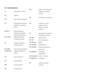 H - Nauki społeczne HQ H nauki społeczne (ogólne) HA statystyka rodzina, wychowanie dzieci i młodzieży, zachowania seksualne HB teoria ekonomii, demografia HC historia ekonomii, ekonomia HS stowarzyszenia i organizacje HT socjologia wsi i miast, gospodarcza wg regionów społeczności, klasy i krajów społeczne, geografia osadnictwa HD 28-70 geografia przemysłu, organizacja i zarządzanie, HV logistyka, public relations HD 72-9999 polityka ekonomiczna, zatrudnienie, przemysł HE transport, komunikacja, geografia transportu HF 1-4055 handel, stosunki gospodarcze HF 5001-6146 marketing, rachunkowość, reklama HG finanse i bankowość HJ finanse publiczne HM socjologia (ogólne) HN historia społeczna opieka społeczna, patologia, kryminologia, terroryzm HV 1-696 opieka społeczna HV 700 rodzina patologiczna HV 1874-875 adopcja HV 1551-3024 niepełnosprawni HV 4997-5840 uzależnienia (alkoholizm, narkomania) HV 6001-8280 kryminologia, kryminalistyka HV 6626-6626.23 przemoc w rodzinie HV 9065-9715.7 resocjalizacja HX socjalizm, komunizm, anarchizm