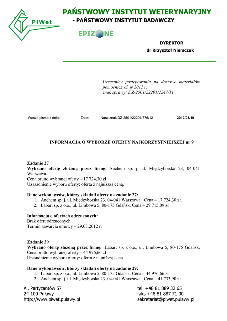 PAŃSTWOWY INSTYTUT WETERYNARYJNY - PAŃSTWOWY INSTYTUT BADAWCZY DYREKTOR dr Krzysztof Niemczuk Uczestnicy postępowania na dostawę materiałów pomocniczych w 2012 r. znak sprawy: DZ-2501/22201/2247/11 Wasze pismo z dnia: Znak: Nasz znak:DZ-2501/22201/876/12 2012/03/19 INFORMACJA O WYBORZE OFERTY NAJKORZYSTNIEJSZEJ nr 9 Zadanie 27 Wybrano ofertę złoŜoną przez firmę: Anchem sp. j. ul. Międzyborska 23, 04-041 Warszawa. Cena brutto wybranej oferty – 17 724,30 zł Uzasadnienie wyboru oferty: oferta z najniŜszą ceną. Dane wykonawców, którzy składali oferty na zadanie 27: 1. Anchem sp. j. ul. Międzyborska 23, 04-041 Warszawa. Cena – 17 724,30 zł. 2. Labart sp. z o.o., ul. Limbowa 5, 80-175 Gdańsk. Cena – 29 715,09 zł Informacja o ofertach odrzuconych: Brak ofert odrzuconych. Termin zawarcia umowy – 29.03.2012 r. Zadanie 29 Wybrano ofertę złoŜoną przez firmę: Labart sp. z o.o., ul. Limbowa 5, 80-175 Gdańsk. Cena brutto wybranej oferty – 44 976,66 zł Uzasadnienie wyboru oferty: oferta z najniŜszą ceną Dane wykonawców, którzy składali oferty na zadanie 29: 1. Labart sp. z o.o., ul. Limbowa 5, 80-175 Gdańsk. Cena – 44 976,66 zł 2. Anchem sp. j. ul. Międzyborska 23, 04-041 Warszawa. Cena – 41 733,90 zł. Al. Partyzantów 57 24-100 Puławy http://www.piwet.pulawy.pl tel. +48 81 889 32 65 faks +48 81 887 71 00 [email protected] 3. Shim-Pol sp. j., ul. Lubomirskiego 5, 05-080 Izabelin. Cena – 54 612,00 zł. Informacja o ofertach odrzuconych: Na podstawie art. 89 ust 1 pkt. 2 ustawy Pzp , zamawiający odrzuca ofertę złoŜoną przez wykonawcę – Anchem sp. j. z siedzibą w Warszawie. Proponowane przez wykonawcę w zad. 29 poz. 8 kapsle do fiolek zostały uznane za niedopuszczalne, poniewaŜ posiadają septę powodującą zatykanie igły w strzykawce autosamplera CTC PAL, co powaŜnie utrudnia pracę. Termin zawarcia umowy – 29.03.2012 r. Zadanie 87 Wybrano ofertę złoŜoną przez firmę: Alchem Grupa Sp. z o.o., ul. Boya-śeleńskiego 25B, 35-959 Rzeszów Cena brutto wybranej oferty – 2091,00 zł. Uzasadnienie wyboru oferty: oferta z najniŜszą ceną Dane wykonawców, którzy składali oferty na zadanie 87: 1. ABO GraŜyna Tarnowska – Boreysza, ul. Wichrowe Wzgórze 123, 80-293 Gdańsk. Cena – 2223,84 zł. 2. Alchem Grupa Sp. z o.o., ul. Boya-śeleńskiego 25B, 35-959 Rzeszów. Cena – 2091,00 zł. 3. Bionovo Aneta Ludwig, ul. Rataja 30, 59-220 Legnica. Cena – 2478,20 zł. 4. Linegal Chemicals sp. z o.o., ul. Kasprzaka 44/52, 01-224 Warszawa. Cena 2424,33 zł. 5. Idalia sp. j., ul. Zubrzyckiego 10, 25-610 Radom. Cena – 2779,80 zł. Informacja o ofertach odrzuconych: Brak ofert odrzuconych Termin zawarcia umowy – 29.03.2012 r. Zadanie 147 Wybrano ofertę złoŜoną przez firmę: Alchem Grupa Sp. z o.o., ul. Boya-śeleńskiego 25B, 35-959 Rzeszów. Cena brutto wybranej oferty – 15 365,16 zł Uzasadnienie wyboru oferty: jedyna oferta złoŜona w postępowaniu Dane wykonawców, którzy składali oferty na zadanie 147: 1. Alchem Grupa Sp. z o.o., ul. Boya-śeleńskiego 25B, 35-959 Rzeszów. Cena – 15 365,16 zł. Informacja o ofertach odrzuconych: Brak ofert odrzuconych Termin zawarcia umowy – 22.03.2012 r. Zadanie 190 Wybrano ofertę złoŜoną przez firmę: Labart sp. z o.o., ul. Limbowa 5, 80-175 Gdańsk Cena brutto wybranej oferty – 4740,22 zł. Uzasadnienie wyboru oferty: oferta z najniŜszą cena Dane wykonawców, którzy składali oferty na zadanie 190: 1. Bionovo Aneta Ludwig, ul. Rataja 30, 59-220 Legnica. Cena – 5658,00 zł. 2. Labart sp. z o.o., ul. Limbowa 5, 80-175 Gdańsk. Cena – 4740,22 zł 3. Alchem Grupa Sp. z o.o., ul. Boya-śeleńskiego 25B, 35-959 Rzeszów. Cena – 5879,40 zł. Informacja o ofertach odrzuconych: Brak ofert odrzuconych Termin zawarcia umowy – 29.03.2012 r. Zadanie 193 Wybrano ofertę złoŜoną przez firmę: Linegal Chemicals sp. z o.o., ul. Kasprzaka 44/52., 01-224 Warszawa Cena brutto wybranej oferty – 3564,54 zł. Uzasadnienie wyboru oferty: oferta z najniŜszą cena Dane wykonawców, którzy składali oferty na zadanie 58: 1. Linegal Chemicals sp. z o.o., ul. Kasprzaka 44/52., 01-224 Warszawa. Cena – 3564,54 zł. 2. Bionovo Aneta Ludwig, ul. Rataja 30, 59-220 Legnica. Cena – 3788,40 zł. 3. Alchem Grupa Sp. z o.o., ul. Boya-śeleńskiego 25B, 35-959 Rzeszów. Cena – 4123,80 zł. Informacja o ofertach odrzuconych: Brak ofert odrzuconych Termin zawarcia umowy – 29.03.2012 r. Zadanie 206 Wybrano ofertę złoŜoną przez firmę: Linegal Chemicals sp. z o.o., ul. Kasprzaka 44/52., 01-224 Warszawa Cena brutto wybranej oferty – 33 108,71 zł. Uzasadnienie wyboru oferty: oferta z najniŜszą cena Dane wykonawców, którzy składali oferty na zadanie 206: 1. Linegal Chemicals sp. z o.o., ul. Kasprzaka 44/52., 01-224 Warszawa. Cena – 33 108,71 zł. 2. Bionovo Aneta Ludwig, ul. Rataja 30, 59-220 Legnica. Cena – 34 399,92 zł. 3. Alchem Grupa Sp. z o.o., ul. Boya-śeleńskiego 25B, 35-959 Rzeszów. Cena – 35 170,47 zł. Informacja o ofertach odrzuconych: Brak ofert odrzuconych Termin zawarcia umowy – 29.03.2012 r. Zadanie 217 Wybrano ofertę złoŜoną przez firmę: Sigma Aldrich sp. z o.o., ul. Szelągowska 30, 61-626 Poznań. Cena brutto wybranej oferty – 2275,00 zł. Uzasadnienie wyboru oferty: oferta z najniŜszą ceną Dane wykonawców, którzy składali oferty na zadanie 217: 1. Sigma Aldrich sp. z o.o., ul. Szelągowska 30, 61-626 Poznań. Cena – 2275,00 zł. 2. Bionovo Aneta Ludwig, ul. Rataja 30, 59-220 Legnica. Cena – 2989,45 zł. Informacja o ofertach odrzuconych: Brak ofert odrzuconych Termin zawarcia umowy – 29.03.2012 r. Zadanie 218 Wybrano ofertę złoŜoną przez firmę: Sigma Aldrich sp. z o.o., ul. Szelągowska 30, 61-626 Poznań. Cena brutto wybranej oferty – 310,70 zł. Uzasadnienie wyboru oferty: oferta z najniŜszą ceną Dane wykonawców, którzy składali oferty na zadanie 218: 1. Sigma Aldrich sp. z o.o., ul. Szelągowska 30, 61-626 Poznań. C