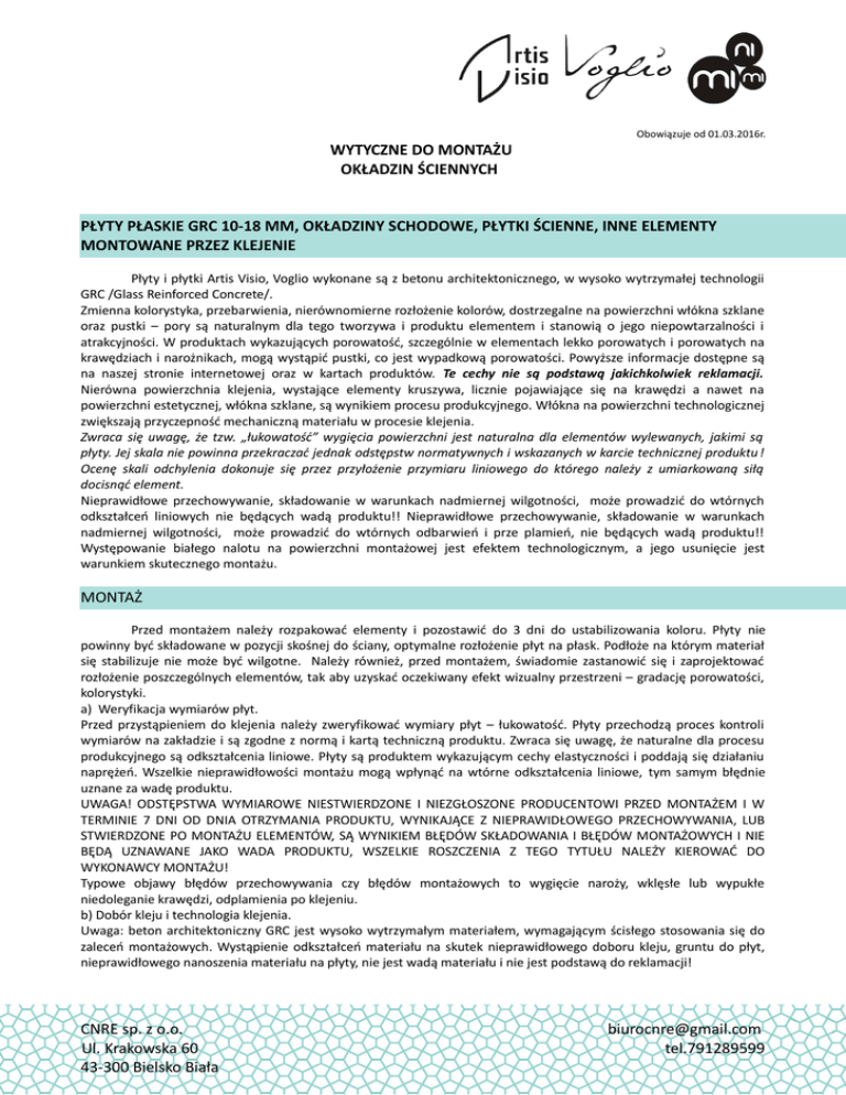 Obowiązuje od 01.03.2016r. WYTYCZNE DO MONTAŻU OKŁADZIN ŚCIENNYCH PŁYTY PŁASKIE GRC 10-18 MM, OKŁADZINY SCHODOWE, PŁYTKI ŚCIENNE, INNE ELEMENTY MONTOWANE PRZEZ KLEJENIE Płyty i płytki Artis Visio, Voglio wykonane są z betonu architektonicznego, w wysoko wytrzymałej technologii GRC /Glass Reinforced Concrete/. Zmienna kolorystyka, przebarwienia, nierównomierne rozłożenie kolorów, dostrzegalne na powierzchni włókna szklane oraz pustki – pory są naturalnym dla tego tworzywa i produktu elementem i stanowią o jego niepowtarzalności i atrakcyjności. W produktach wykazujących porowatość, szczególnie w elementach lekko porowatych i porowatych na krawędziach i narożnikach, mogą wystąpić pustki, co jest wypadkową porowatości. Powyższe informacje dostępne są na naszej stronie internetowej oraz w kartach produktów. Te cechy nie są podstawą jakichkolwiek reklamacji. Nierówna powierzchnia klejenia, wystające elementy kruszywa, licznie pojawiające się na krawędzi a nawet na powierzchni estetycznej, włókna szklane, są wynikiem procesu produkcyjnego. Włókna na powierzchni technologicznej zwiększają przyczepność mechaniczną materiału w procesie klejenia. Zwraca się uwagę, że tzw. „łukowatość” wygięcia powierzchni jest naturalna dla elementów wylewanych, jakimi są płyty. Jej skala nie powinna przekraczać jednak odstępstw normatywnych i wskazanych w karcie technicznej produktu ! Ocenę skali odchylenia dokonuje się przez przyłożenie przymiaru liniowego do którego należy z umiarkowaną siłą docisnąć element. Nieprawidłowe przechowywanie, składowanie w warunkach nadmiernej wilgotności, może prowadzić do wtórnych odkształceń liniowych nie będących wadą produktu!! Nieprawidłowe przechowywanie, składowanie w warunkach nadmiernej wilgotności, może prowadzić do wtórnych odbarwień i prze plamień, nie będących wadą produktu!! Występowanie białego nalotu na powierzchni montażowej jest efektem technologicznym, a jego usunięcie jest warunkiem skutecznego montażu. MONTAŻ Przed montażem należy rozpakować elementy i pozostawić do 3 dni do ustabilizowania koloru. Płyty nie powinny być składowane w pozycji skośnej do ściany, optymalne rozłożenie płyt na płask. Podłoże na którym materiał się stabilizuje nie może być wilgotne. Należy również, przed montażem, świadomie zastanowić się i zaprojektować rozłożenie poszczególnych elementów, tak aby uzyskać oczekiwany efekt wizualny przestrzeni – gradację porowatości, kolorystyki. a) Weryfikacja wymiarów płyt. Przed przystąpieniem do klejenia należy zweryfikować wymiary płyt – łukowatość. Płyty przechodzą proces kontroli wymiarów na zakładzie i są zgodne z normą i kartą techniczną produktu. Zwraca się uwagę, że naturalne dla procesu produkcyjnego są odkształcenia liniowe. Płyty są produktem wykazującym cechy elastyczności i poddają się działaniu naprężeń. Wszelkie nieprawidłowości montażu mogą wpłynąć na wtórne odkształcenia liniowe, tym samym błędnie uznane za wadę produktu. UWAGA! ODSTĘPSTWA WYMIAROWE NIESTWIERDZONE I NIEZGŁOSZONE PRODUCENTOWI PRZED MONTAŻEM I W TERMINIE 7 DNI OD DNIA OTRZYMANIA PRODUKTU, WYNIKAJĄCE Z NIEPRAWIDŁOWEGO PRZECHOWYWANIA, LUB STWIERDZONE PO MONTAŻU ELEMENTÓW, SĄ WYNIKIEM BŁĘDÓW SKŁADOWANIA I BŁĘDÓW MONTAŻOWYCH I NIE BĘDĄ UZNAWANE JAKO WADA PRODUKTU, WSZELKIE ROSZCZENIA Z TEGO TYTUŁU NALEŻY KIEROWAĆ DO WYKONAWCY MONTAŻU! Typowe objawy błędów przechowywania czy błędów montażowych to wygięcie naroży, wklęsłe lub wypukłe niedoleganie krawędzi, odplamienia po klejeniu. b) Dobór kleju i technologia klejenia. Uwaga: beton architektoniczny GRC jest wysoko wytrzymałym materiałem, wymagającym ścisłego stosowania się do zaleceń montażowych. Wystąpienie odkształceń materiału na skutek nieprawidłowego doboru kleju, gruntu do płyt, nieprawidłowego nanoszenia materiału na płyty, nie jest wadą materiału i nie jest podstawą do reklamacji! CNRE sp. z o.o. Ul. Krakowska 60 43-300 Bielsko Biała [email protected] tel.791289599 Powierzchnia techniczna – klejenia płyty, to powierzchnia wyraźnie chropowata, posiadająca wystające kruszywo. Do montażu płyt rekomendowane są kleje i materiały montażowe : Producent Gruntowanie płyt Mostek czepny Klejenie Ardex Ardex PU 30 Piasek kwarcowy Ardex QS fr. 0.-06 mm Wnętrza: Ardex N 23/N 23 W – do białych elementów. Zewnętrzne –: Ardex X 32 Mapei Primer SN, Mapecoat Piasek kwarcowy I24, Eco Prim PU 1K Quarzo 0,5 lub 1,2 Elastorapid, Keraquick, Keraflex Maxi S1 UWAGI Krytycznym dla prawidłowego klejenia jest wykonanie prawidłowego gruntowania strony technicznej płyt przed klejeniem i zastosowanie wskazanych środków gruntujących. Ominięcie tego etapu lub jego nieprawidłowe wykonanie zawsze skutkuje odkształceniem – zniszczeniem płyt, odpadnięciem płyt, co zagraża bezpieczeństwu i nie jest powodem do jakichkolwiek reklamacji. Technologię przygotowania podłoża do klejenia, technologię klejenia należy wykonać zgodnie z instrukcją producenta kleju. Należy zwrócić szczególną uwagę na sposób i technologię nanoszenia materiału na płytki i płyty. Warunek konieczny to szczelne i staranne gruntowanie powierzchni klejenia płyty oraz nanoszenie kleju na pełną powierzchnię płyty bez pozostawiania pustek, niedociągnięć krawędzi. Gwarancja materiału nie obejmuje skutków błędów montażowych lub nieodpowiedniego doboru kleju i technologii klejenia. W przypadku montażu elementów białych, należy stosować kleje białe nie powodujące odbarwień. Niedopuszczalne jest klejenie na powierzchnie gładkie typu gładź tynkowa, powierzchnie malowane, inne tynki gładkie, jak np. stiuki, bez ich wcześniejszego usunięcia. Przyczepność podłoża należy zweryfikować na budowie. Nie dostosowanie się do powyższego zagraża stabilności wiązania i