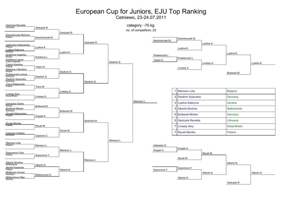 European Cup for Juniors, EJU Top Ranking Cetniewo, 23-24.07.2011 Gedutyte Renalda Lithuania Kazimierczak Martyna Poland Jablonska Aleksandra Poland Lyalina Kateryna Russia Kubikova Leona no. of competitors: 23 Gedutyte R. Kazimierczak M. Poland Maltseva Valentina Lyalina K. Lyalina K. Romania Diedrich Szaundra Poland Livesey Amy Great Britain Gabaidze Dariko Russia Butkereit Miriam Poland Rycak Monika Poland Cojocaru Cristina Romania Mansour Lola Belgium Suprunova Yulia Russia Alberts Nicoline Netherlands Henelt Kasandra Romania Milakumova Olga Ukraine Lyalina K. Livesey A. Diedrich S. Butkereit M. Diedrich S. Diedrich S. Tracz M. Livesey A. Livesey A. Mansour L. Butkereit M. Butkereit M. Grygiel A. Butkereit M. Rycak M. Rycak M. 1 Mansour Lola Belgium 2 Diedrich Szaundra Germany 3 Lyalina Kateryna Ukraine 3 Alberts Nicoline Netherlands 5 Butkereit Miriam Germany 5 Gedutyte Renalda Lithuania 7 Livesey Amy Great Britain 7 Rycak Monika Poland Cojocaru C. Mansour L. Mansour L. Gabaidze D. Mansour L. Grygiel A. Grygiel A. Rycak M. Suprunova Y. Rycak M. Mansour L. Alberts N. Alberts N. Poland Moldovan Ancuta Podelenczki L. Livesey A. Talach K. Germany Grygiel Aleksandra Talach K. Diedrich S. Germany Tracz Malgorzata Lyalina K. Podelenczki L. Kubikova L. Russia Podelenczki Lorena Kazimierczak M. Lyalina K. Lyalina K. Czech Republic Talach Karolina Kazimierczak M. Gedutyte R. Ukraine Anakhina Angelina category: -70 kg. Gedutyte R. Alberts N. Suprunova Y. Suprunova Y. Alberts N. Milakumova O. Alberts N. Alberts N. Gedutyte R.