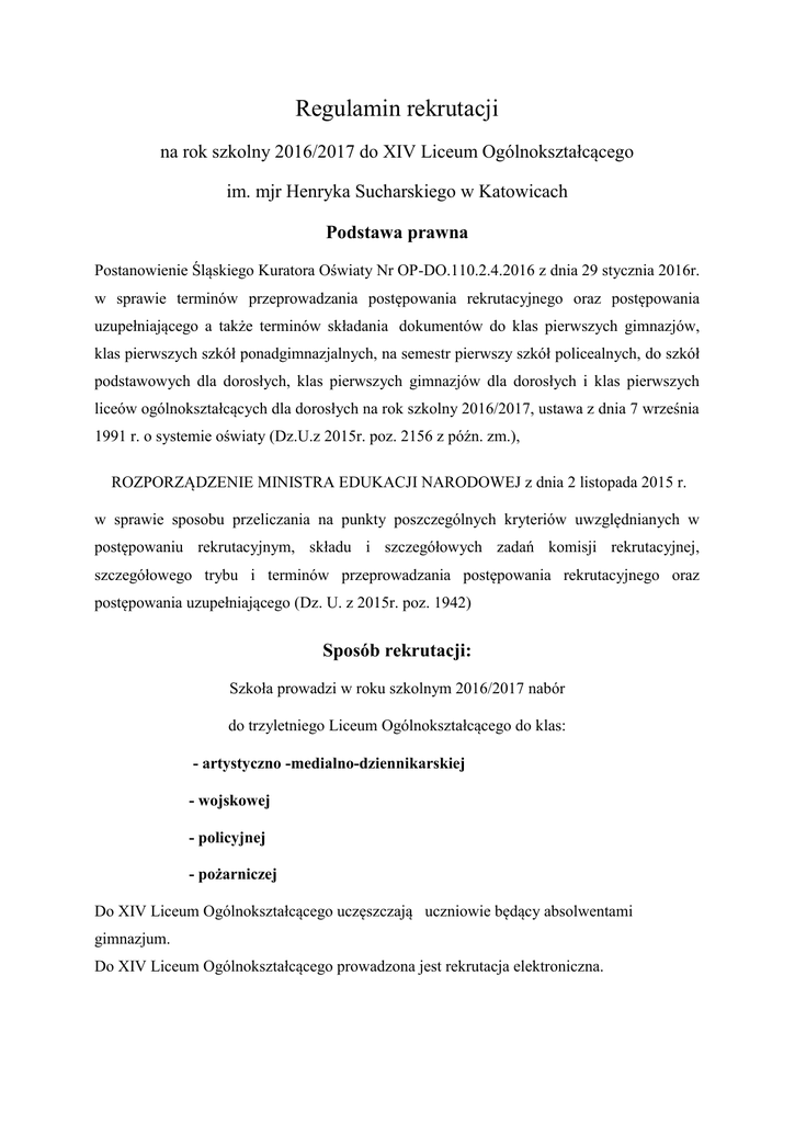 Regulamin rekrutacji na rok szkolny 2016/2017 do XIV Liceum Ogólnokształcącego im. mjr Henryka Sucharskiego w Katowicach Podstawa prawna Postanowienie Śląskiego Kuratora Oświaty Nr OP-DO.110.2.4.2016 z dnia 29 stycznia 2016r. w sprawie terminów przeprowadzania postępowania rekrutacyjnego oraz postępowania uzupełniającego a także terminów składania dokumentów do klas pierwszych gimnazjów, klas pierwszych szkół ponadgimnazjalnych, na semestr pierwszy szkół policealnych, do szkół podstawowych dla dorosłych, klas pierwszych gimnazjów dla dorosłych i klas pierwszych liceów ogólnokształcących dla dorosłych na rok szkolny 2016/2017, ustawa z dnia 7 września 1991 r. o systemie oświaty (Dz.U.z 2015r. poz. 2156 z późn. zm.), ROZPORZĄDZENIE MINISTRA EDUKACJI NARODOWEJ z dnia 2 listopada 2015 r. w sprawie sposobu przeliczania na punkty poszczególnych kryteriów uwzględnianych w postępowaniu rekrutacyjnym, składu i szczegółowych zadań komisji rekrutacyjnej, szczegółowego trybu i terminów przeprowadzania postępowania rekrutacyjnego oraz postępowania uzupełniającego (Dz. U. z 2015r. poz. 1942) Sposób rekrutacji: Szkoła prowadzi w roku szkolnym 2016/2017 nabór do trzyletniego Liceum Ogólnokształcącego do klas: - artystyczno -medialno-dziennikarskiej - wojskowej - policyjnej - pożarniczej Do XIV Liceum Ogólnokształcącego uczęszczają uczniowie będący absolwentami gimnazjum. Do XIV Liceum Ogólnokształcącego prowadzona jest rekrutacja elektroniczna. Zasady punktacji: 1. W przypadku przeliczania na punkty wyników egzaminu gimnazjalnego: 1) wynik przedstawiony w procentach z: a) języka polskiego, b) historii i wiedzy o społeczeństwie, c) matematyki, d) przedmiotów przyrodniczych e) ) języka obcego nowożytnego na poziomie podstawowym - mnoży się przez 0,2; 2. W przypadku przeliczania na punkty ocen z zajęć edukacyjnych wymienionych na świadectwie ukończenia gimnazjum z języka polskiego, matematyki, historii lub wiedzy o społeczeństwie i wychowania fizycznego lub plastyki, za oceny wyrażone w stopniu: 1) celującym - przyznaje się po 20 punktów; 2) bardzo dobrym - przyznaje się po 16 punktów; 3) dobrym - przyznaje się po 12 punktów; 4) dostatecznym - przyznaje się po 8 punktów; 5) dopuszczającym - przyznaje się po 2 punkty. 3. Za świadectwo ukończenia gimnazjum z wyróżnieniem przyznaje się 5 punktów. 4. W Liceum Ogólnokształcącym przyznaje się punkty uzyskane za oceny: a) w klasach policyjnych, wojskowych i pożarniczych z: - języka polskiego, - języka obcego, - max (geografii, historii, informatyki, techniki, wiedzy o społeczeństwie) – system wybiera jeden przedmiot, z którego uczeń uzyskał najlepszą ocenę i przydziela odpowiednią ilość punktów. - wychowania fizycznego b) w klasie artystyczno-dziennikarskiej z: - języka polskiego, - języka obcego, - max (muzyki, plastyki, wiedzy o społeczeństwie) - system wybiera jeden przedmiot, z którego uczeń uzyskał najlepszą ocenę i przydziela odpowiednią ilość punktów. - max (informatyki, historii, biologii, fizyki, geografii) - system wybiera jeden przedmiot, z którego uczeń uzyskał najlepszą ocenę i przydziela odpowiednią ilość punktów. 5. Za uzyskanie w zawodach wiedzy będących konkursem o zasięgu ponadwojewódzkim organizowanym przez kuratorów oświaty na podstawie zawartych porozumień: a) tytułu finalisty konkursu przedmiotowego - przyznaje się 10 punktów, b) tytułu laureata konkursu tematycznego lub interdyscyplinarnego - przyznaje się 7 punktów, c) tytułu finalisty konkursu tematycznego lub interdyscyplinarnego - przyznaje się 5 punktów; 6. Za uzyskanie w zawodach wiedzy będących konkursem o zasięgu międzynarodowym lub ogólnopolskim albo turniejem o zasięgu ogólnopolskim: a) tytułu finalisty konkursu z przedmiotu lub przedmiotów artystycznych objętych ramowym planem nauczania szkoły artystycznej - przyznaje się 10 punktów, b) tytułu laureata turnieju z przedmiotu lub przedmiotów artystycznych nieobjętych ramowym planem nauczania szkoły artystycznej - przyznaje się 4 punkty, c) tytułu finalisty turnieju z przedmiotu lub przedmiotów artystycznych nieobjętych ramowym planem nauczania szkoły artystycznej - przyznaje się 3 punkty; 7. Za uzyskanie w zawodach wiedzy będących konkursem o zasięgu wojewódzkim organizowanym przez kuratora oświaty: a) dwóch lub więcej tytułów finalisty konkursu przedmiotowego - przyznaje się 10 punktów, b) dwóch lub więcej tytułów laureata konkursu tematycznego lub interdyscyplinarnego przyznaje się 7 punktów, c) dwóch lub więcej tytułów finalisty konkursu tematycznego lub interdyscyplinarnego przyznaje się 5 punktów, d) tytułu finalisty konkursu przedmiotowego - przyznaje się 7 punktów, e) tytułu laureata konkursu tematycznego lub interdyscyplinarnego - przyznaje się 5 punktów, f) tytułu finalisty konkursu tematycznego lub interdyscyplinarnego - przyznaje się 3 punkty; 8. Za uzyskanie w zawodach wiedzy będących konkursem albo turniejem, o zasięgu ponadwojewódzkim lub wojewódzkim: a) dwóch lub więcej tytułów finalisty konkursu z przedmiotu lub przedmiotów artystycznych objętych ramowym planem nauczania szkoły artystycznej - przyznaje się 10 punktów, b) dwóch lub więcej tytułów laureata turnieju z przedmiotu lub przedmiotów artystycznych nieobjętych ramowym planem nauczania szkoły artystycznej - przyznaje się 7 punktów, c) dwóch lub więcej tytułów finalisty turnieju z przedmiotu lub przedmiotów artystycznych nieobjętych ramowym planem nauczania szkoły artystycznej - przyznaje się 5 punktów, d) tytułu finalisty konkursu z przedmiotu lub przedmiotów artystycznych objętych ramowym planem nauczania szkoły artystycznej - przyznaje się 7 punktów, e) tytułu laureata turnieju z przedmiotu lub przedmiotów artystycznych nieobjętych ramowym planem nauczania szkoły artystycznej - przyznaje się 3 punkty, f) ty