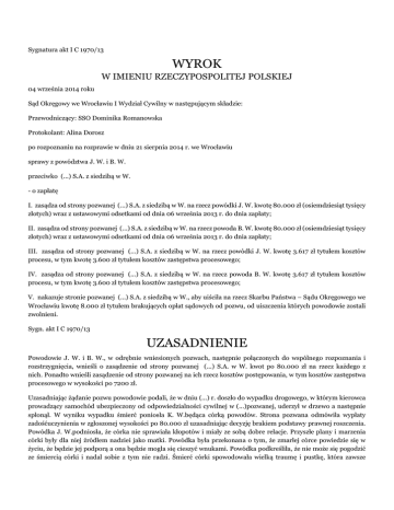 Sygnatura akt I C 1970/13 WYROK W IMIENIU RZECZYPOSPOLITEJ POLSKIEJ 04 września 2014 roku Sąd Okręgowy we Wrocławiu I Wydział Cywilny w następującym składzie: Przewodniczący: SSO Dominika Romanowska Protokolant: Alina Dorosz po rozpoznaniu na rozprawie w dniu 21 sierpnia 2014 r. we Wrocławiu sprawy z powództwa J. W. i B. W. przeciwko (...) S.A. z siedzibą w W. - o zapłatę I. zasądza od strony pozwanej (...) S.A. z siedzibą w W. na rzecz powódki J. W. kwotę 80.000 zł (osiemdziesiąt tysięcy złotych) wraz z ustawowymi odsetkami od dnia 06 września 2013 r. do dnia zapłaty; II. zasądza od strony pozwanej (...) S.A. z siedzibą w W. na rzecz powoda B. W. kwotę 80.000 zł (osiemdziesiąt tysięcy złotych) wraz z ustawowymi odsetkami od dnia 06 września 2013 r. do dnia zapłaty; III. zasądza od strony pozwanej (...) S.A. z siedzibą w W. na rzecz powódki J. W. kwotę 3.617 zł tytułem kosztów procesu, w tym kwotę 3.600 zł tytułem kosztów zastępstwa procesowego; IV. zasądza od strony pozwanej (...) S.A. z siedzibą w W. na rzecz powoda B. W. kwotę 3.617 zł tytułem kosztów procesu, w tym kwotę 3.600 zł tytułem kosztów zastępstwa procesowego; V. nakazuje stronie pozwanej (...) S.A. z siedzibą w W., aby uiściła na rzecz Skarbu Państwa – Sądu Okręgowego we Wrocławiu kwotę 8.000 zł tytułem brakujących opłat sądowych od pozwu, od uiszczenia których powodowie zostali zwolnieni. Sygn. akt I C 1970/13 UZASADNIENIE Powodowie J. W. i B. W., w odrębnie wniesionych pozwach, następnie połączonych do wspólnego rozpoznania i rozstrzygnięcia, wnieśli o zasądzenie od strony pozwanej (...) S.A. w W. kwot po 80.000 zł na rzecz każdego z nich. Ponadto wnieśli zasądzenie od strony pozwanej na ich rzecz kosztów postępowania, w tym kosztów zastępstwa procesowego w wysokości po 7200 zł. Uzasadniając żądanie pozwu powodowie podali, że w dniu (...) r. doszło do wypadku drogowego, w którym kierowca prowadzący samochód ubezpieczony od odpowiedzialności cywilnej w (...)pozwanej, uderzył w drzewo a następnie spłonął. W wyniku wypadku śmierć poniosła K. W.będąca córką powodów. Strona pozwana odmówiła wypłaty zadośćuczynienia w zgłoszonej wysokości po 80.000 zł uzasadniając decyzję brakiem podstawy prawnej roszczenia. Powódka J. W.podniosła, że córka nie sprawiała kłopotów i miały ze sobą dobre relacje. Przyszłe plany i marzenia córki były dla niej źródłem nadziei jako matki. Powódka była przekonana o tym, że zmarłej córce powiedzie się w życiu, że będzie jej podporą a ona będzie mogła się cieszyć wnukami. Powódka podkreśliła, że nie może się pogodzić ze śmiercią córki i nadal sobie z tym nie radzi. Śmierć córki spowodowała wielką traumę i pustkę, która zawsze będzie jej towarzyszyć. Powód B. W.podniósł, że od małego dbał i opiekował się córką. Obserwował rozwój córki i zmiany w jej życiu. Wskazał, że starał się być dla córki autorytetem i wsparciem, osobą, na którą zawsze mogła liczyć. Podkreślił, że poczucie straty wciąż mu towarzyszy i nie może się pogodzić ze śmiercią córki, która miała całe życie przed sobą. Pragnął widzieć córkę jako szczęśliwą żonę i matkę realizującą swoje marzenia. Uzasadniając wysokość żądanej kwoty powodowie podnieśli, że zadośćuczynienie ma w całości zrekompensować krzywdę wyrażającą się przede wszystkim w przedwczesnej utracie członka rodziny. Żądana kwota ma pomóc w przezwyciężaniu przykrych doznań oraz negatywnych doświadczeń obejmujących cierpienia psychiczne. W części prawnej uzasadnienia pozwu powodowie wskazali na linię orzeczniczą, zgodnie z którą spowodowanie śmierci osoby bliskiej może stanowić naruszenie dobra osobistego członków rodziny zmarłego w postaci szczególnej więzi rodzinnej i uzasadniać przyznanie im zadośćuczynienia na podstawie art. 448 k.c. w przypadku gdy śmierć nastąpiła na skutek deliktu przed dniem 3 sierpnia 2008 r. Zdaniem powodów odpowiedzialność ubezpieczyciela obejmuje także zadośćuczynienie oparte na podstawie art. 448 k.c. za krzywdę z tytułu naruszenia dóbr osobistych członków rodziny zmarłego w ramach zawartej umowy ubezpieczenia odpowiedzialności cywilnej. W odpowiedzi na pozew strona pozwana (...) S.A.w W.wniosła o oddalenie powództwa w całości i zasądzenie od powodów na jej rzecz kosztów zastępstwa procesowego. Przyznała, że w ramach umowy ubezpieczenia odpowiedzialności cywilnej posiadaczy pojazdów mechanicznych ponosi odpowiedzialność za skutki zdarzenia z dnia (...) r., w wyniku którego śmierć poniosła K. W.. Jednocześnie strona pozwana wskazała, że roszczenie powodów o zapłatę kwot po 80.000 zł jest bezzasadne. Podkreśliła, że zdarzenie miało miejsce przed wprowadzeniem przepisu art. 446 § 4 k.c., stanowiącego samoistną podstawę dochodzenia zadośćuczynienia po śmierci osoby bliskiej. Zdaniem strony pozwanej zakres odpowiedzialności ubezpieczyciela i sprawcy szkody wyrządzonej deliktem nie jest tożsamy. Odpowiedzialność zakładu ubezpieczeń określona jest w art. 34 ust. 1 ustawy o ubezpieczeniach obowiązkowych, Ubezpieczeniowym Funduszu Gwarancyjnym i Polskim Biurze Ubezpieczycieli Komunikacyjnych. Stanowi on katalog zamknięty a zatem nie obejmuje odpowiedzialności ubezpieczyciela za krzywdę wywołaną naruszeniem jakiegokolwiek innego dobra osobistego. Wskazała na orzeczenia sądów powszechnych wskazujących na konieczność nakierowania działania sprawcy wobec osoby, której dobro osobiste zostaje naruszone, zgodnie z art. 24 k.c. Jej zdaniem naruszenie dobra osobistego nie jest związane ze zdarzeniem w postaci czynu niedozwolonego, ale stanowi jego konsekwencję, co oznacza, że nie dochodzi wprost do naruszenia dobra osobistego członka najbliższej rodziny. Strona pozwana podniosła również zarzut przedawnienia, wskazując, że o