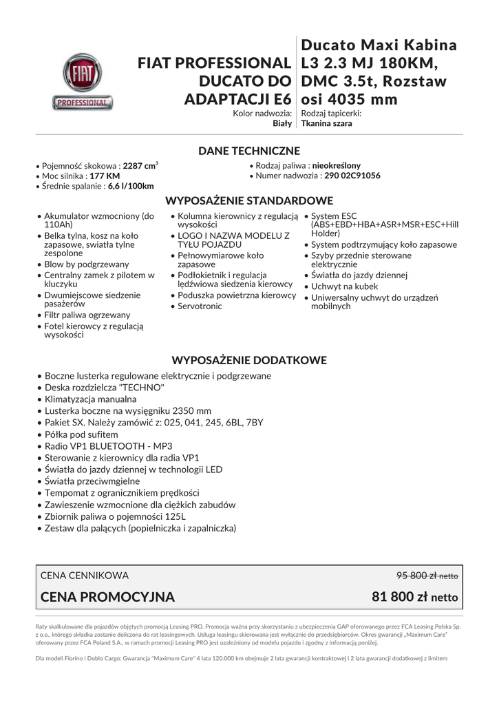 Ducato Maxi Kabina FIAT PROFESSIONAL L3 2.3 MJ 180KM, DUCATO DO DMC 3.5t, Rozstaw ADAPTACJI E6 osi 4035 mm Kolor nadwozia: Biały Rodzaj tapicerki: Tkanina szara DANE TECHNICZNE 3 • Rodzaj paliwa : nieokreślony • Numer nadwozia : 290 02C91056 • Pojemność skokowa : 2287 cm • Moc silnika : 177 KM • Średnie spalanie : 6,6 l/100km WYPOSAŻENIE STANDARDOWE • Akumulator wzmocniony (do 110Ah) • Belka tylna, kosz na koło zapasowe, swiatła tylne zespolone • Blow by podgrzewany • Centralny zamek z pilotem w kluczyku • Dwumiejscowe siedzenie pasażerów • Filtr paliwa ogrzewany • Fotel kierowcy z regulacją wysokości • Kolumna kierownicy z regulacją wysokości • LOGO I NAZWA MODELU Z TYŁU POJAZDU • Pełnowymiarowe koło zapasowe • Podłokietnik i regulacja lędźwiowa siedzenia kierowcy • Poduszka powietrzna kierowcy • Servotronic • System ESC (ABS+EBD+HBA+ASR+MSR+ESC+Hill Holder) • System podtrzymujący koło zapasowe • Szyby przednie sterowane elektrycznie • Światła do jazdy dziennej • Uchwyt na kubek • Uniwersalny uchwyt do urządzeń mobilnych WYPOSAŻENIE DODATKOWE • Boczne lusterka regulowane elektrycznie i podgrzewane • Deska rozdzielcza "TECHNO" • Klimatyzacja manualna • Lusterka boczne na wysięgniku 2350 mm • Pakiet SX. Należy zamówić z: 025, 041, 245, 6BL, 7BY • Półka pod sufitem • Radio VP1 BLUETOOTH - MP3 • Sterowanie z kierownicy dla radia VP1 • Światła do jazdy dziennej w technologii LED • Światła przeciwmgielne • Tempomat z ogranicznikiem prędkości • Zawieszenie wzmocnione dla ciężkich zabudów • Zbiornik paliwa o pojemności 125L • Zestaw dla palących (popielniczka i zapalniczka) CENA CENNIKOWA CENA PROMOCYJNA 95 800 zł netto 81 800 zł netto Raty skalkulowane dla pojazdów objętych promocją Leasing PRO. Promocja ważna przy skorzystaniu z ubezpieczenia GAP oferowanego przez FCA Leasing Polska Sp. z o.o., którego składka zostanie doliczona do rat leasingowych. Usługa leasingu skierowana jest wyłącznie do przedsiębiorców. Okres gwarancji „Maximum Care” oferowany przez FCA Poland S.A., w ramach promocji Leasing PRO jest uzależniony od modelu pojazdu i zgodny z informacją poniżej. Dla modeli Fiorino i Doblo Cargo: Gwarancja "Maximum Care" 4 lata 120.000 km obejmuje 2 lata gwarancji kontraktowej i 2 lata gwarancji dodatkowej z limitem przebiegu całkowitego 120.000 km. Dla modeli Talento i Ducato: Gwarancja "Maximum Care" 4 lata 160.000 km obejmuje 2 lata gwarancji kontraktowej i 2 lata gwarancji dodatkowej z limitem przebiegu całkowitego 160.000 km. Dla modelu Fullback: Gwarancja "Maximum Care" 5 lat 150.000 km obejmuje 3 lata gwarancji kontraktowej i 2 lata gwarancji dodatkowej z limitem przebiegu całkowitego 150.000 km. Oferta dotyczy samochodów z rocznika produkcji 2016. Ilość samochodów ograniczona. Niniejsze ogłoszenie jest wyłącznie informacją handlową i nie stanowi oferty w myśl art. 66, § 1. Kodeksu Cywilnego. Sprzedający nie odpowiada za ewentualne błędy lub nieaktualność ogłoszenia.
