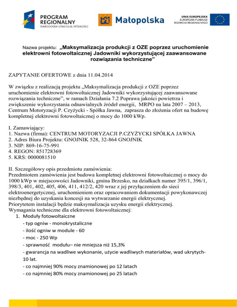Nazwa projektu: „Maksymalizacja produkcji z OZE poprzez uruchomienie elektrowni fotowoltaicznej Jadowniki wykorzystującej zaawansowane rozwiązania techniczne” ZAPYTANIE OFERTOWE z dnia 11.04.2014 W związku z realizacją projektu „Maksymalizacja produkcji z OZE poprzez uruchomienie elektrowni fotowoltaicznej Jadowniki wykorzystującej zaawansowane rozwiązania techniczne”, w ramach Działania 7.2 Poprawa jakości powietrza i zwiększenie wykorzystania odnawialnych źródeł energii, MRPO na lata 2007 – 2013, Centrum Motoryzacji P. Czyżycki - Spółka Jawna, zaprasza do złożenia ofert na budowę kompletnej elektrowni fotowoltaicznej o mocy do 1000 kWp. I. Zamawiający: 1. Nazwa (firma): CENTRUM MOTORYZACJI P.CZYŻYCKI SPÓŁKA JAWNA 2. Adres Biura Projektu: GNOJNIK 528, 32-864 GNOJNIK 3. NIP: 869-16-75-991 4. REGON: 851728369 5. KRS: 0000081510 II. Szczegółowy opis przedmiotu zamówienia: Przedmiotem zamówienia jest budowa kompletnej elektrowni fotowoltaicznej o mocy do 1000 kWp w miejscowości Jadowniki, gmina Brzesko, na działkach numer 395/1, 396/1, 398/3, 401, 402, 405, 406, 411, 412/2, 420 wraz z jej przyłączeniem do sieci elektroenergetycznej, uruchomieniem oraz opracowaniem dokumentacji powykonawczej niezbędnej do uzyskania koncesji na wytwarzanie energii elektrycznej. Priorytetem instalacji będzie maksymalizacja uzysku energii elektrycznej. Wymagania techniczne dla elektrowni fotowoltaicznej: 1. Moduły fotowoltaiczne - typ ogniw - monokrystaliczne - ilość ogniw w module - 60 - moc - 250 Wp - sprawność modułu– nie mniejsza niż 15,3% - gwarancja na wadliwe wykonanie, użycie wadliwych materiałów, wad ukrytych10 lat. - co najmniej 90% mocy znamionowej po 12 latach - co najmniej 80% mocy znamionowej po 25 latach - karta techniczna ogniwa niezbędnym załącznikiem do oferty 2. Konstrukcja nośna dla modułów PV - konstrukcja podążająca za słońcem(traker) w osi wschód-zachód - 1 blok trakerów poruszany za pomocą jednego silnika elektrycznego - co najmniej 40 modułów w rzędzie pojedynczego bloku trakerów - odległość między rzędami w bloku trakerów - 6 metrów - karta techniczna trakera niezbędnym załącznikiem do oferty 3. Stacja energetyczna - stacja zintegrowana – w jednym kontenerze: inwerter centralny, transformator, rozdzielnia energetyczna, układ pomiarowy, układ monitoringu instalacji elektrycznej. - inwerter centralny – budowa modułowa, minimum 3 elementy, zakres napięcia MPP 450-850 V, maksymalna sprawność nie mniejsza niż 98%. - transformator dostosowany do wymagań inwertera centralnego i wymagań sieci Operatora Systemu Dystrybucyjnego. - karta techniczna stacji, inwertera centralnego, transformatora niezbędnym załącznikiem do oferty 4. Instalacja po stronie prądu stałego DC - skrzynki do łączenia łańcuchów(String Conection Boxes) wyposażone w ochronę odgromową i przeciwprzepięciową, system monitoringu poszczególnych łańcuchów, - jednakowa ilość modułów PV we wszystkich łańcuchach(stringach) w instalacji, - okablowanie między modułami PV a String Conection Boxes przekrój 1x10 mm2, guma odporna na promieniowanie UV, niskie i wysokie temperatury. 5. Instalacja po stronie prądu zmiennego AC - instalacja zgodna z wymaganiami Operatora Systemu Dystrybucyjnego zawartymi w warunkach przyłączenia instalacji do sieci elektroenergetycznej. 6. Monitoring instalacji - monitoring on-line modułów połączonych w łańcuchy, - monitoring on-line String Conection Boxes, - monitoring on-line pracy inwerterów, - monitoring on-line pracy transformatora, - monitoring on-line pracy trakerów, - monitoring on-line odczytów z liczników energii elektrycznej, z możliwością odczytu wskazań liczników, - monitoring on-line terenu instalacji fotowoltaicznej za pomocą kamer z sygnalizacją alarmową na terenie instalacji fotowoltaicznej oraz z zapewnieniem powiadamiania o alarmach drogą elektroniczną. 7. Prace ziemne i inne - wykonanie ogrodzenia, - wykonanie dojazdów, - wykonanie dróg wewnątrz instalacji, - wykonanie niezbędnych prac dźwigowych, - wykonanie instalacji oświetleniowej. Wymagania odnośnie prac projektowych i nadzoru nad budową: - do oferty należy załączyć projekt koncepcyjny całości instalacji: konstrukcji nośnej na zadanej lokalizacji, projekt instalacji elektrycznej po stronie prądu stałego i zmiennego, projekt przesyłu danych z urządzeń, które wymagają monitoringu on-line z podaniem kosztów utrzymania przesyłu na etapie eksploatacji inwestycji, - przedstawiona koncepcja wykonania instalacji jako całości ma stanowić gwarancję, że całość instalacji będzie pracować z przyjętymi poziomami sprawności dla poszczególnych elementów, - zapewnienie nadzoru w trakcie budowy elektrowni fotowoltaicznej, - wykonanie i dostarczenie projektów powykonawczych instalacji, - Wypełnienie wniosku o uzyskanie koncesji na wytwarzanie energii elektrycznej i doradztwo w procesie uzyskania koncesji dla inwestora. Dodatkowe wymagania: - okres gwarancji min. 24 miesiące III. Kryterium wyboru oferty: Wybór najkorzystniejszej oferty zostanie dokonany w oparciu o negocjacje, przeprowadzone zgodnie z zachowaniem zasad przejrzystości, obiektywności i uczciwej konkurencji oraz przy dołożeniu wszelkich starań w celu uniknięcia konfliktu interesów. Kryteria brane pod uwagę przy ocenie ofert: Cena netto, okres prowadzenia działalności gospodarczej przez oferenta w branży odnawialnych źródeł energii, doświadczenie w branży odnawialnych źródeł energii, zaproponowane rozwiązania technologiczne IV. Termin realizacji zamówienia: - zgodnie z załącznikiem do niniejszego zapytania ofertowego V. Miejsce realizacji zamówienia: - miejscowość Jadowniki, gmina Brzesko, działki numer 395/1, 396/1, 398/3, 401, 402, 405, 406, 411, 412/2, 420. VI. Warunki płatności: do uzgodnienia na podstawie oferty VII. Sposób składania ofert: Ofertę należy skierować do Z