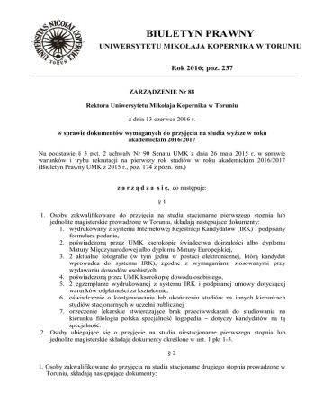 BIULETYN PRAWNY UNIWERSYTETU MIKOŁAJA KOPERNIKA W TORUNIU Rok 2016; poz. 237 ZARZĄDZENIE Nr 88 Rektora Uniwersytetu Mikołaja Kopernika w Toruniu z dnia 13 czerwca 2016 r. w sprawie dokumentów wymaganych do przyjęcia na studia wyższe w roku akademickim 2016/2017 Na podstawie § 5 pkt. 2 uchwały Nr 90 Senatu UMK z dnia 26 maja 2015 r. w sprawie warunków i trybu rekrutacji na pierwszy rok studiów w roku akademickim 2016/2017 (Biuletyn Prawny UMK z 2015 r., poz. 174 z późn. zm.) z a r z ą d z a s i ę, co następuje: §1 1. Osoby zakwalifikowane do przyjęcia na studia stacjonarne pierwszego stopnia lub jednolite magisterskie prowadzone w Toruniu, składają następujące dokumenty: 1. wydrukowany z systemu Internetowej Rejestracji Kandydatów (IRK) i podpisany formularz podania, 2. poświadczoną przez UMK kserokopię świadectwa dojrzałości albo dyplomu Matury Międzynarodowej albo dyplomu Matury Europejskiej, 3. 2 aktualne fotografie (w tym jedna w postaci elektronicznej, którą kandydat wprowadza do systemu IRK), zgodne z wymaganiami stosowanymi przy wydawaniu dowodów osobistych, 4. poświadczoną przez UMK kserokopię dowodu osobistego, 5. 2 egzemplarze wydrukowanej z systemu IRK i podpisanej umowy dotyczącej warunków odpłatności za kształcenie, 6. oświadczenie o kontynuowaniu lub ukończeniu studiów na innych kierunkach studiów stacjonarnych w uczelni publicznej, 7. orzeczenie lekarskie stwierdzające brak przeciwwskazań do studiowania na kierunku filologia polska specjalność logopedia dotyczy kandydatów na tą specjalność. 2. Osoby ubiegające się o przyjęcie na studia niestacjonarne pierwszego stopnia lub jednolite magisterskie składają dokumenty określone w ust. 1 pkt 1-5. §2 1. Osoby zakwalifikowane do przyjęcia na studia stacjonarne drugiego stopnia prowadzone w Toruniu, składają następujące dokumenty: 1. wydrukowany z systemu Internetowej Rejestracji Kandydatów (IRK) i podpisany formularz podania, 2. poświadczoną przez UMK kserokopię dyplomu ukończenia studiów wyższych, 3. poświadczoną przez UMK kserokopię suplementu do dyplomu lub zaświadczenie wydane przez uczelnię o ocenach uzyskanych w trakcie studiów jeżeli są wymagane w szczegółowych zasadach rekrutacji zgodnie z załącznikami do uchwały Nr 90 z dnia 26 maja 2015 r. w sprawie warunków i trybu rekrutacji na pierwszy rok studiów w roku akademickim 2016/2017 (z późn. zm.), 4. 2 aktualne fotografie (w tym jedna w postaci elektronicznej, którą kandydat wprowadza do systemu IRK), zgodne z wymaganiami stosowanymi przy wydawaniu dowodów osobistych, 5. poświadczoną przez UMK kserokopię dowodu osobistego, 6. 2 egzemplarze wydrukowanej z systemu IRK i podpisanej umowy dotyczącej warunków odpłatności za kształcenie, 7. oświadczenie o kontynuowaniu lub ukończeniu studiów na innych kierunkach studiów stacjonarnych w uczelni publicznej. 2. Osoby ubiegające się o przyjęcie na studia niestacjonarne drugiego stopnia składają dokumenty określone w ust. 1 pkt 1-6. §3 Osoby zakwalifikowane do przyjęcia na studia lub na listę rezerwową na kierunki prowadzone przez Collegium Medicum w Bydgoszczy składają następujące dokumenty: 1. wydrukowany z systemu Internetowej Rejestracji Kandydatów (IRK) i podpisany formularz podania, 2. poświadczoną przez UMK kserokopię świadectwa dojrzałości albo świadectwa dojrzałości i zaświadczenia o wynikach egzaminu maturalnego albo dyplomu Matury Międzynarodowej albo dyplomu Matury Europejskiej dotyczy studiów pierwszego stopnia i jednolitych magisterskich, 3. poświadczoną przez UMK kserokopię dyplomu ukończenia odpowiednich studiów wyższych dotyczy studiów drugiego stopnia, 4. poświadczoną przez UMK kserokopię suplementu do dyplomu lub zaświadczenie wydane przez uczelnię o ocenach uzyskanych w trakcie studiów jeżeli są wymagane w szczegółowych zasadach rekrutacji zgodnie z załącznikami do uchwały Nr 90 z dnia 26 maja 2015 r. w sprawie warunków i trybu rekrutacji na pierwszy rok studiów w roku akademickim 2016/2017 (z późn. zm.) dotyczy studiów drugiego stopnia, 5. 2 aktualne fotografie (w tym jedna w postaci elektronicznej, którą kandydat wprowadza do systemu IRK), zgodne z wymaganiami stosowanymi przy wydawaniu dowodów osobistych, 6. poświadczoną przez UMK kserokopię dowodu osobistego, 7. oświadczenie o kontynuowaniu lub ukończeniu studiów na innych kierunkach studiów stacjonarnych w uczelni publicznej dotyczy kandydatów na studia stacjonarne, 8. 2 egzemplarze wydrukowanej z systemu IRK i podpisanej umowy dotyczącej warunków odpłatności za kształcenie dotyczy kandydatów na studia niestacjonarne, 9. orzeczenie lekarskie stwierdzające brak przeciwwskazań do studiowania na wybranym kierunku wydane przez lekarza medycyny pracy nie dotyczy kandydatów na kierunki audiofonologia i zdrowie publiczne, 10. poświadczoną przez UMK kserokopię dyplomu ukończenia Liceum Medycznego lub Medycznego Studium Zawodowego w zawodzie: pielęgniarka lub położna dotyczy kandydatów na studia niestacjonarne pierwszego stopnia na kierunki pielęgniarstwo oraz położnictwo. 2 §4 Osoby zakwalifikowane do przyjęcia na studia lub na listę rezerwową na kierunki prowadzone w języku angielskim w Collegium Medicum składają następujące dokumenty: 1. wydrukowany z systemu Internetowej Rejestracji Kandydatów (IRK) i podpisany formularz podania, 2. zalegalizowany lub opatrzony apostille oryginał lub kopię świadectwa dojrzałości lub innego dokumentu uzyskanego za granicą uprawniającego do ubiegania się o przyjęcie na studia w uczelniach każdego typu w państwie, w którego systemie działa instytucja wydająca świadectwo, w języku polskim lub jego przysięgłe tłumaczenie na język polski lub język angielski w przypadku, gdy świadectwo zostało wydane w języku innym niż język polski lub język angielski, 3. poświadczoną przez UMK kserokopię świadectwa ukończenia szko