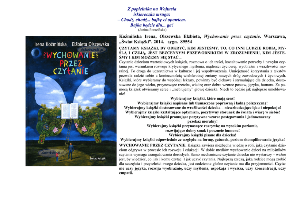 Z popielnika na Wojtusia iskiereczka mruga: – Chodź, chodź... bajkę ci opowiem. Bajka będzie dłu... ga! (Janina Porazińska) Koźmińska Irena, Olszewska Elżbieta, Wychowanie przez czytanie. Warszawa, „Świat Książki”, 2014. sygn. 89554 CZYTAMY KSIĄŻKI, BY ODKRYĆ, KIM JESTEŚMY. TO, CO INNI LUDZIE ROBIĄ, MYŚLĄ I CZUJĄ, JEST BEZCENNYM PRZEWODNIKIEM W ZROZUMIENIU, KIM JESTEŚMY I KIM MOŻEMY SIĘ STAĆ... Czytanie dzieciom wartościowych książek, rozmowa o ich treści, kształtowanie potrzeby i nawyku czytania jest warunkiem rozwoju krytycznego myślenia, mądrości życiowej, wyobraźni i wrażliwości moralnej. To droga do uczestnictwa w kulturze i jej współtworzenia. Umiejętność korzystania z tekstów pozwala radzić sobie z koniecznością wielokrotnej zmiany naszych dróg zawodowych i życiowych. Książki, które wybieramy do wspólnej lektury, powinny być ciekawe i stymulujące dla dziecka, dostosowane do jego wieku, przynoszące rzetelną wiedzę oraz dobre wzorce postaw, języka, humoru. Za pomocą książek otwieramy serce i „meblujemy” głowę dziecka. Niech to będzie jak najlepsze umeblowanie! Wybierajmy książki, które mają sens! Wybierajmy książki napisane lub tłumaczone poprawną i ładną polszczyzną! Wybierajmy książki dostosowane do wrażliwości dziecka – niewzbudzające lęku i niepokoju! Wybierajmy książki kształtujące optymizm, pozytywny stosunek do świata i wiarę w siebie! Wybierajmy książki promujące pozytywne wzorce postępowania i jednoznaczny przekaz moralny! Wybierajmy książki przynoszące rozrywkę na wysokim poziomie, rozwijające dobry smak i poczucie humoru! Wybierajmy książki pisane dla dziecka! Wybierajmy książki odpowiednie ze względu na formę, gatunek, poziom skomplikowania języka! WYCHOWANIE PRZEZ CZYTANIE. Książka zawiera niezbędną wiedzę o roli, jaką czytanie dzieciom odgrywa w procesie ich rozwoju i edukacji. W dobie mediów wychowanie dzieci na miłośników czytania wymaga zaangażowania dorosłych. Samo mechaniczne czytanie dziecku nie wystarczy – ważne jest, by wiedzieć, co, jak i komu czytać. I jak uczyć czytania. Najlepszą rzeczą, jaką rodzice mogą zrobić dla szczęścia i przyszłości swego dziecka, jest codzienne głośne czytanie mu dla przyjemności. Czytanie uczy języka, rozwija wyobraźnię, uczy myślenia, uspokaja i wycisza, uczy koncentracji, uczy empatii.