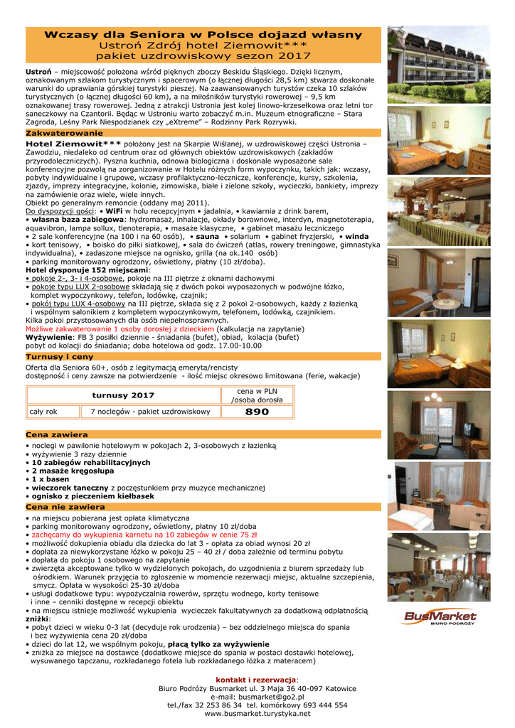 Wczasy dla Seniora w Polsce dojazd własny Ustroń Zdrój hotel Ziemowit*** pakiet uzdrowiskowy sezon 2017 Ustroń – miejscowość położona wśród pięknych zboczy Beskidu Śląskiego. Dzięki licznym, oznakowanym szlakom turystycznym i spacerowym (o łącznej długości 28,5 km) stwarza doskonałe warunki do uprawiania górskiej turystyki pieszej. Na zaawansowanych turystów czeka 10 szlaków turystycznych (o łącznej długości 60 km), a na miłośników turystyki rowerowej – 9,5 km oznakowanej trasy rowerowej. Jedną z atrakcji Ustronia jest kolej linowo-krzesełkowa oraz letni tor saneczkowy na Czantorii. Będąc w Ustroniu warto zobaczyć m.in. Muzeum etnograficzne – Stara Zagroda, Leśny Park Niespodzianek czy „eXtreme” – Rodzinny Park Rozrywki. Zakwaterowanie Hotel Ziemowit*** położony jest na Skarpie Wiślanej, w uzdrowiskowej części Ustronia – Zawodziu, niedaleko od centrum oraz od głównych obiektów uzdrowiskowych (zakładów przyrodoleczniczych). Pyszna kuchnia, odnowa biologiczna i doskonale wyposażone sale konferencyjne pozwolą na zorganizowanie w Hotelu różnych form wypoczynku, takich jak: wczasy, pobyty indywidualne i grupowe, wczasy profilaktyczno-lecznicze, konferencje, kursy, szkolenia, zjazdy, imprezy integracyjne, kolonie, zimowiska, białe i zielone szkoły, wycieczki, bankiety, imprezy na zamówienie oraz wiele, wiele innych. Obiekt po generalnym remoncie (oddany maj 2011). Do dyspozycji gości: • WiFi w holu recepcyjnym • jadalnia, • kawiarnia z drink barem, • własna baza zabiegowa: hydromasaż, inhalacje, okłady borownowe, interdyn, magnetoterapia, aquavibron, lampa sollux, tlenoterapia, • masaże klasyczne, • gabinet masażu leczniczego • 2 sale konferencyjne (na 100 i na 60 osób), • sauna • solarium • gabinet fryzjerski, • winda • kort tenisowy, • boisko do piłki siatkowej, • sala do ćwiczeń (atlas, rowery treningowe, gimnastyka indywidualna), • zadaszone miejsce na ognisko, grilla (na ok.140 osób) • parking monitorowany ogrodzony, oświetlony, płatny (10 zł/doba). Hotel dysponuje 152 miejscami: • pokoje 2-, 3- i 4-osobowe, pokoje na III piętrze z oknami dachowymi • pokoje typu LUX 2-osobowe składają się z dwóch pokoi wyposażonych w podwójne łóżko, komplet wypoczynkowy, telefon, lodówkę, czajnik; • pokój typu LUX 4-osobowy na III piętrze, składa się z 2 pokoi 2-osobowych, każdy z łazienką i wspólnym salonikiem z kompletem wypoczynkowym, telefonem, lodówką, czajnikiem. Kilka pokoi przystosowanych dla osób niepełnosprawnych. Możliwe zakwaterowanie 1 osoby dorosłej z dzieckiem (kalkulacja na zapytanie) Wyżywienie: FB 3 posiłki dziennie - śniadania (bufet), obiad, kolacja (bufet) pobyt od kolacji do śniadania; doba hotelowa od godz. 17.00-10.00 Turnusy i ceny Oferta dla Seniora 60+, osób z legitymacją emeryta/rencisty dostępność i ceny zawsze na potwierdzenie - ilość miejsc okresowo limitowana (ferie, wakacje) cena w PLN /osoba dorosła turnusy 2017 cały rok 7 noclegów - pakiet uzdrowiskowy 890 a Cena zawiera • • • • • • • noclegi w pawilonie hotelowym w pokojach 2, 3-osobowych z łazienką wyżywienie 3 razy dziennie 10 zabiegów rehabilitacyjnych 2 masaże kręgosłupa 1 x basen wieczorek taneczny z poczęstunkiem przy muzyce mechanicznej ognisko z pieczeniem kiełbasek Cena nie zawiera • • • • • • • na miejscu pobierana jest opłata klimatyczna parking monitorowany ogrodzony, oświetlony, płatny 10 zł/doba zachęcamy do wykupienia karnetu na 10 zabiegów w cenie 75 zł możliwość dokupienia obiadu dla dziecka do lat 3 - opłata za obiad wynosi 20 zł dopłata za niewykorzystane łóżko w pokoju 25 – 40 zł / doba zależnie od terminu pobytu dopłata do pokoju 1 osobowego na zapytanie zwierzęta akceptowane tylko w wydzielonych pokojach, do uzgodnienia z biurem sprzedaży lub ośrodkiem. Warunek przyjęcia to zgłoszenie w momencie rezerwacji miejsc, aktualne szczepienia, smycz. Opłata w wysokości 25-30 zł/doba • usługi dodatkowe typu: wypożyczalnia rowerów, sprzętu wodnego, korty tenisowe i inne – cenniki dostępne w recepcji obiektu • na miejscu istnieje możliwość wykupienia wycieczek fakultatywnych za dodatkową odpłatnością zniżki: • pobyt dzieci w wieku 0-3 lat (decyduje rok urodzenia) – bez oddzielnego miejsca do spania i bez wyżywienia cena 20 zł/doba • dzieci do lat 12, we wspólnym pokoju, płacą tylko za wyżywienie • zniżka za miejsce na dostawce (dodatkowe miejsce do spania w postaci dostawki hotelowej, wysuwanego tapczanu, rozkładanego fotela lub rozkładanego łóżka z materacem) kontakt i rezerwacja: Biuro Podróży Busmarket ul. 3 Maja 36 40-097 Katowice e-mail: [email protected] tel./fax 32 253 86 34 tel. komórkowy 693 444 554 www.busmarket.turystyka.net lub wspólnym spaniu (dodatkowa osoba w pokoju korzystająca wspólnie z inną osobą z podstawowego miejsca noclegowego) na zapytanie • dla gości hotelu zniżki na karnet narciarski SN Cieńków w Wiśle Uwagi warunki uczestnictwa w turnusie dla Seniora: • warunkiem skorzystania z ceny promocyjnej jest posiadanie legitymacji emeryta - rencisty • z osobą uprawnioną z pobytu może skorzystać 1 osoba towarzysząca (dorosła bez ograniczeń wiekowych) • istnieje możliwość zabrania wnuków 0-12 lat na wakacje • zaliczka 20% ceny informacje dodatkowe: • dostawka – dodatkowe miejsce do spania w postaci: dostawki hotelowej, wysuwanego tapczanu, rozkładanego fotela, rozkładanego łóżka z materacem • wspólne spanie – dodatkowa osoba w pokoju, korzystająca wspólnie z inną osobą z podstawowego miejsca noclegowego (wersalka, łóżko małżeńskie 140 cm, kanapa i sofa rozkładana) • prezentowane w ofercie zdjęcia pokoi są zdjęciami przykładowymi. Oznacza to, że nie każdy pokój w ośrodku wygląda identycznie jak prezentowany na zdjęciu • w ośrodkach mogą przebywać grupy młodzie