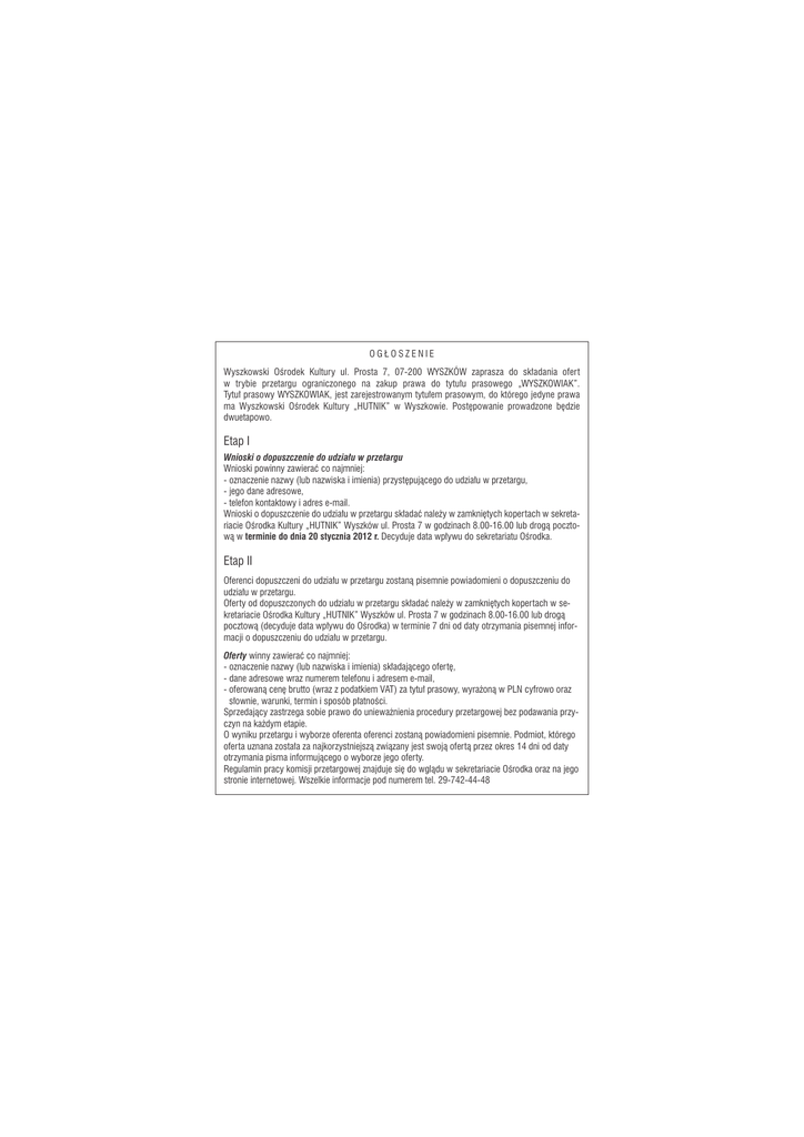 OGŁOSZENIE Wyszkowski Ośrodek Kultury ul. Prosta 7, 07-200 WYSZKÓW zaprasza do składania ofert w trybie przetargu ograniczonego na zakup prawa do tytułu prasowego „WYSZKOWIAK”. Tytuł prasowy WYSZKOWIAK, jest zarejestrowanym tytułem prasowym, do którego jedyne prawa ma Wyszkowski Ośrodek Kultury „HUTNIK” w Wyszkowie. Postępowanie prowadzone będzie dwuetapowo. Etap I Wnioski o dopuszczenie do udziału w przetargu Wnioski powinny zawierać co najmniej: - oznaczenie nazwy (lub nazwiska i imienia) przystępującego do udziału w przetargu, - jego dane adresowe, - telefon kontaktowy i adres e-mail. Wnioski o dopuszczenie do udziału w przetargu składać należy w zamkniętych koper tach w sekretariacie Ośrodka Kultury „HUTNIK” Wyszków ul. Prosta 7 w godzinach 8.00-16.00 lub drogą pocztową w terminie do dnia 20 stycznia 2012 r. Decyduje data wpływu do sekretariatu Ośrodka. Etap II Oferenci dopuszczeni do udziału w przetargu zostaną pisemnie powiadomieni o dopuszczeniu do udziału w przetargu. Ofer ty od dopuszczonych do udziału w przetargu składać należy w zamkniętych koper tach w sekretariacie Ośrodka Kultury „HUTNIK” Wyszków ul. Prosta 7 w godzinach 8.00-16.00 lub drogą pocztową (decyduje data wpływu do Ośrodka) w terminie 7 dni od daty otrzymania pisemnej informacji o dopuszczeniu do udziału w przetargu. Oferty winny zawierać co najmniej: - oznaczenie nazwy (lub nazwiska i imienia) składającego ofer tę, - dane adresowe wraz numerem telefonu i adresem e-mail, - oferowaną cenę brutto (wraz z podatkiem VAT) za tytuł prasowy, wyrażoną w PLN cyfrowo oraz słownie, warunki, termin i sposób płatności. Sprzedający zastrzega sobie prawo do unieważnienia procedury przetargowej bez podawania przyczyn na każdym etapie. O wyniku przetargu i wyborze oferenta oferenci zostaną powiadomieni pisemnie. Podmiot, którego ofer ta uznana została za najkorzystniejszą związany jest swoją ofer tą przez okres 14 dni od daty otrzymania pisma informującego o wyborze jego ofer ty. Regulamin pracy komisji przetargowej znajduje się do wglądu w sekretariacie Ośrodka oraz na jego stronie internetowej. Wszelkie informacje pod numerem tel. 29-742-44-48