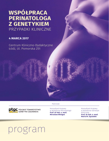 WSPÓŁPRACA PERINATOLOGA Z GENETYKIEM PRZYPADKI KLINICZNE 4 MARCA 2017 Centrum Kliniczno-Dydaktyczne Łódź, Ul. Pomorska 251 Patronat: Konsultant Krajowy w dziedzinie Perinatologii Prof. dr hab. n. med. Mirosław Wielgoś program Konsultant Krajowy w dziedzinie Genetyki Klinicznej Prof. dr hab. n. med. Maria M. Sąsiadek WSPÓŁPRACA PERINATOLOGA Z GENETYKIEM PRZYPADKI KLINICZNE 4 MARCA 2017 Centrum Kliniczno-Dydaktyczne, Łódź program 9.00 – 9.05 Powitanie gości 9.05 – 9.30 Zasady udzielania konsultacji genetycznej pod kątem diagnostyki prenatalnej prof. Maria Sąsiadek 9.30 – 10.00 Genetyka kliniczna – odświeżenie wiedzy dr Hanna Moczulska 10.00 – 10.30 Prenatalna diagnostyka nieinwazyjna – ultrasonografia, test podwójny, test NIPT prof. Piotr Sieroszewski 10.30 – 11.00 Dysmorfologia płodu dr Lech Dudarewicz 11.00 – 11.30 Przerwa kawowa 11.30 – 14.30 Wskazania do diagnostyki inwazyjnej i ukierunkowanie prenatalnej diagnostyki genetycznej – przypadki kliniczne (perinatolog/genetyk kliniczny/diagnosta) 11.30 – 12.15 Najczęstsze aneuploidie ( ocena kariotypu płodu) prof. Piotr Sieroszewski/dr Hanna Moczulska/mgr Beata Skoczylas 12.15 – 13.00 Zespół DiGeorgea (del22q11.2) – diagnostyka przy pomocy techniki FISH prof. Piotr Sieroszewski/dr Hanna Moczulska/dr Maria Constantinou 13.00 – 13.45 Wady rozwojowe u płodu – diagnostyka z wykorzystaniem macierzy CGH (metoda aCGH) prof. Piotr Sieroszewski/dr Hanna Moczulska/dr Maria Constantinou 13.45 – 14.30 Wady rozwojowe u płodu – diagnostyka molekularna prof. Piotr Sieroszewski/dr Hanna Moczulska/dr Michał Pietrusiński 14.30 – 15.00 Przerwa obiadowa 2 /3 WSPÓŁPRACA PERINATOLOGA Z GENETYKIEM PRZYPADKI KLINICZNE 4 MARCA 2017 Centrum Kliniczno-Dydaktyczne, Łódź 15.00 – 15.30 Techniki MLPA, BoBs, QF-PCR prof. Maciej Borowiec 15.30 – 16.00 Diagnostyka preimplantacyjna dr Agnieszka Gach 16.00 – 16.30 Aspekty etyczne w diagnostyce prenatalnej prof. Lucjusz Jakubowski 16.30 -17.00 Przerwa kawowa 17.00 – 17.30 Rola hospicjum perinatalnego dr Aleksandra Korzeniewska-Eksterowicz 17.30 – 18.00 Wsparcie psychologiczne w przypadku stwierdzenia nieprawidłowości rozwojowych u płodu dr Bogna Kędzierska 18.00 – 18.10 Pytania i odpowiedzi 18.10 Zakończenie konferencji 3 /3