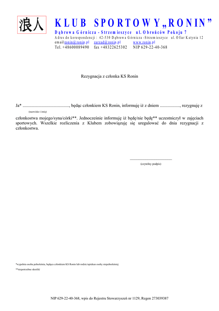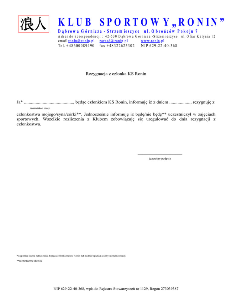 K L U B S P O R T O W Y „R O N IN ” D ą b r o w a G ó r n ic z a - S t r z e m ie s z y c e u l . O b r o ń c ó w P o k o j u 7 A d r e s d o k o r e s p o n d e n c ji : 4 2 - 5 3 0 D ą b r o w a G ó r n ic z a - S tr z e m i e s z y c e u l. O f ia r K a ty n ia 1 2 em ail ro : n in @ ron in .p l zarzad @ ron in .p l w w w.ro n in .p l Tel. + 4 8 6 00 08 94 90 fax + 48 32 262 53 02 N IP 6 29-22-4 0-3 6 8 Rezygnacja z członka KS Ronin Ja* .........................................., będąc członkiem KS Ronin, informuję iż z dniem .................., rezygnuję z (nazwisko i imię) członkostwa mojego/syna/córki**. Jednocześnie informuję iż będę/nie będę** uczestniczył w zajęciach sportowych. Wszelkie rozliczenia z Klubem zobowiązuję się uregulować do dnia rezygnacji z członkostwa. ___________________ (czytelny podpis) *wypełnia osoba pełnoletnia, będąca członkiem KS Ronin lub rodzic/opiekun osoby niepełnoletniej **niepotrzebne skreślić NIP 629-22-40-368, wpis do Rejestru Stowarzyszeń nr 1129, Regon 273039387