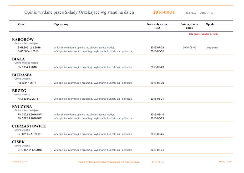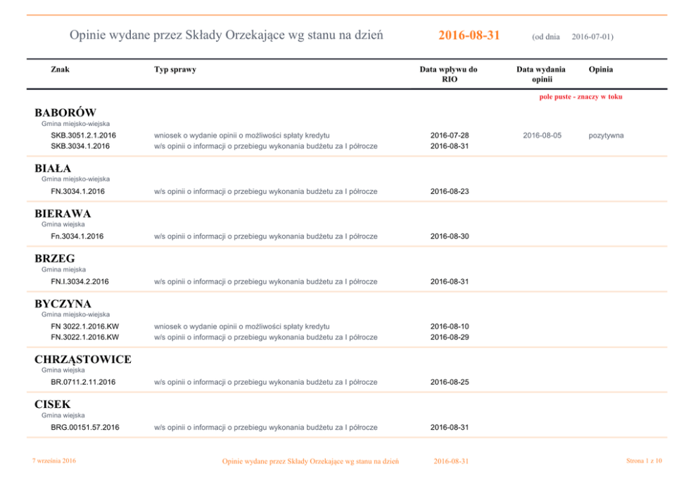 Opinie wydane przez Składy Orzekające wg stanu na dzień Znak 2016-08-31 Data wpływu do RIO Typ sprawy (od dnia Data wydania opinii 2016-07-01) Opinia pole puste - znaczy w toku BABORÓW Gmina miejsko-wiejska SKB.3051.2.1.2016 SKB.3034.1.2016 wniosek o wydanie opinii o możliwości spłaty kredytu w/s opinii o informacji o przebiegu wykonania budżetu za I półrocze 2016-07-28 2016-08-31 w/s opinii o informacji o przebiegu wykonania budżetu za I półrocze 2016-08-23 brak w/s opinii o informacji o przebiegu wykonania budżetu za I półrocze 2016-08-30 brak w/s opinii o informacji o przebiegu wykonania budżetu za I półrocze 2016-08-31 brak wniosek o wydanie opinii o możliwości spłaty kredytu w/s opinii o informacji o przebiegu wykonania budżetu za I półrocze 2016-08-10 2016-08-29 brak w/s opinii o informacji o przebiegu wykonania budżetu za I półrocze 2016-08-25 brak w/s opinii o informacji o przebiegu wykonania budżetu za I półrocze 2016-08-31 brak 2016-08-05 pozytywna brak BIAŁA Gmina miejsko-wiejska FN.3034.1.2016 BIERAWA Gmina wiejska Fn.3034.1.2016 BRZEG Gmina miejska FN.I.3034.2.2016 BYCZYNA Gmina miejsko-wiejska FN 3022.1.2016.KW FN.3022.1.2016.KW CHRZĄSTOWICE Gmina wiejska BR.0711.2.11.2016 CISEK Gmina wiejska BRG.00151.57.2016 7 września 2016 Opinie wydane przez Składy Orzekające wg stanu na dzień 2016-08-31 Strona 1 z 10 Znak Data wpływu do RIO Typ sprawy Data wydania opinii Opinia pole puste - znaczy w toku DĄBROWA Gmina wiejska SG.3035.2.20136 w/s opinii o informacji o przebiegu wykonania budżetu za I półrocze 2016-08-10 w/s opinii o informacji o przebiegu wykonania budżetu za I półrocze 2016-08-31 wniosek o wydanie opinii o możliwości spłaty pożyczki w/s opinii o informacji o przebiegu wykonania budżetu za I półrocze 2016-07-12 2016-08-23 w/s opinii o informacji o przebiegu wykonania budżetu za I półrocze 2016-08-31 brak w/s opinii o informacji o przebiegu wykonania budżetu za I półrocze 2016-08-31 brak w/s opinii o informacji o przebiegu wykonania budżetu za I półrocze 2016-08-17 w/s opinii o informacji o przebiegu wykonania budżetu za I półrocze 2016-08-30 brak w/s opinii o informacji o przebiegu wykonania budżetu za I półrocze 2016-08-17 brak 2016-08-18 pozytywna DOMASZOWICE Gmina wiejska FN.3021.32.2016 brak GŁOGÓWEK Gmina miejsko-wiejska Fn.32.RFB.35.2016.IH l.DZ.Fn.32.RFB.48.2016.IH 2016-08-11 2016-08-26 pozytywna pozytywna głubczycki Powiat FN.3221.57.2016.BS GOGOLIN Gmina miejsko-wiejska WF.3035.5.2016 GRODKÓW Gmina miejsko-wiejska FN.3034.4.2016.FZ 2016-08-24 pozytywna IZBICKO Gmina wiejska Fn.I.3022.2.2016 KAMIENNIK Gmina wiejska FN-S.3034.1.PR.2016.KŻ 7 września 2016 Opinie wydane przez Składy Orzekające wg stanu na dzień 2016-08-31 Strona 2 z 10 Znak Data wpływu do RIO Typ sprawy Data wydania opinii Opinia pole puste - znaczy w toku KĘDZIERZYN-KOŹLE Gmina miejska Or.0711.39.2016 w/s opinii o informacji o przebiegu wykonania budżetu za I półrocze 2016-08-31 w/s opinii o informacji o przebiegu wykonania budżetu za I półrocze 2016-08-05 w/s opinii o informacji o przebiegu wykonania budżetu za I półrocze 2016-08-30 brak w/s opinii o informacji o przebiegu wykonania budżetu za I półrocze 2016-08-31 brak w/s opinii o informacji o przebiegu wykonania budżetu za I półrocze 2016-08-23 w/s opinii o informacji o przebiegu wykonania budżetu za I półrocze 2016-08-30 brak w/s opinii o informacji o przebiegu wykonania budżetu za I półrocze 2016-08-31 brak w/s opinii o informacji o przebiegu wykonania budżetu za I półrocze 2016-08-10 brak brak kędzierzyńsko-kozielski Powiat FN.3040.71.2016.AM KIETRZ Gmina miejsko-wiejska WFP.3035.2.2016 KLUCZBORK Gmina miejsko-wiejska FN.3034.5.2016.ML kluczborski Powiat - 2016-08-31 pozytywna KOLONOWSKIE Gmina miejsko-wiejska - KOMPRACHCICE Gmina wiejska - KORFANTÓW Gmina miejsko-wiejska FIN.I.3034.2.2016.JSz 7 września 2016 Opinie wydane przez Składy Orzekające wg stanu na dzień 2016-08-31 Strona 3 z 10 Znak Data wpływu do RIO Typ sprawy Data wydania opinii Opinia pole puste - znaczy w toku KRAPKOWICE Gmina miejsko-wiejska - w/s opinii o informacji o przebiegu wykonania budżetu za I półrocze 2016-08-31 wniosek o wydanie opinii o możliwości spłaty pożyczki 2016-07-20 w/s opinii o informacji o przebiegu wykonania budżetu za I półrocze 2016-08-17 brak w/s opinii o informacji o przebiegu wykonania budżetu za I półrocze 2016-08-26 brak w/s opinii o informacji o przebiegu wykonania budżetu za I półrocze 2016-08-31 brak w/s opinii o informacji o przebiegu wykonania budżetu za I półrocze 2016-08-31 brak w/s opinii o informacji o przebiegu wykonania budżetu za I półrocze 2016-08-26 brak w/s opinii o informacji o przebiegu wykonania budżetu za I półrocze 2016-08-25 brak brak krapkowicki Powiat Fn.3032.1.18.2016.JK 2016-07-25 pozytywna LASOWICE WIELKIE Gmina wiejska WG.0711.35.2016 LEŚNICA Gmina miejsko-wiejska FN.3034.1.2016 LEWIN BRZESKI Gmina miejsko-wiejska FN.II.3030.2.2016 LUBRZA Gmina wiejska - LUBSZA Gmina wiejska FN.3034.1.2016 ŁAMBINOWICE Gmina wiejska os.0050/117/2016 7 września 2016 Opinie wydane przez Składy Orzekające wg stanu na dzień 2016-08-31 Strona 4 z 10 Znak Data wpływu do RIO Typ sprawy Data wydania opinii Opinia pole puste - znaczy w toku ŁUBNIANY Gmina wiejska - w/s opinii o informacji o przebiegu wykonania budżetu za I półrocze 2016-08-26 brak w/s opinii o informacji o przebiegu wykonania budżetu za I półrocze 2016-08-30 brak w/s opinii o informacji o przebiegu wykonania budżetu za I półrocze 2016-08-31 brak w/s opinii o informacji o przebiegu wykonania budżetu za I półrocze 2016-08-11 brak w/s opinii o informacji o przebiegu wykonania budżetu za I półrocze 2016-08-30 brak wniosek o wydanie opinii o możliwości spłaty kredytu 2016-08-04 2016-08-31 pozytywna w/s opinii o informacji o przebiegu wykonania budżetu za I półrocze 2016-08-17 2016-08-31 pozytywna w/s opinii o informacji 