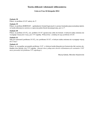Teoria obliczeń i złożoność obliczeniowa Lista nr 8 na 26 listopada 2014 Zadanie 38 Pokaż, że problem 2SAT należy do P . Zadanie 39 Pokaż, że problem HORNSAT – spełnialności formuł logicznych w postaci koniunkcyjnej normalnej takich, że każda alternatywa zawiera co najwyżej jeden literał niezanegowany, jest w P . Zadanie 40 Pokaż, że problem 3SAT3 , tzn. problem 3SAT ograniczony tylko do formuł, w których żadna zmienna nie wyst˛epuje wi˛ecej niż 3 razy, jest N P -zupełny. Wskazówka: zredukuj do tego problemu 3SAT . Zadanie 41 Jaka jest złożoność problemu 3SAT2 , tzn. problemu 3SAT , w którym żadna zmienna nie wyst˛epuje wi˛ecej niż 2 razy? Zadanie 42 Pokaż, że szczególny przypadek problemu SAT , w którym każda klauzula jest hornowska lub zawiera dokładnie dwa literały, jest N P -zupełny. (Innymi słowy połaczenie ˛ dwóch wielomianowych wariantów SAT może prowadzić do problemu N P -zupełnego.) Maciej G˛ebala, Mirosław Kutyłowski